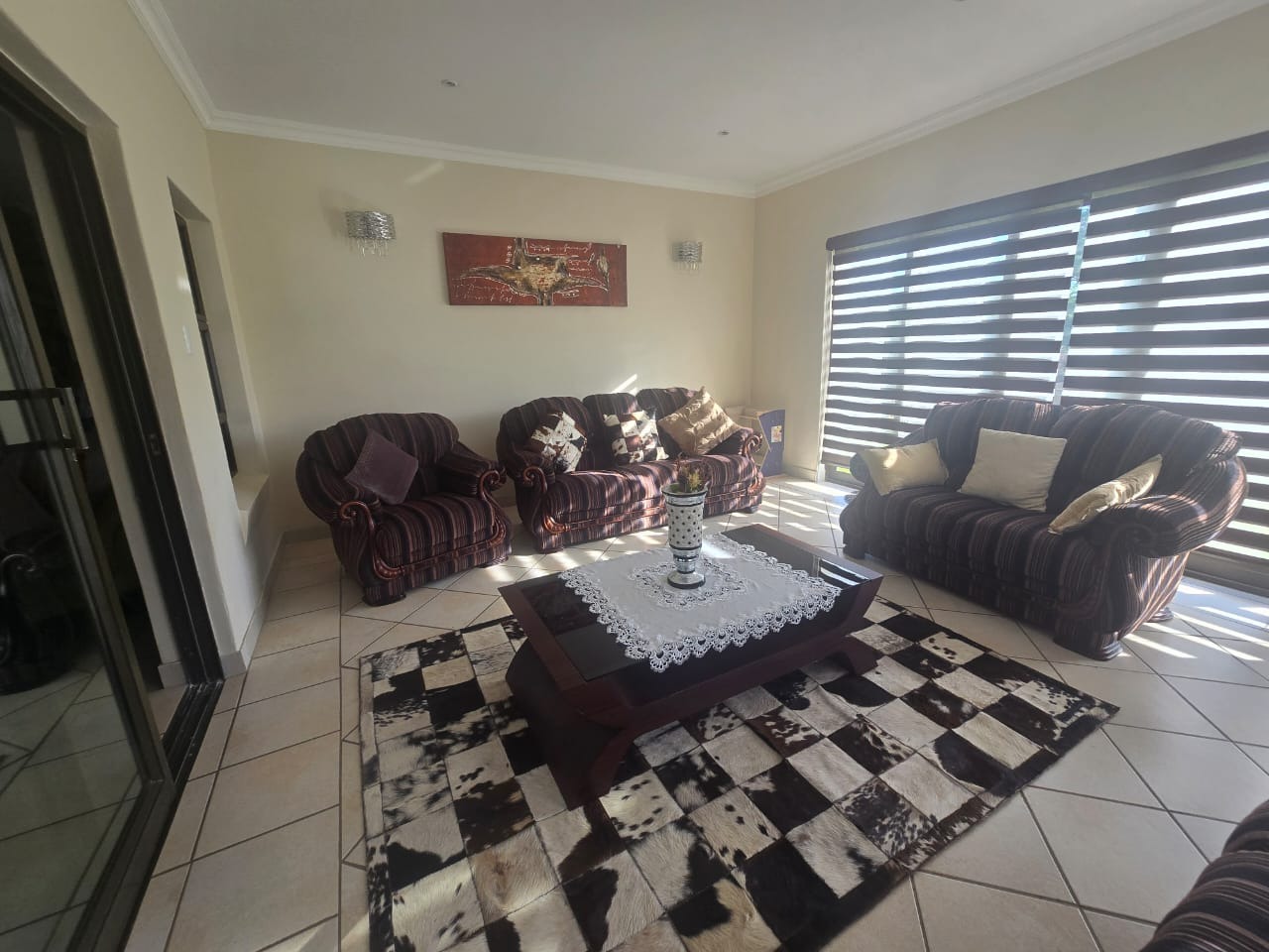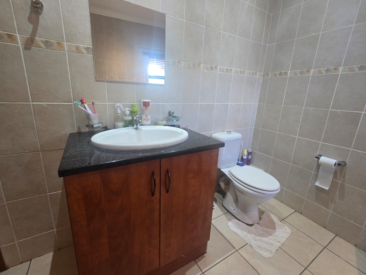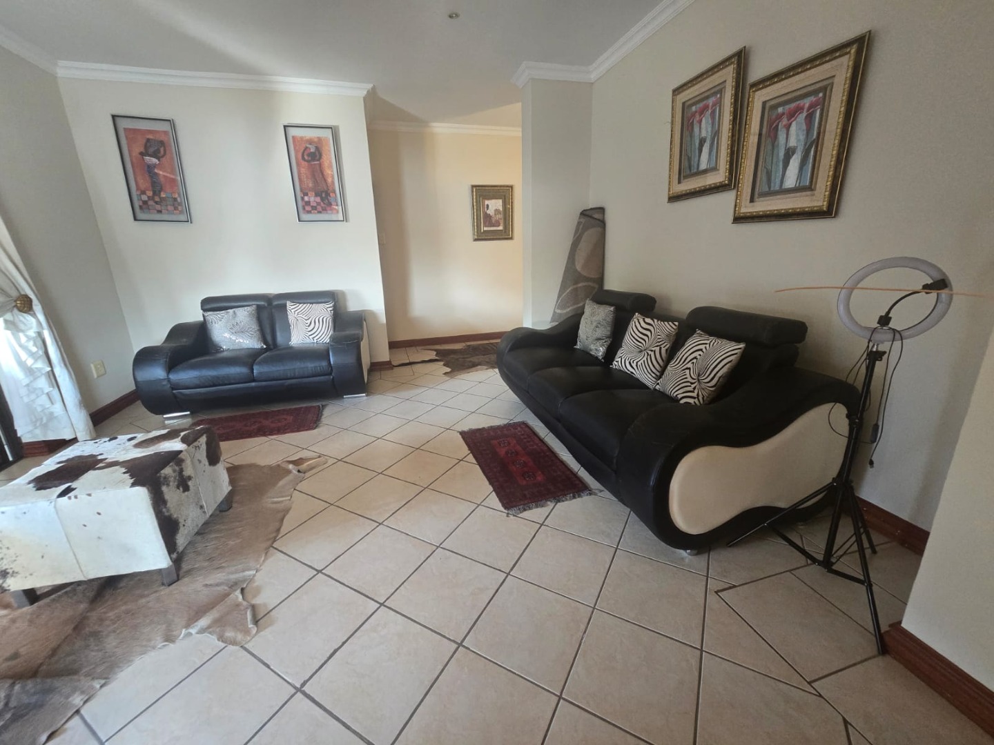 The property welcomes you with open-plan living and dining areas that flow effortlessly, creating a warm atmosphere. A separate lounge offers a peaceful space for relaxation or hosting guests. The kitchen features ample cupboards and a separate scullery, designed for ease and functionality.