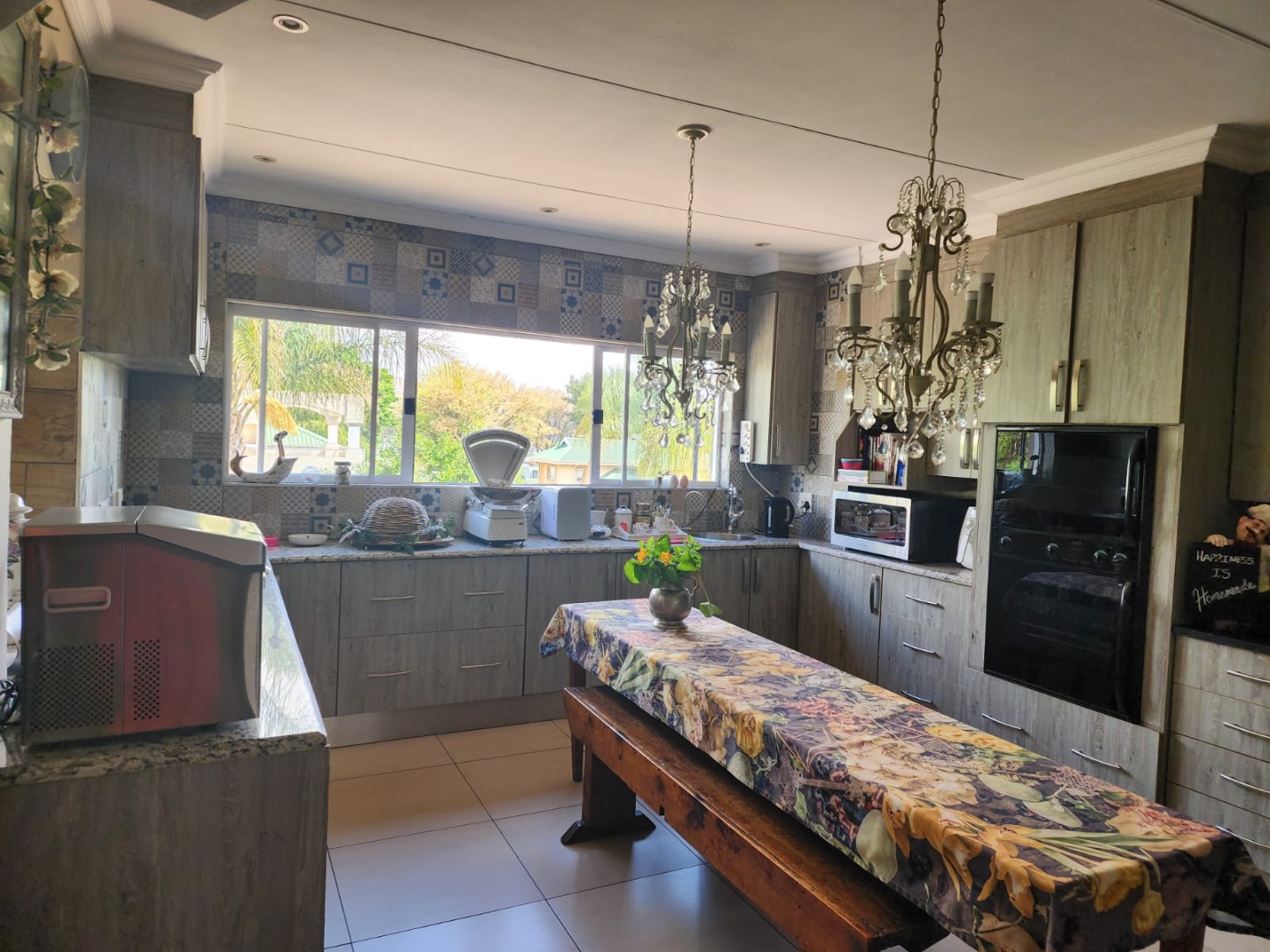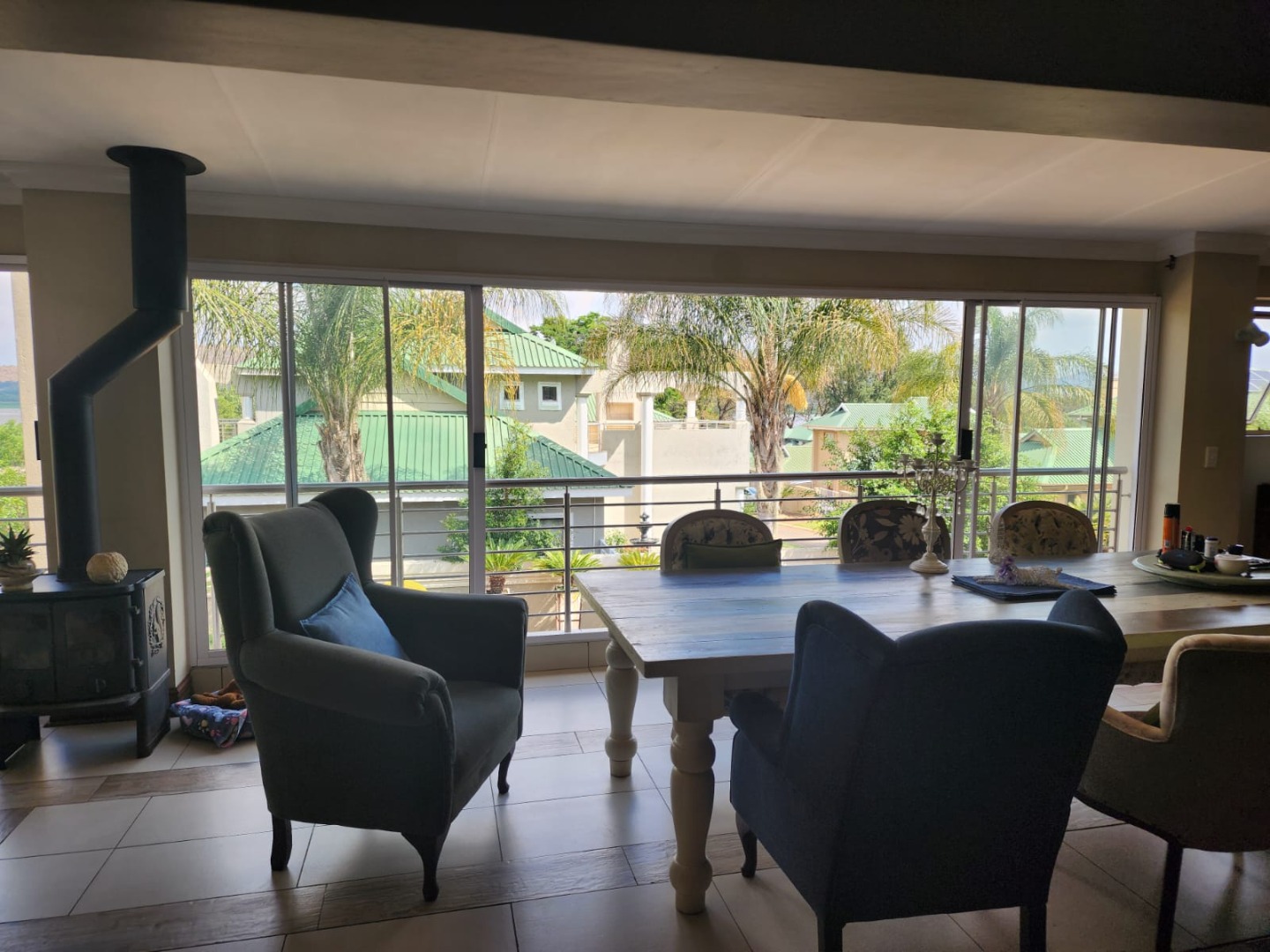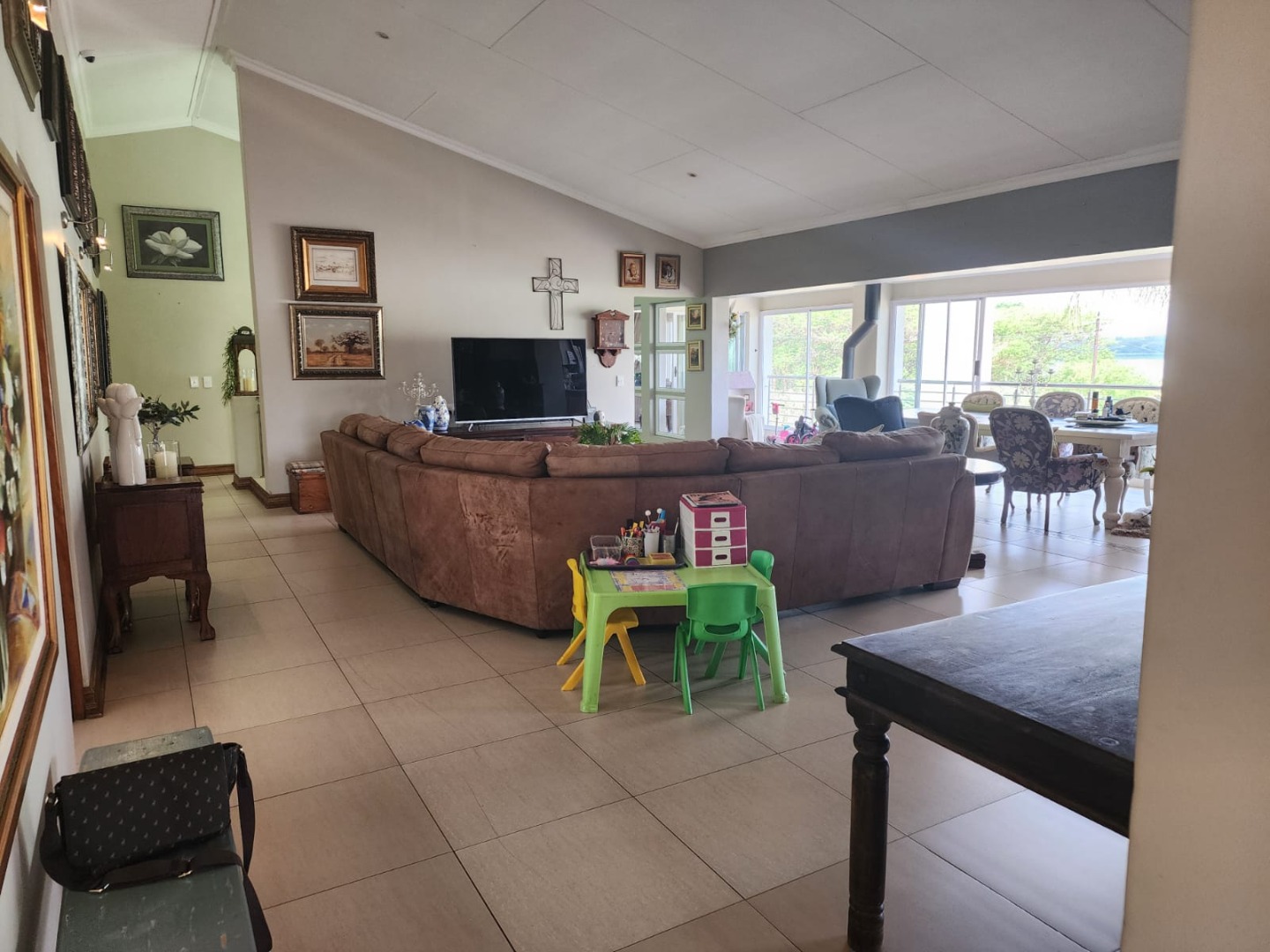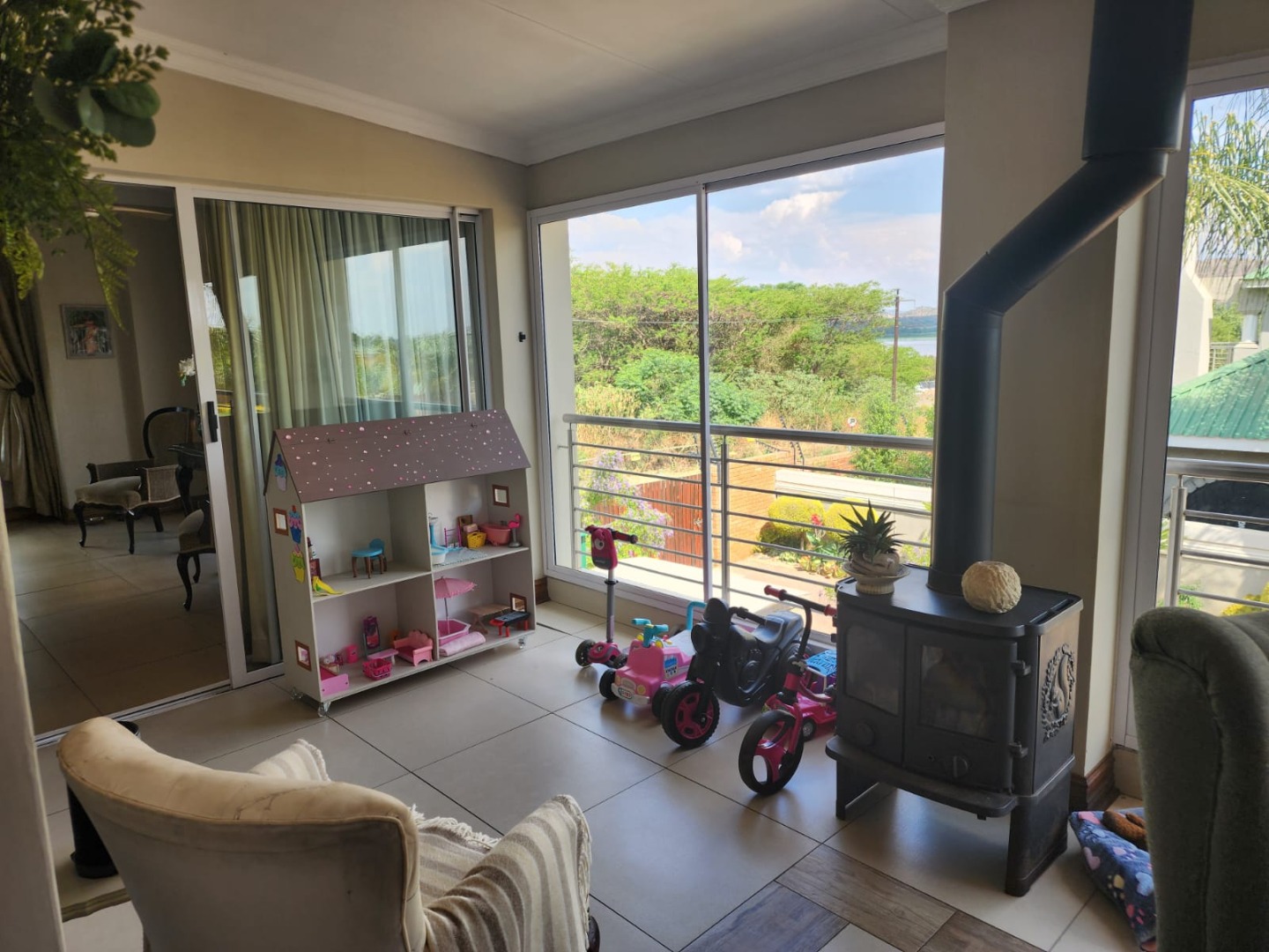 The open-plan lounge, kitchen, and dining area boasts double-volume ceilings, creating an impressive sense of space and grandeur. Large sliding windows open wide to welcome in fresh air and natural light, enhancing the seamless indoor-outdoor living experience. Both the lounge and kitchen enjoy beautiful dam views, adding a tranquil touch to everyday living.