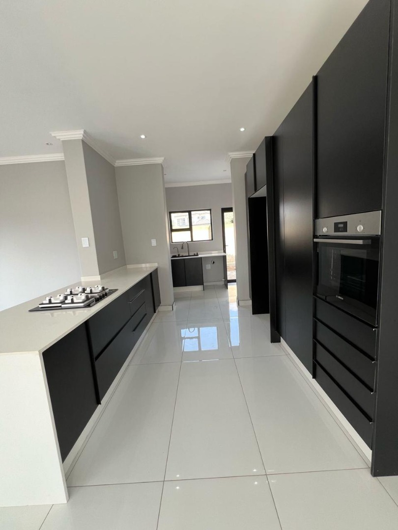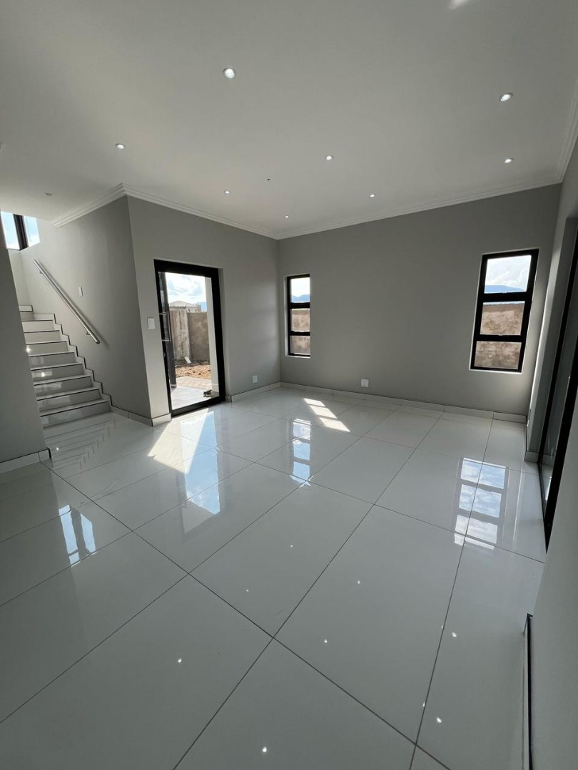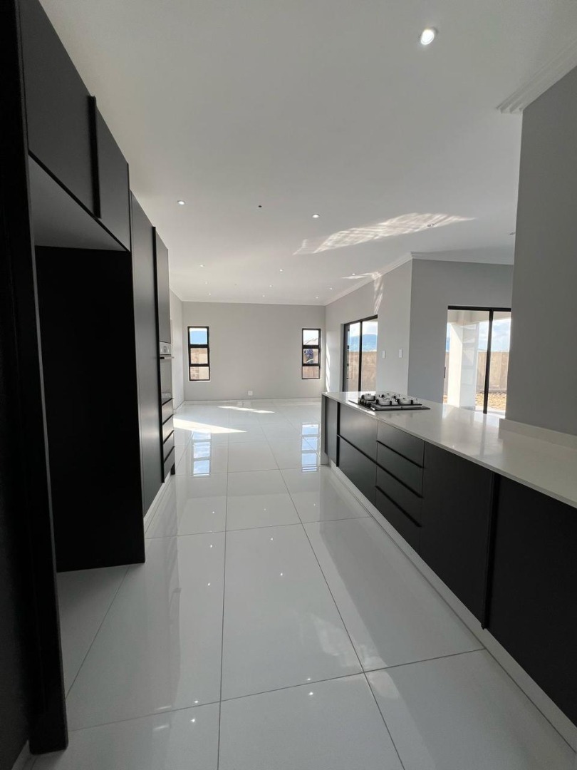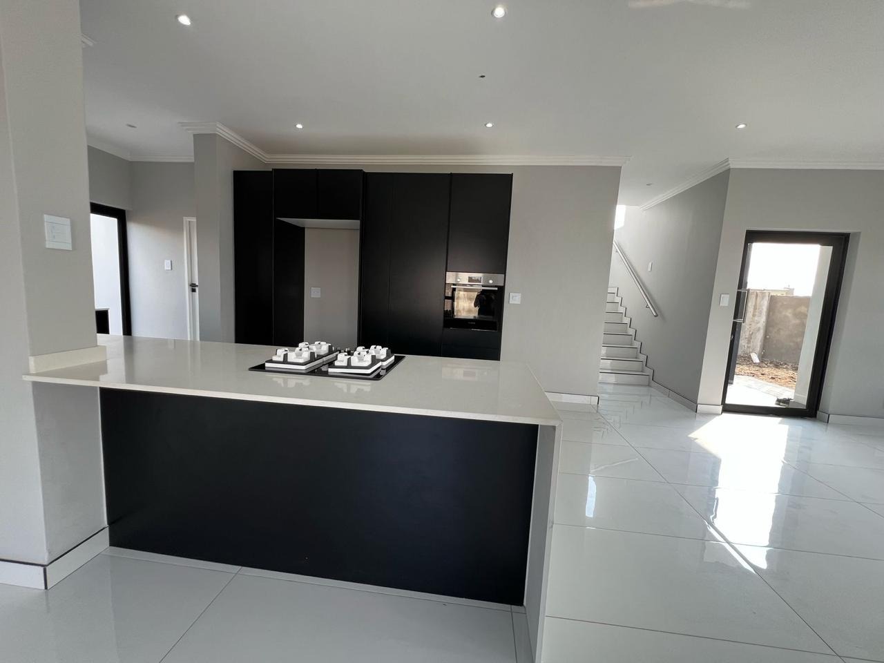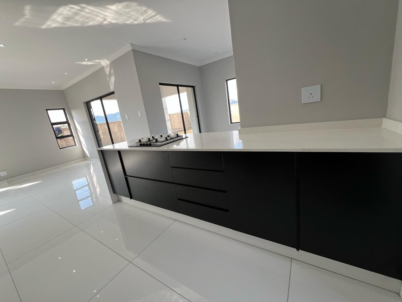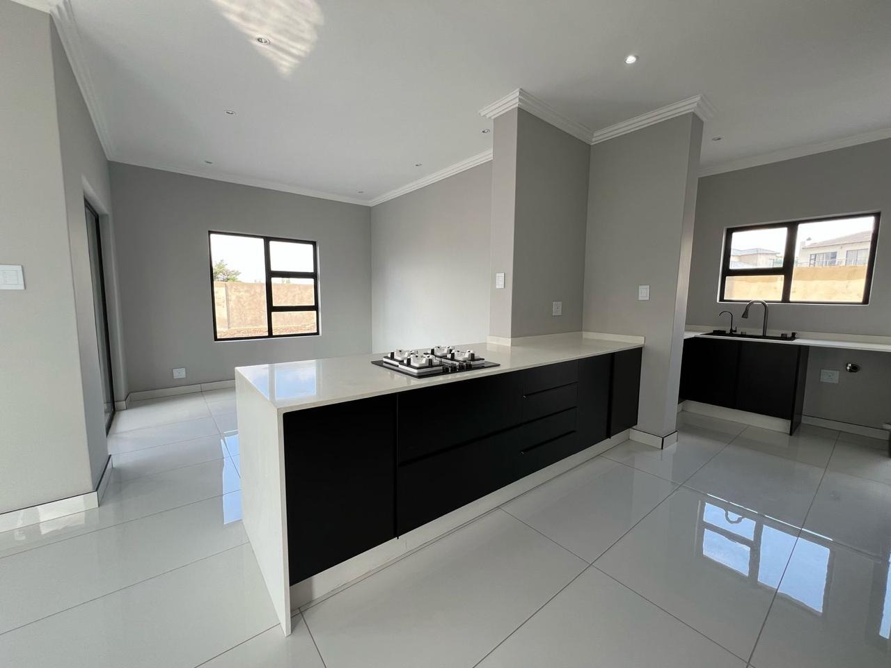 Discover contemporary living in this newly built, modern home situated within the secure Everglades Estate in Hartbeespoort, South Africa. Boasting a striking grey and white façade, this two-storey residence impresses with its clean aesthetic, large windows and abundant natural light. The home offers an integrated double garage and a fully walled perimeter, ensuring both privacy and convenience. Inside, the inviting open-plan layout features a spacious lounge and dedicated dining area, flowing seamlessly into a sleek kitchen with black cabinetry, white quartz countertops and a large central island fitted with a gas hob and oven. Glossy white tiles, light grey walls and recessed lighting create a bright, airy atmosphere throughout.