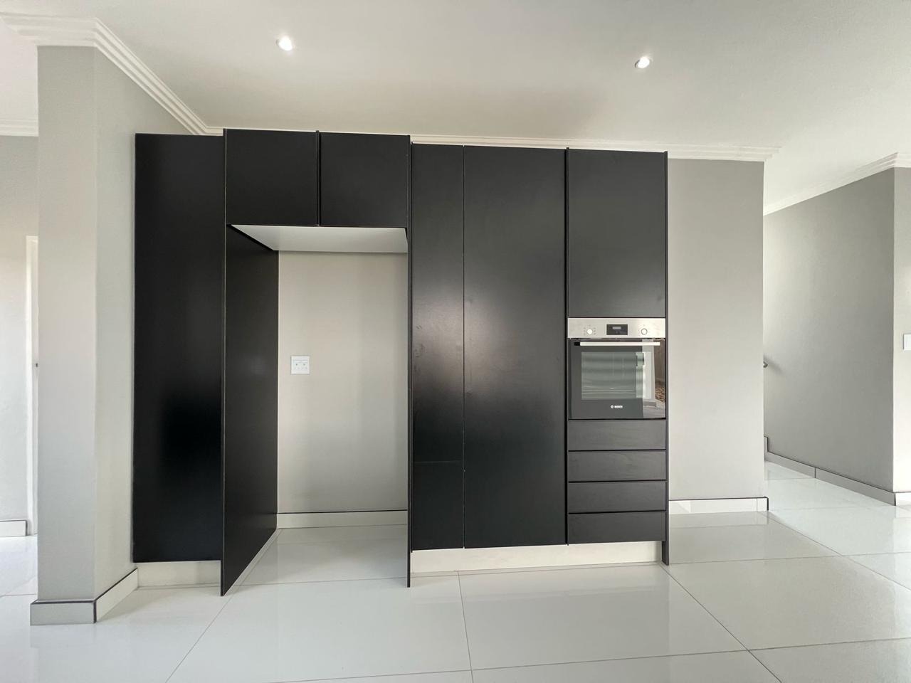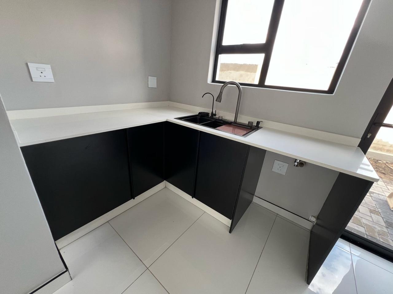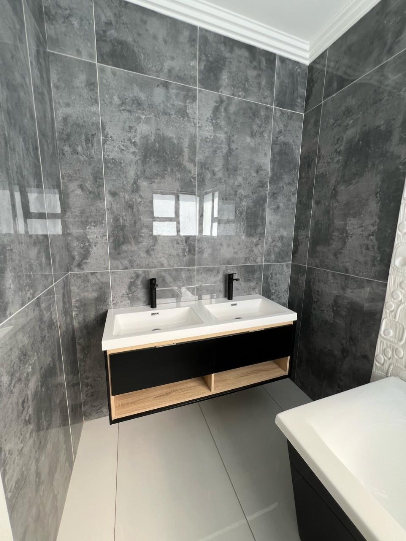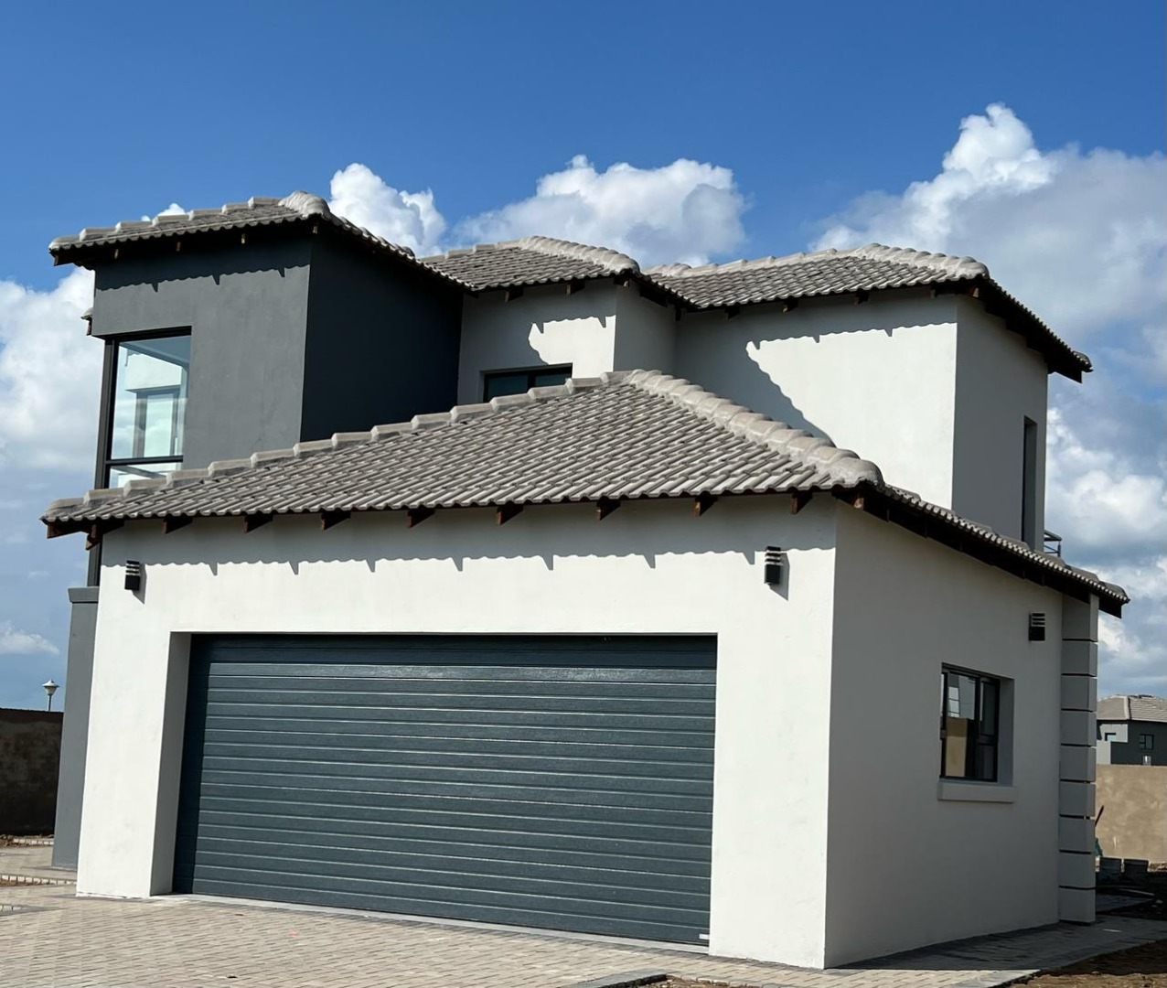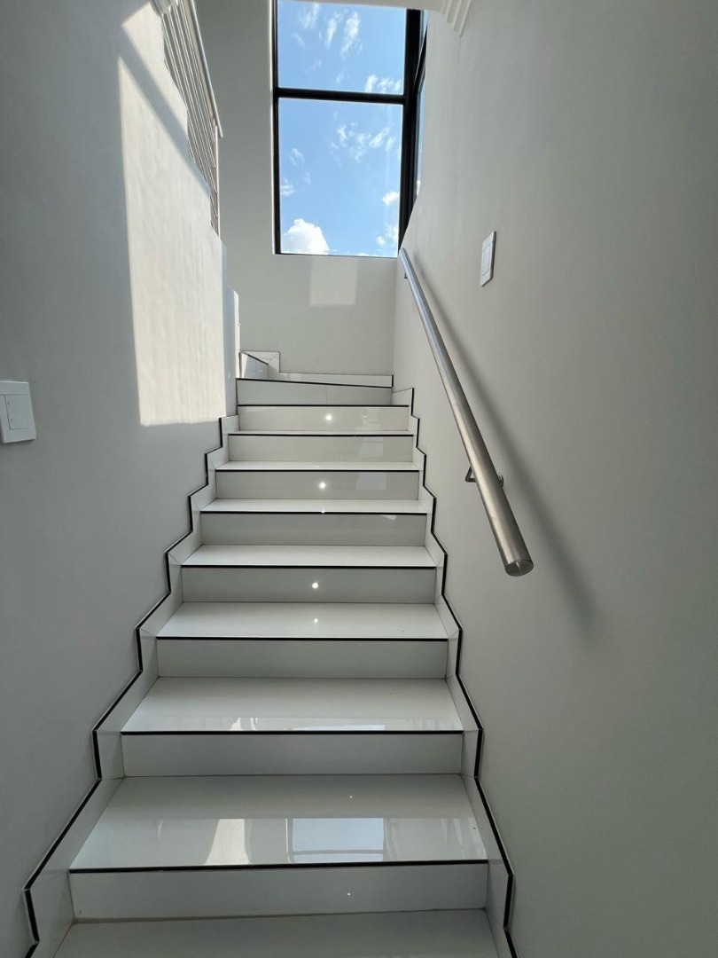 Discover contemporary living in this newly built, modern home situated within the secure Everglades Estate in Hartbeespoort, South Africa. Boasting a striking grey and white façade, this two-storey residence impresses with its clean aesthetic, large windows and abundant natural light. The home offers an integrated double garage and a fully walled perimeter, ensuring both privacy and convenience. Inside, the inviting open-plan layout features a spacious lounge and dedicated dining area, flowing seamlessly into a sleek kitchen with black cabinetry, white quartz countertops and a large central island fitted with a gas hob and oven. Glossy white tiles, light grey walls and recessed lighting create a bright, airy atmosphere throughout.