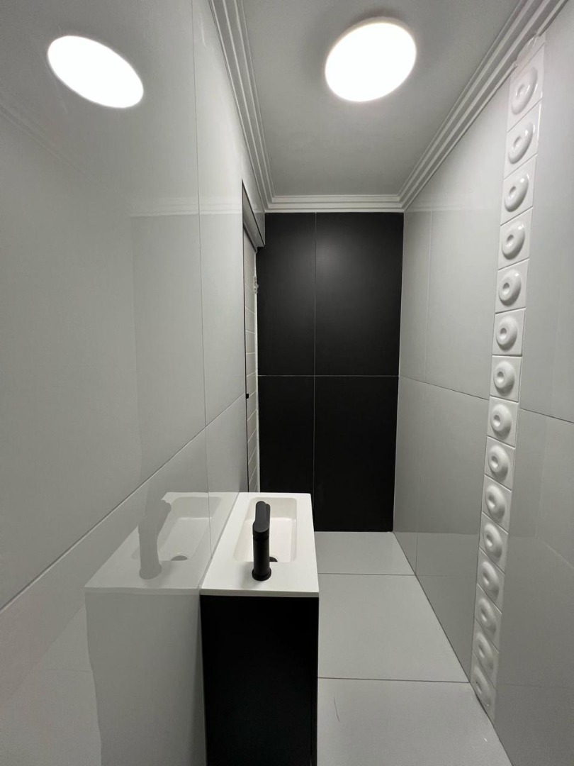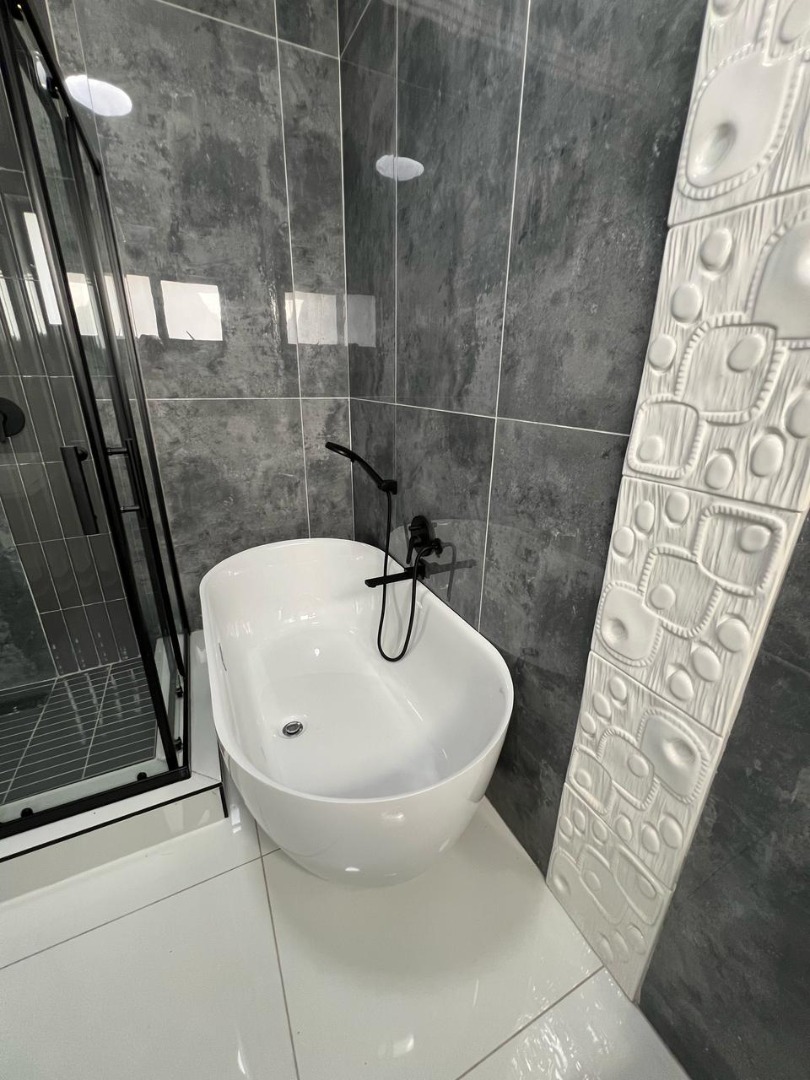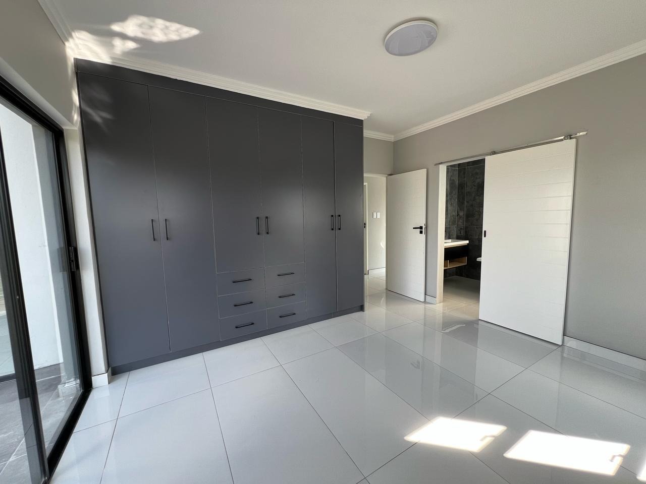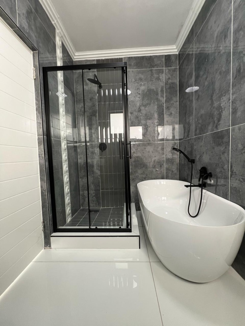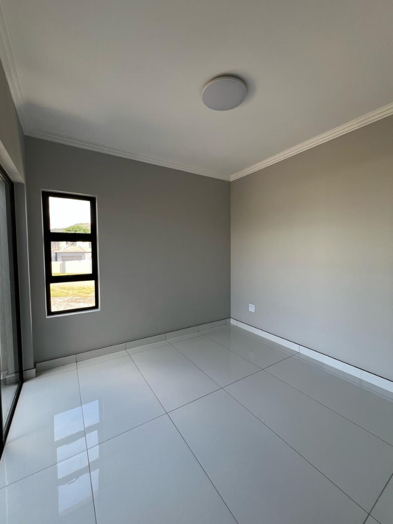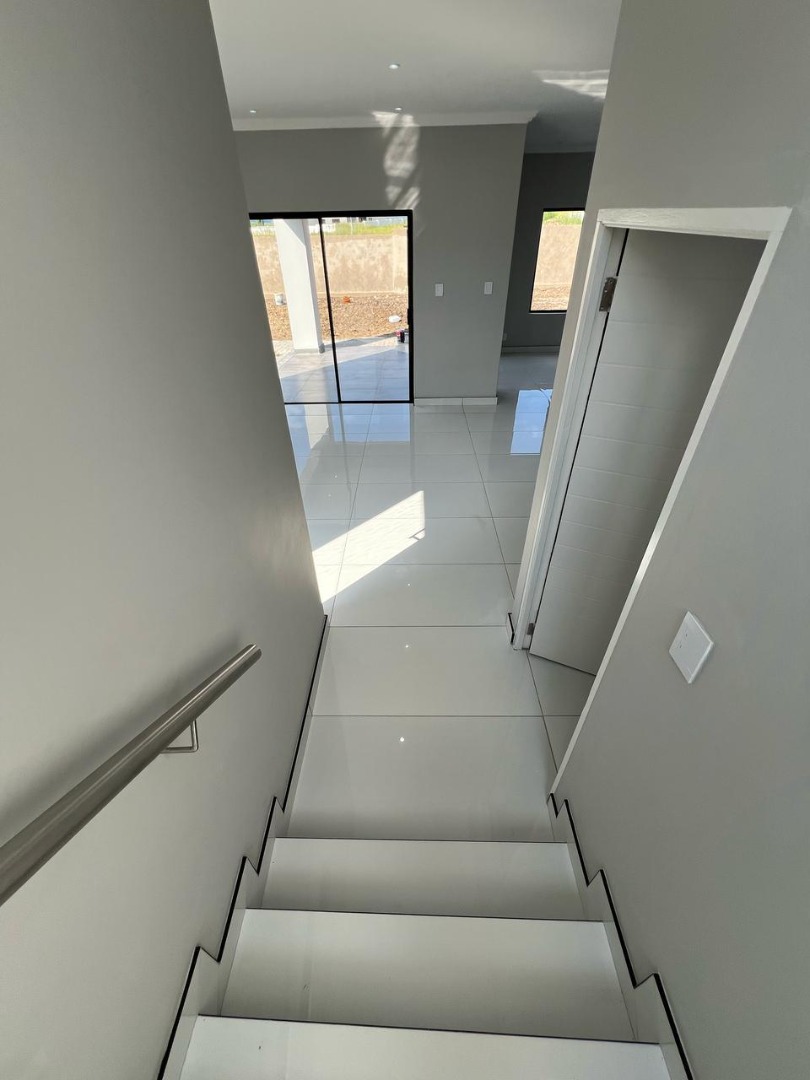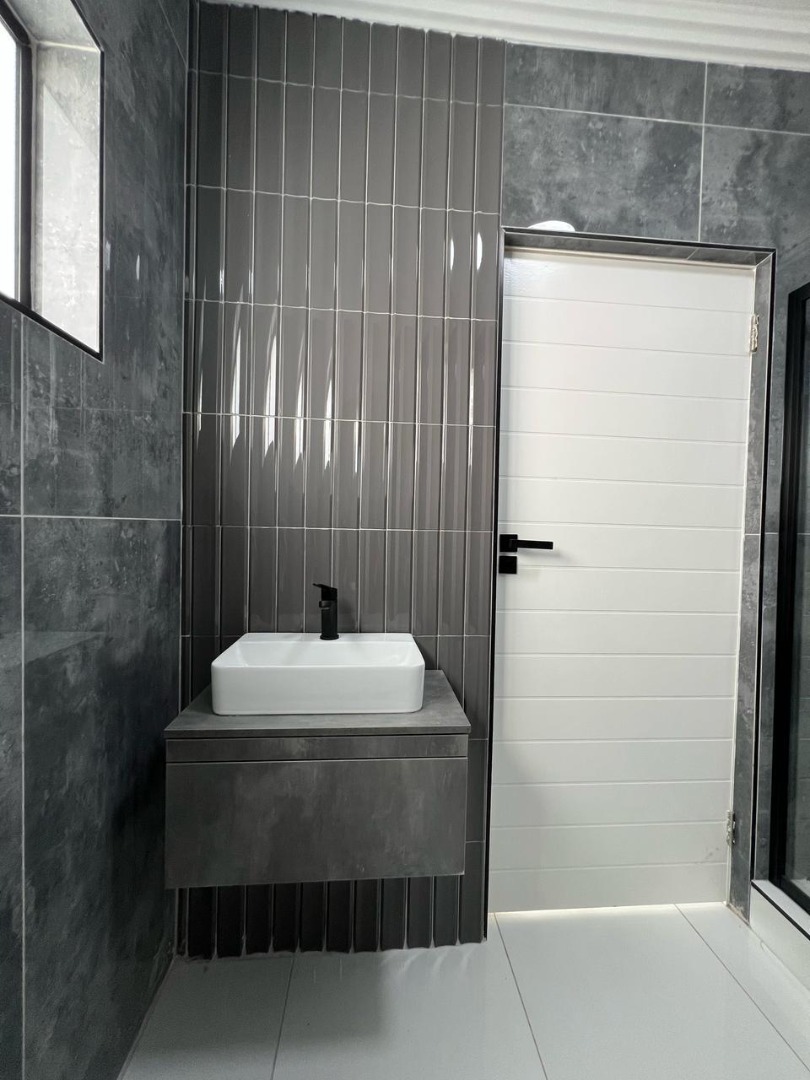 Discover contemporary living in this newly built, modern home situated within the secure Everglades Estate in Hartbeespoort, South Africa. Boasting a striking grey and white façade, this two-storey residence impresses with its clean aesthetic, large windows and abundant natural light. The home offers an integrated double garage and a fully walled perimeter, ensuring both privacy and convenience. Inside, the inviting open-plan layout features a spacious lounge and dedicated dining area, flowing seamlessly into a sleek kitchen with black cabinetry, white quartz countertops and a large central island fitted with a gas hob and oven. Glossy white tiles, light grey walls and recessed lighting create a bright, airy atmosphere throughout.