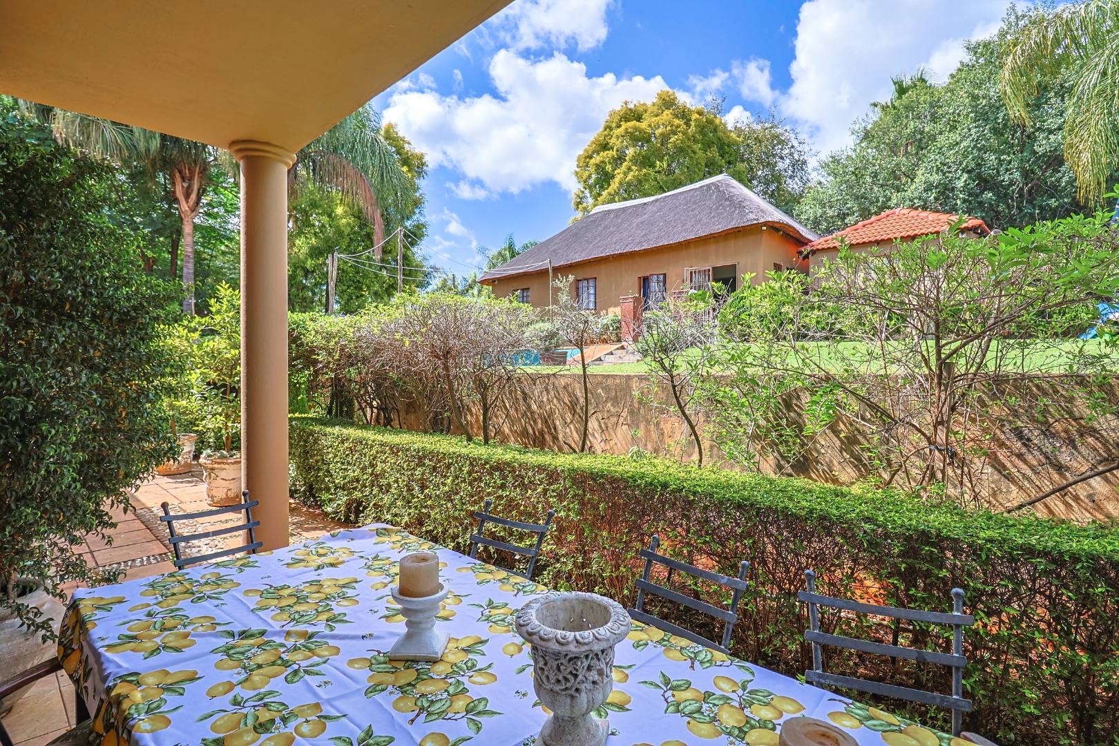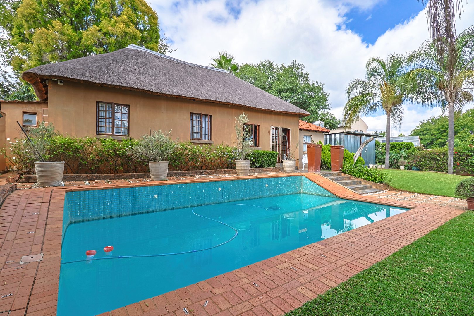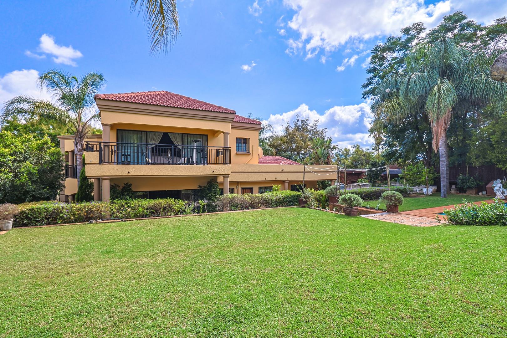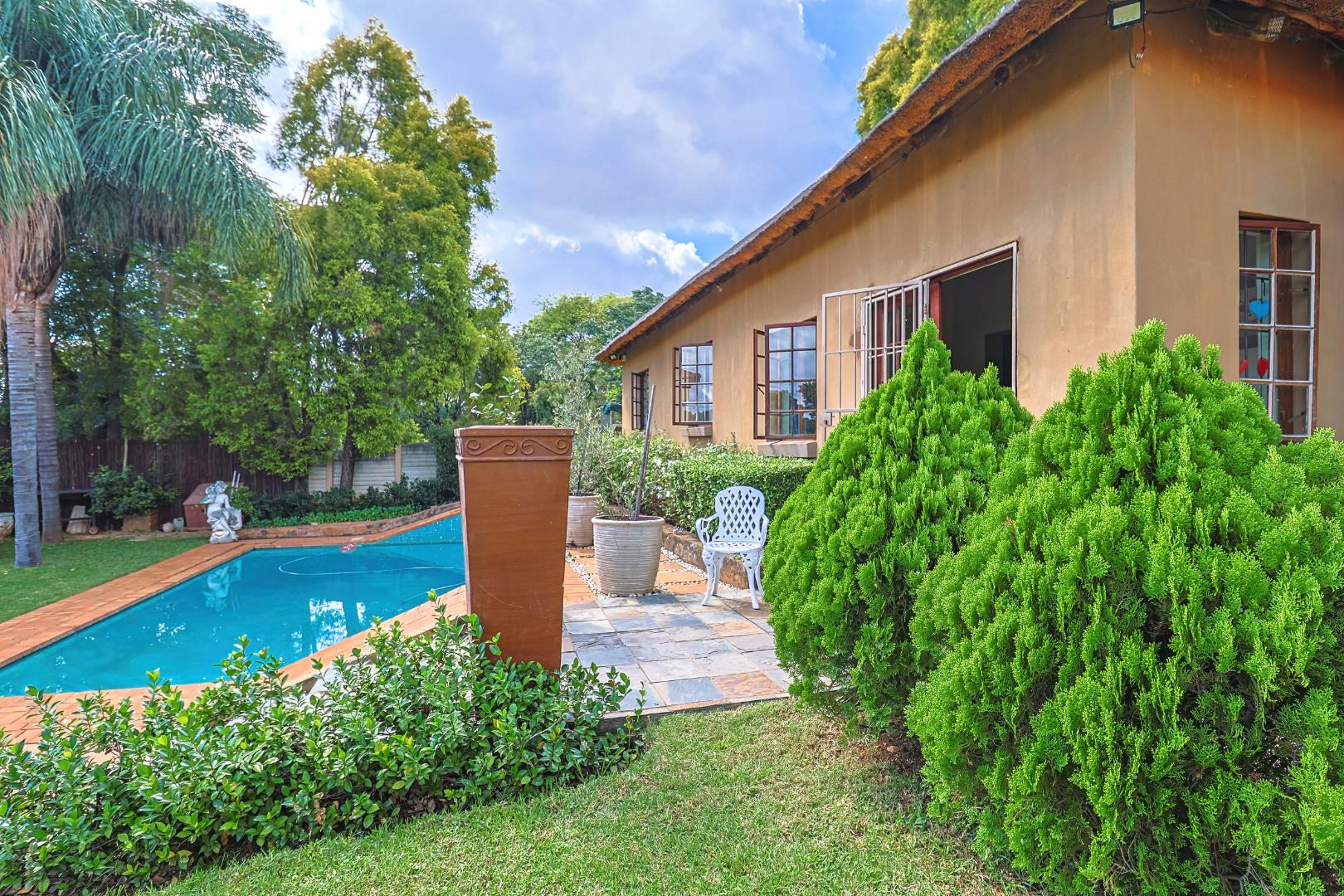 The main house features multiple living areas, including lounges, a study, a craft or hobby room, and a striking dining room. An open plan layout with skylight and sliding doors enhances natural light and indoor outdoor flow, while multiple patios and balconies provide ideal spaces for entertaining. Outdoor amenities include a swimming pool, built in braai, and a well maintained garden with a vegetable patch.