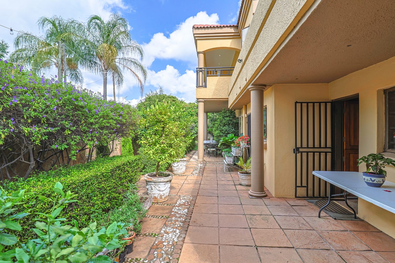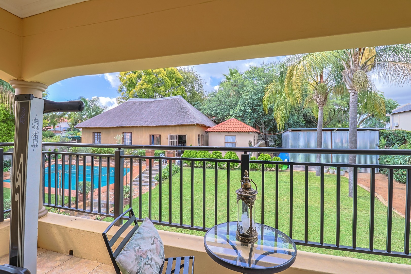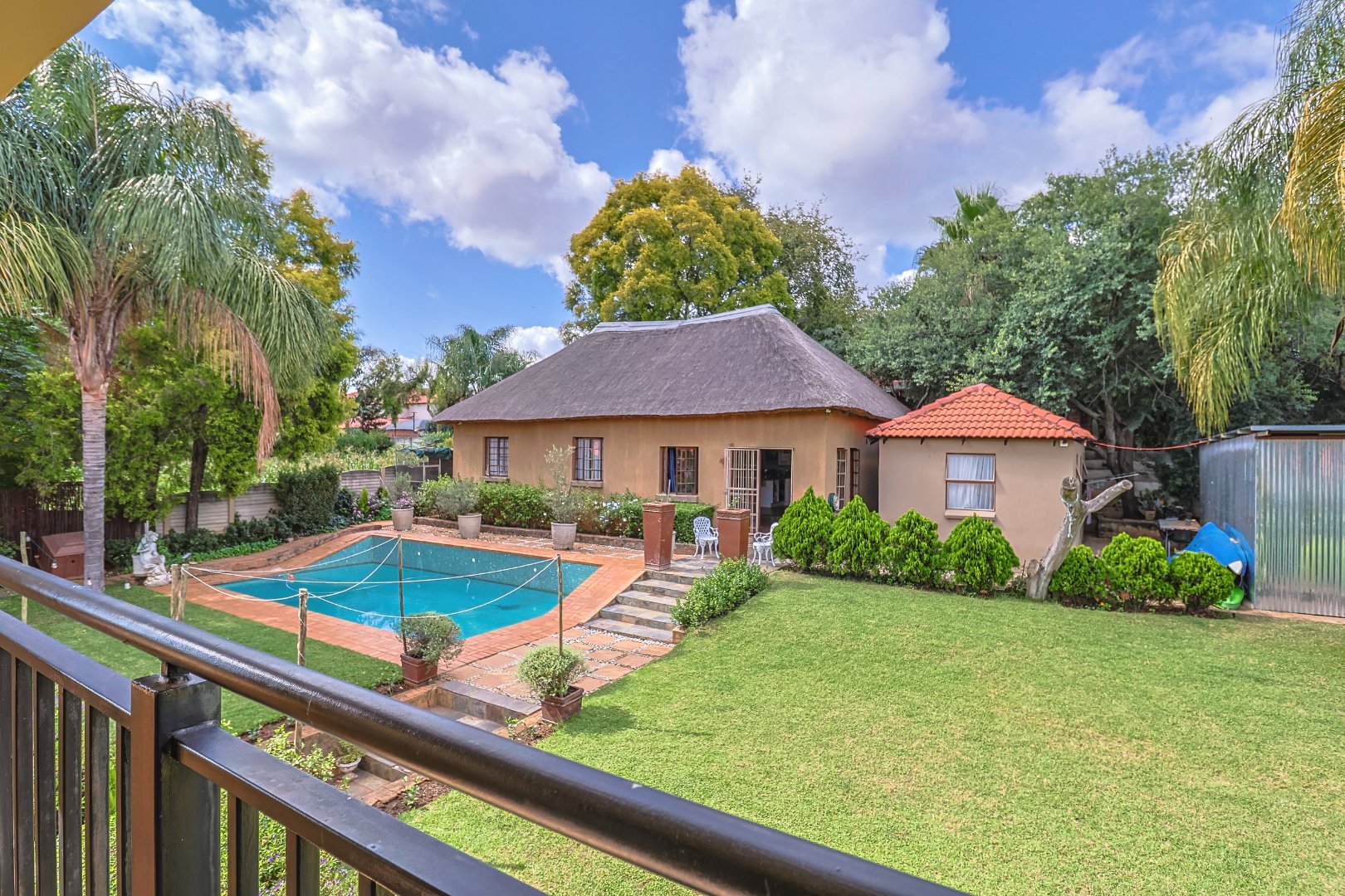 The main house features multiple living areas, including lounges, a study, a craft or hobby room, and a striking dining room. An open plan layout with skylight and sliding doors enhances natural light and indoor outdoor flow, while multiple patios and balconies provide ideal spaces for entertaining. Outdoor amenities include a swimming pool, built in braai, and a well maintained garden with a vegetable patch.