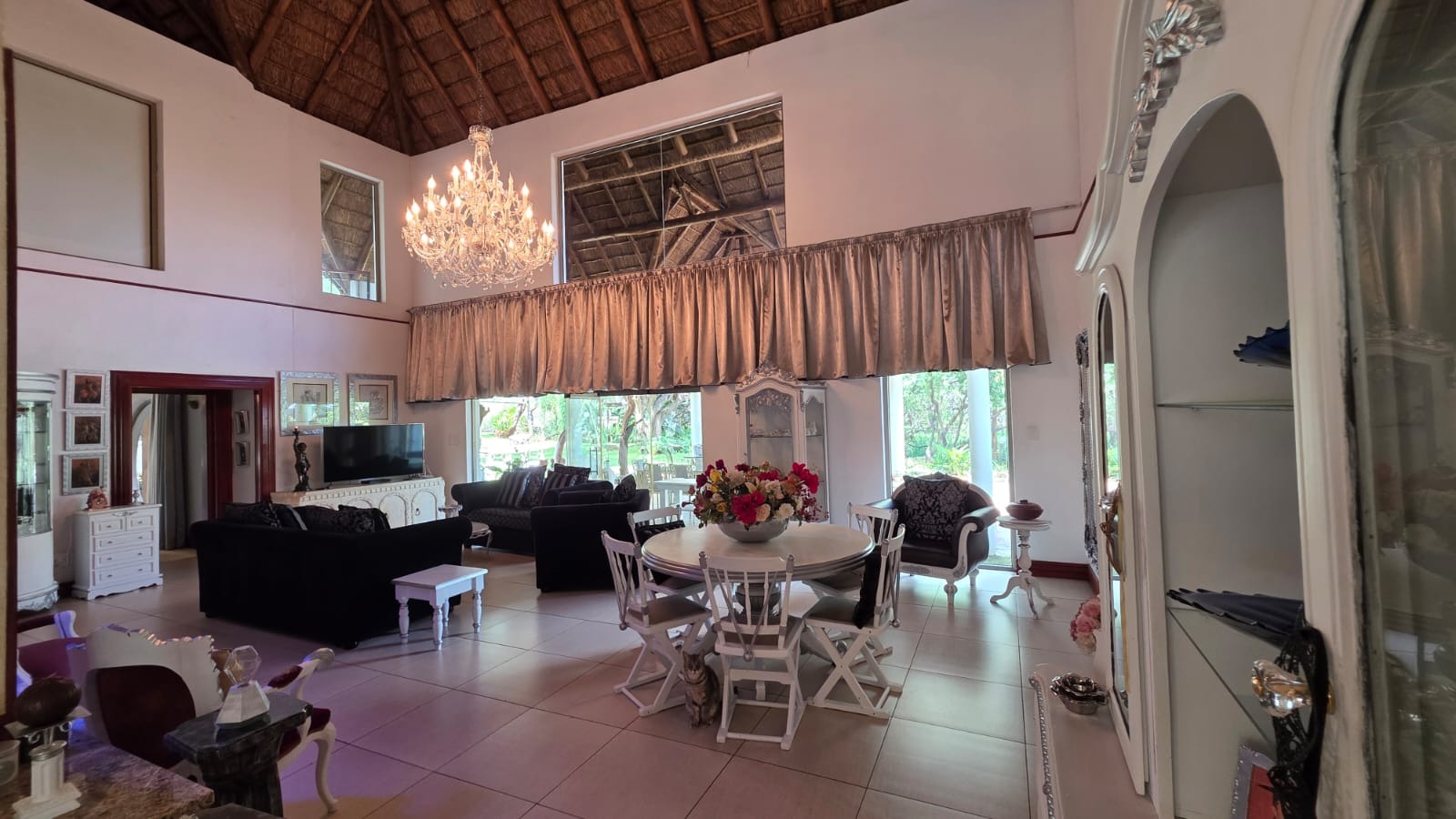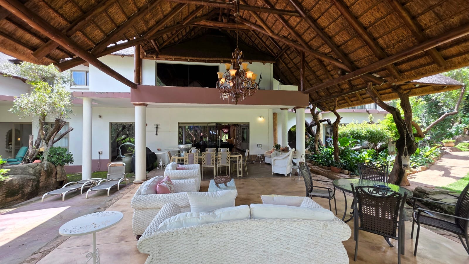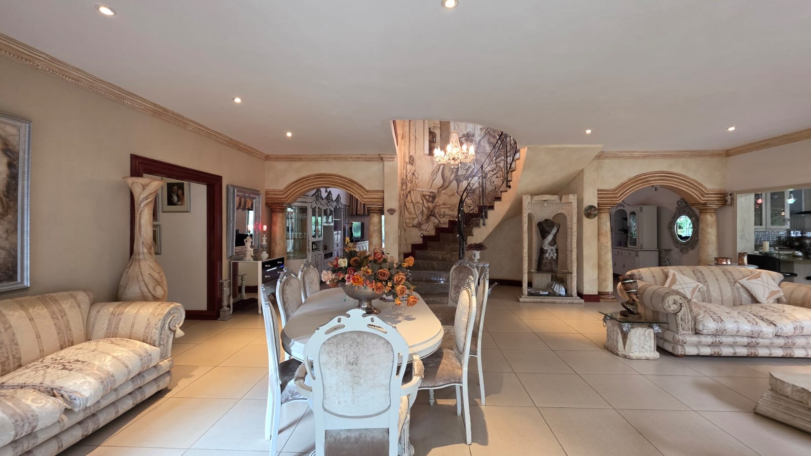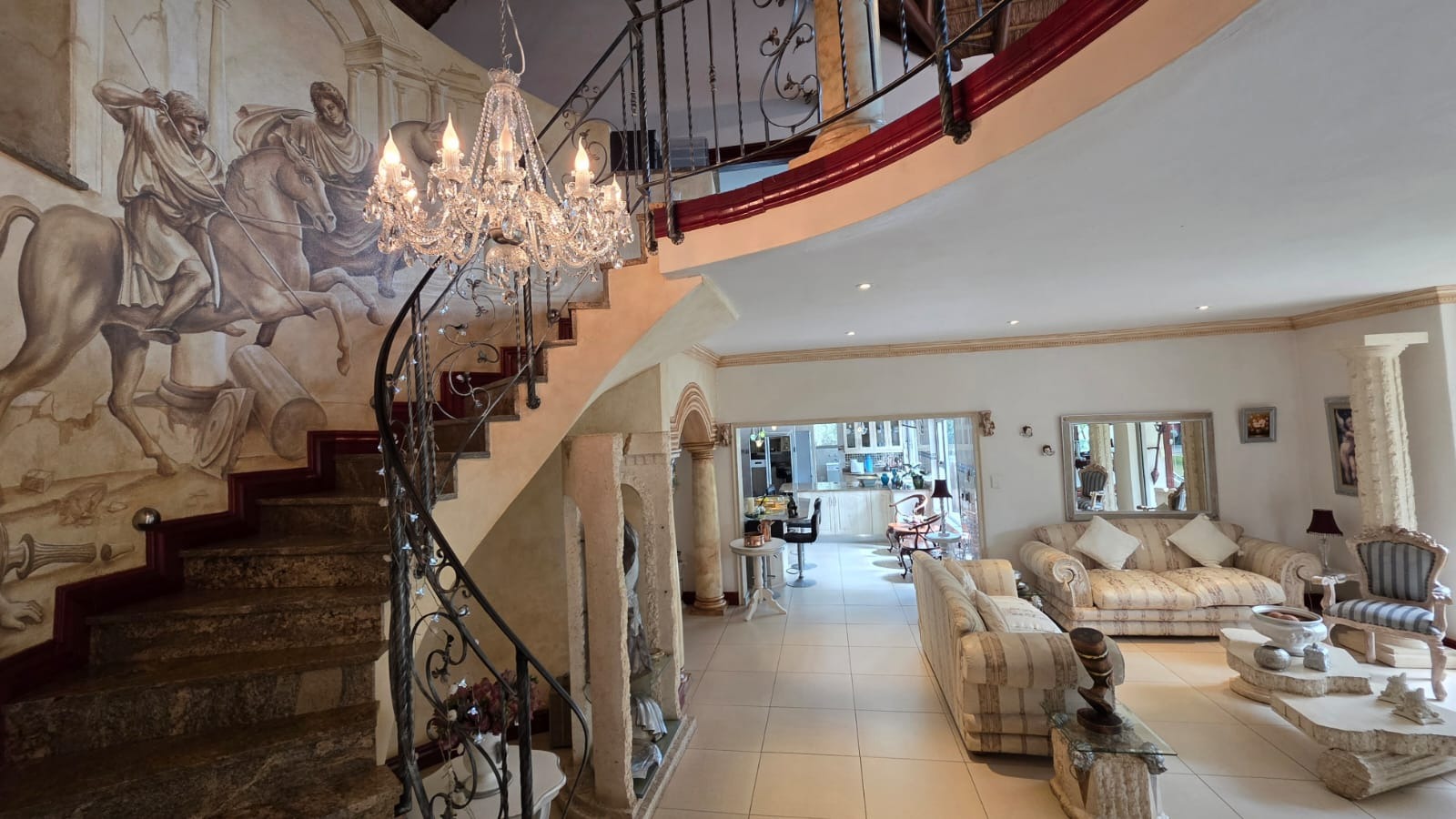 Nestled within the exclusive K’shane Security Estate in Hartbeespoort, this magnificent 1203 sqm residence on an expansive 8023 sqm erf offers an unmatched lifestyle in a pristine nature reserve and wildlife sanctuary. The home immediately impresses with its unique architectural charm, including rustic thatch-roofed accents, a rounded feature window, decorative pillars, and lush mature landscaping. A serene pond with a quaint wooden footbridge enhances the idyllic setting. Inside, a grand granite staircase with intricate wrought iron railings curves beneath a sparkling crystal chandelier, while a classical mural and rich architectural elements—columns, arches, and ornate mouldings—create an atmosphere of refined luxury. Expansive open-plan living and dining spaces with high ceilings, recessed lighting, and air conditioning provide an elegant environment for both intimate gatherings and large-scale entertaining.