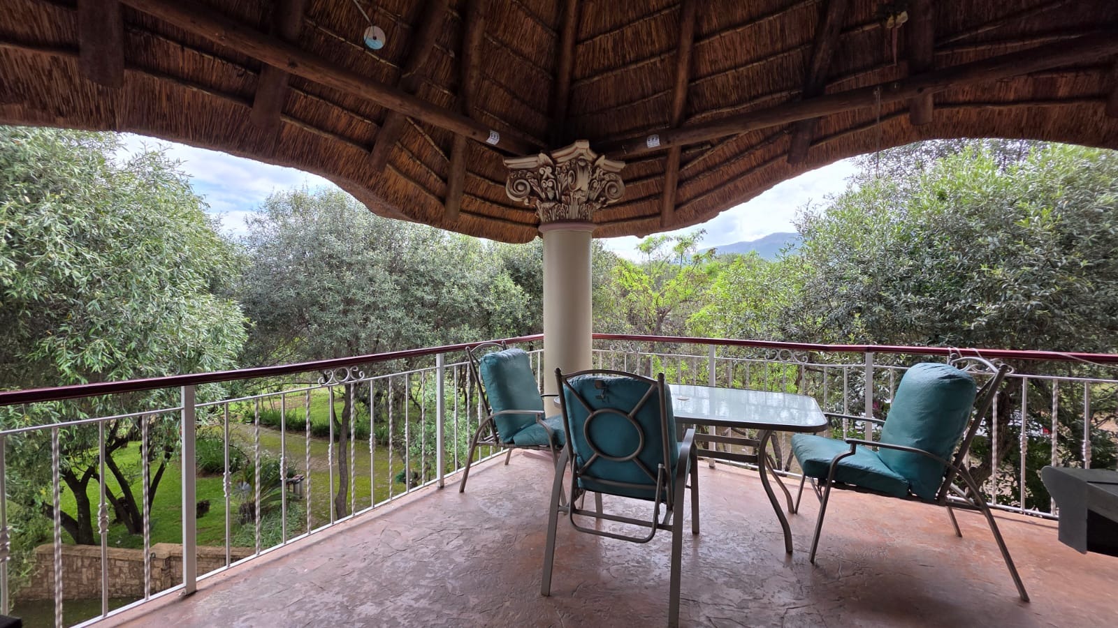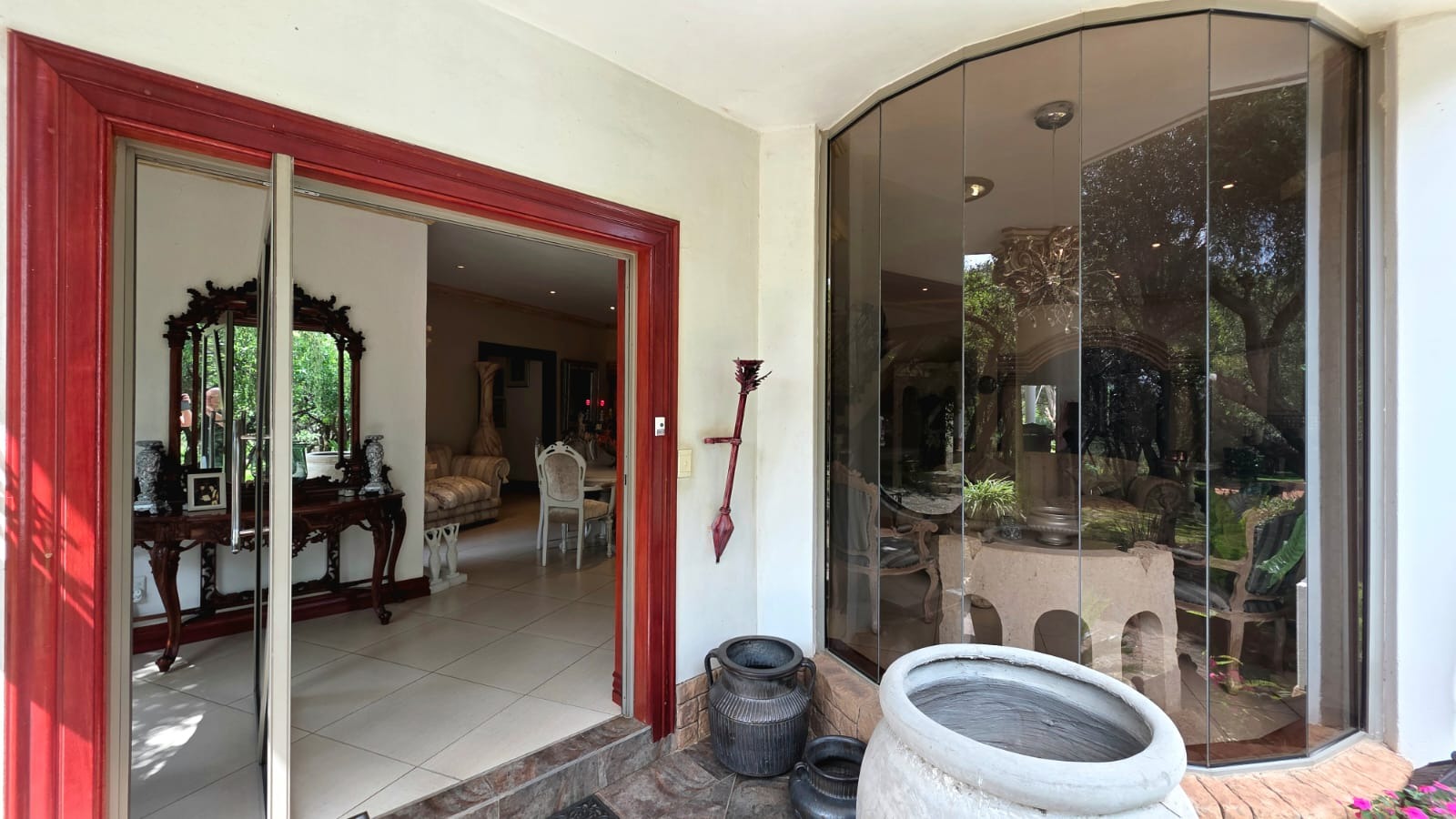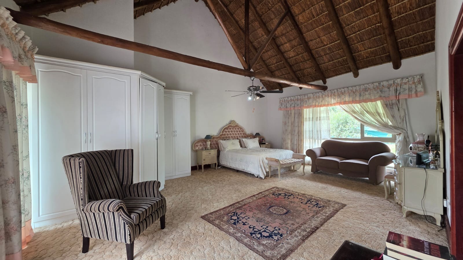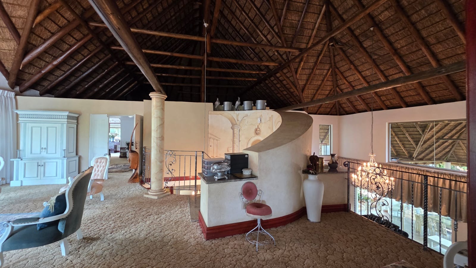 Nestled within the exclusive K’shane Security Estate in Hartbeespoort, this magnificent 1203 sqm residence on an expansive 8023 sqm erf offers an unmatched lifestyle in a pristine nature reserve and wildlife sanctuary. The home immediately impresses with its unique architectural charm, including rustic thatch-roofed accents, a rounded feature window, decorative pillars, and lush mature landscaping. A serene pond with a quaint wooden footbridge enhances the idyllic setting. Inside, a grand granite staircase with intricate wrought iron railings curves beneath a sparkling crystal chandelier, while a classical mural and rich architectural elements—columns, arches, and ornate mouldings—create an atmosphere of refined luxury. Expansive open-plan living and dining spaces with high ceilings, recessed lighting, and air conditioning provide an elegant environment for both intimate gatherings and large-scale entertaining.
