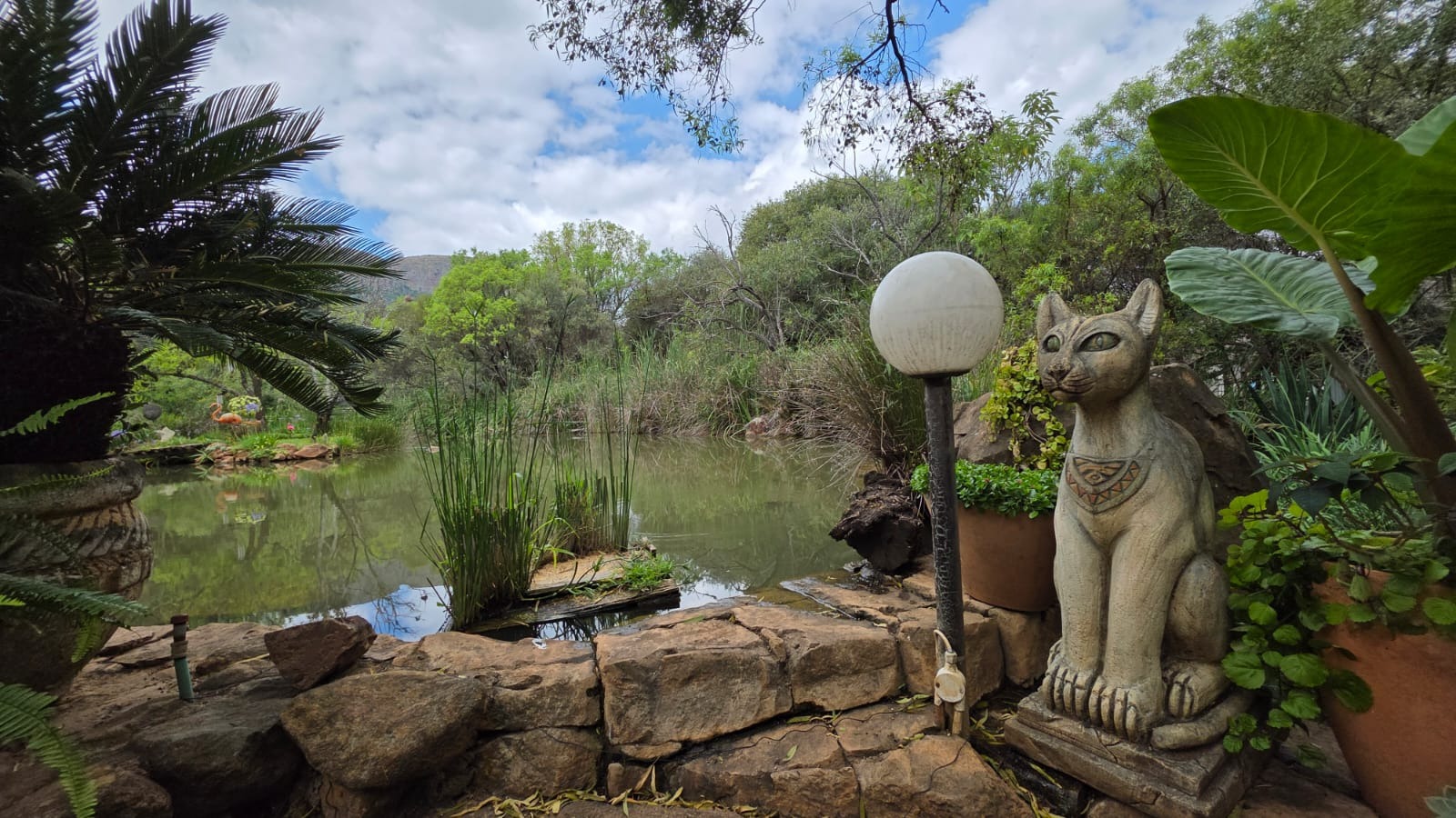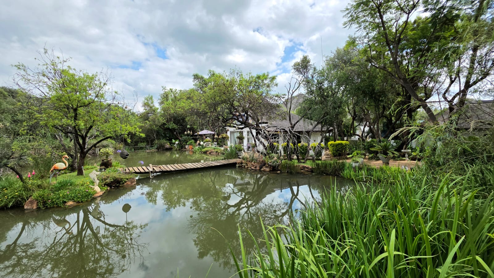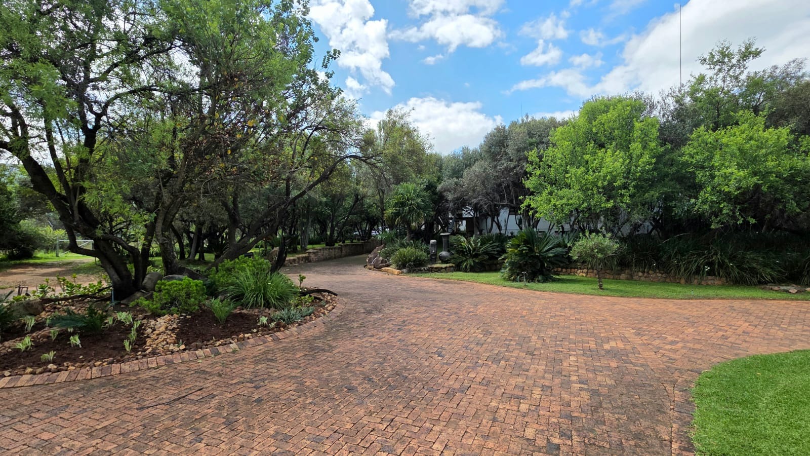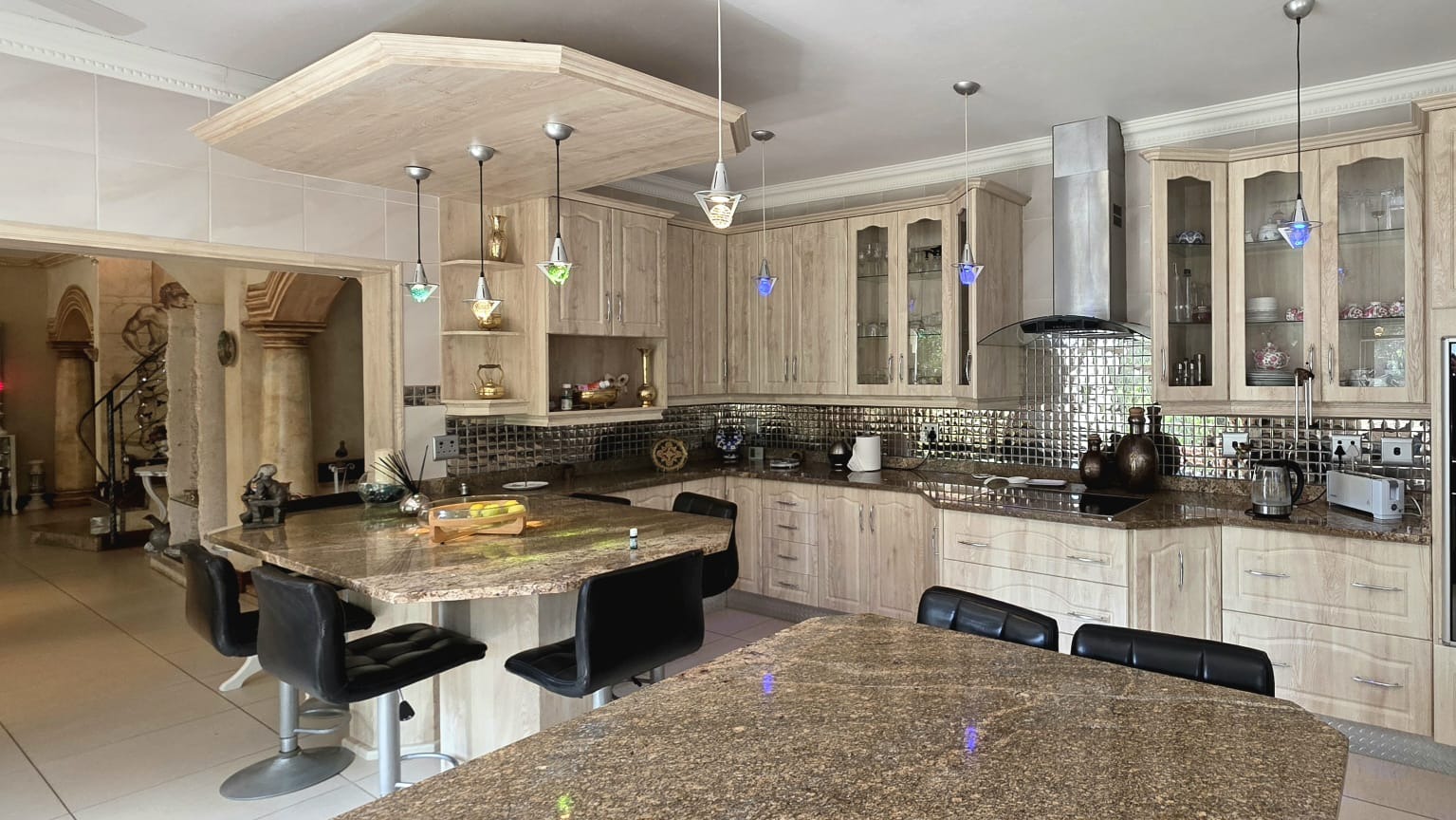 Nestled within the exclusive K’shane Security Estate in Hartbeespoort, this magnificent 1203 sqm residence on an expansive 8023 sqm erf offers an unmatched lifestyle in a pristine nature reserve and wildlife sanctuary. The home immediately impresses with its unique architectural charm, including rustic thatch-roofed accents, a rounded feature window, decorative pillars, and lush mature landscaping. A serene pond with a quaint wooden footbridge enhances the idyllic setting. Inside, a grand granite staircase with intricate wrought iron railings curves beneath a sparkling crystal chandelier, while a classical mural and rich architectural elements—columns, arches, and ornate mouldings—create an atmosphere of refined luxury. Expansive open-plan living and dining spaces with high ceilings, recessed lighting, and air conditioning provide an elegant environment for both intimate gatherings and large-scale entertaining.
