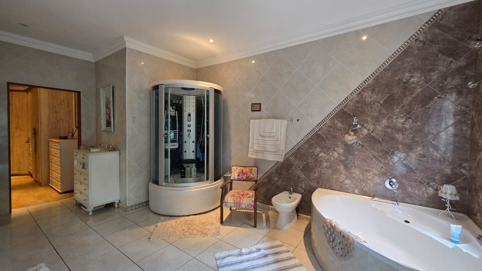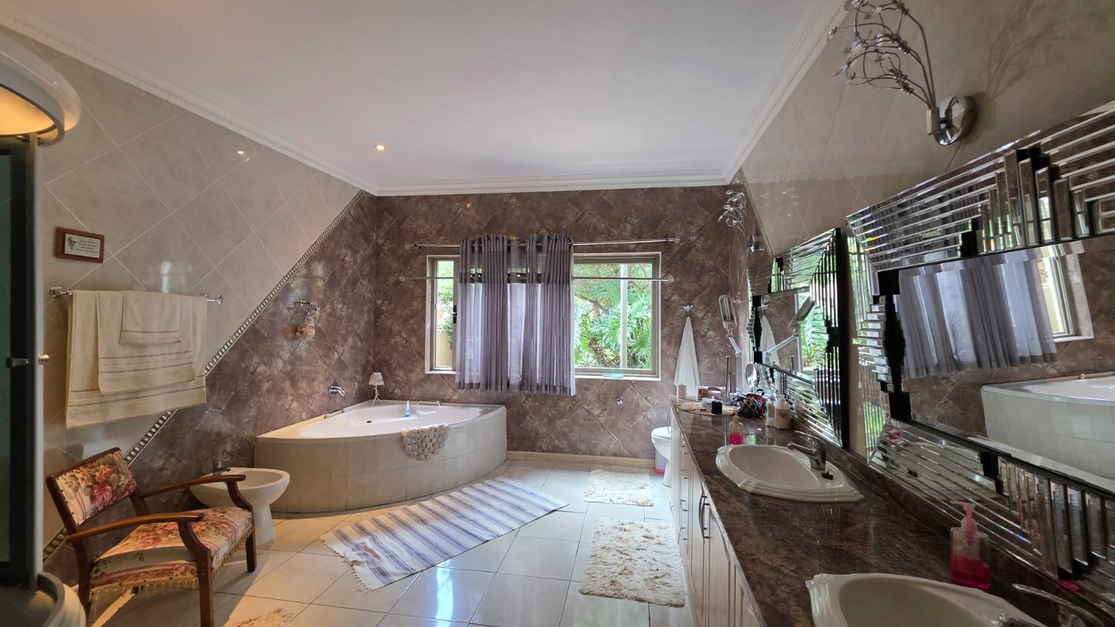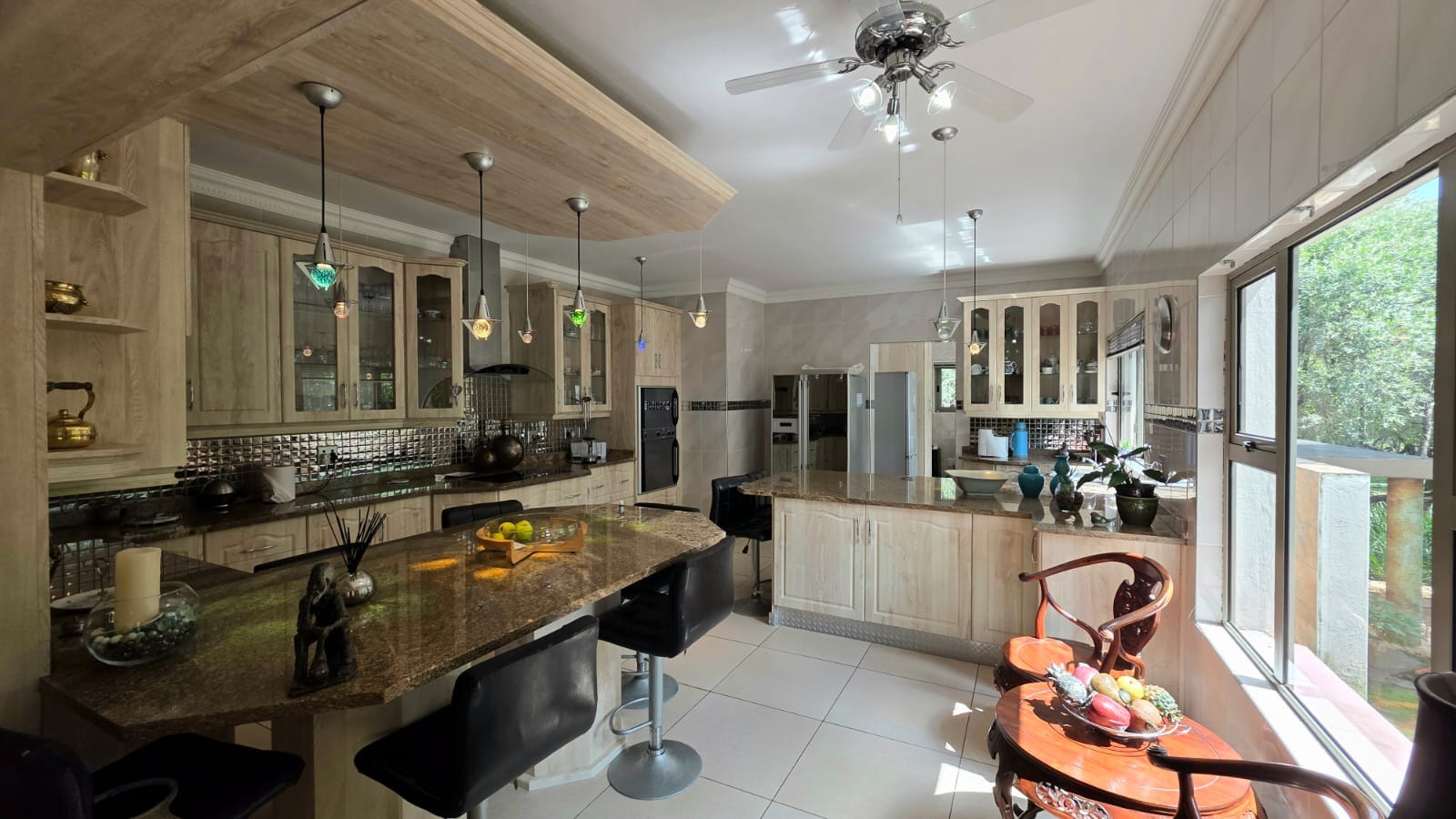 This exceptional residence boasts nine luxurious bedrooms and seven and a half bathrooms, including a guest toilet, as well as three dining areas, two lounges, a fully equipped flatlet, staff quarters, and outside facilities. The gourmet kitchen is a culinary showpiece, offering extensive cabinetry, gleaming granite countertops, multiple islands, integrated appliances, and a welcoming breakfast bar overlooking the garden. Outdoor living is elevated with a spacious covered thatched patio featuring a built-in braai, seamlessly connecting to manicured gardens, a tranquil pond, and breathtaking mountain views. Additional features include four garages, six parking bays, a solar geyser, a sprinkler system, and comprehensive estate security with controlled access.