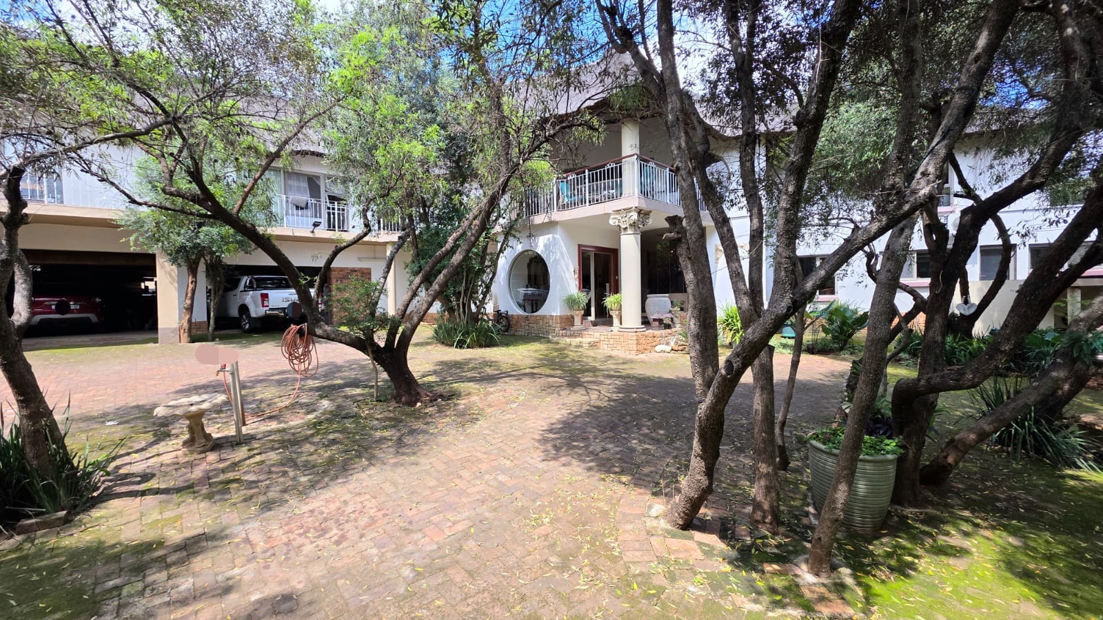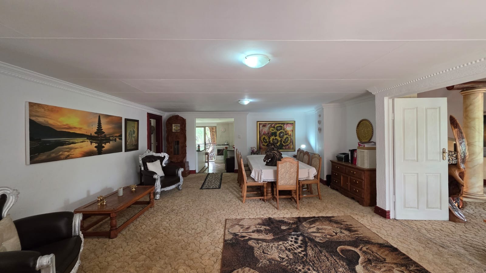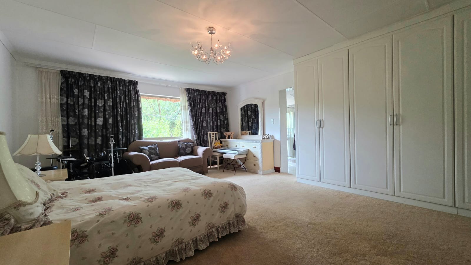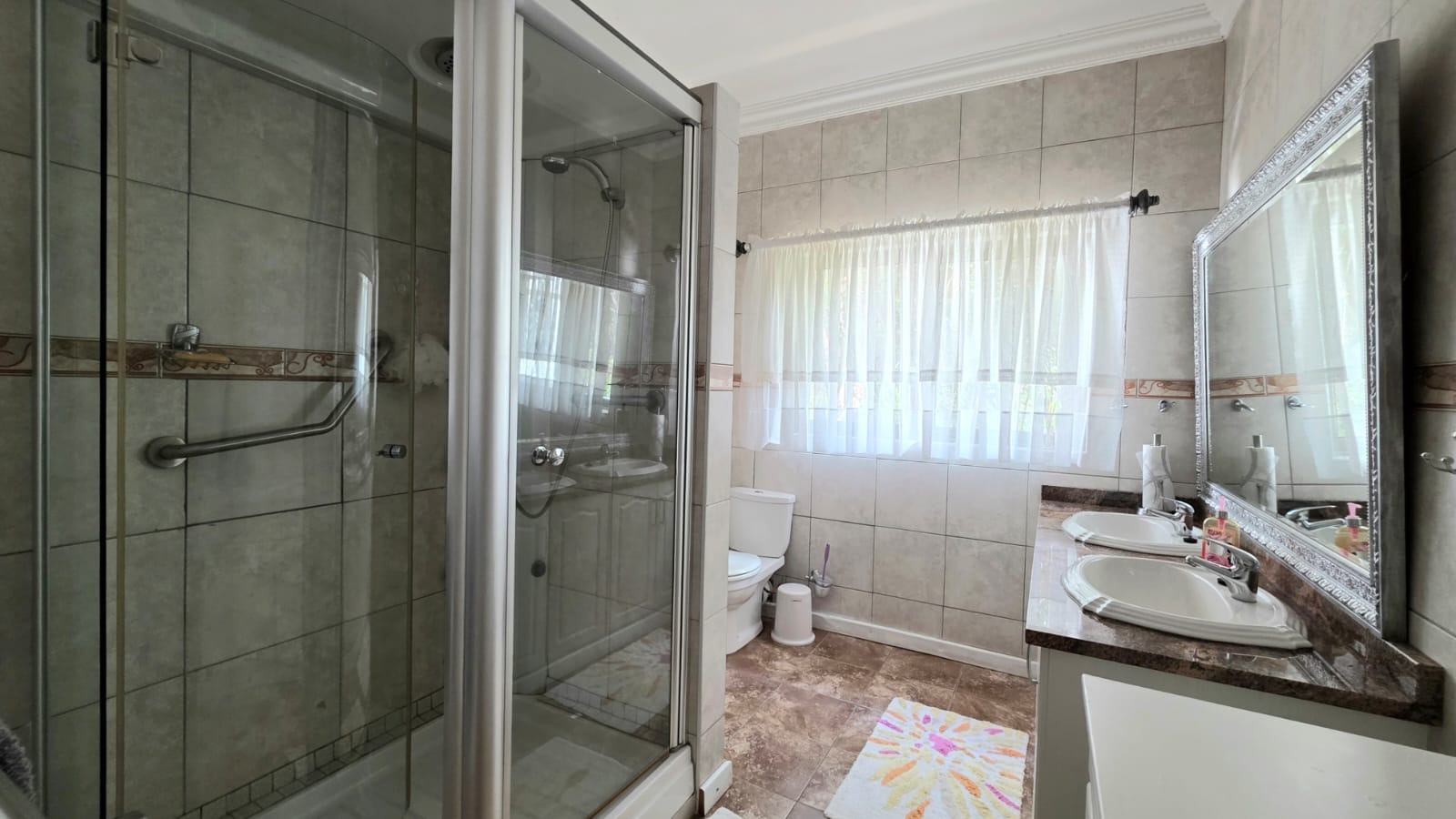 This exceptional residence boasts nine luxurious bedrooms and seven and a half bathrooms, including a guest toilet, as well as three dining areas, two lounges, a fully equipped flatlet, staff quarters, and outside facilities. The gourmet kitchen is a culinary showpiece, offering extensive cabinetry, gleaming granite countertops, multiple islands, integrated appliances, and a welcoming breakfast bar overlooking the garden. Outdoor living is elevated with a spacious covered thatched patio featuring a built-in braai, seamlessly connecting to manicured gardens, a tranquil pond, and breathtaking mountain views. Additional features include four garages, six parking bays, a solar geyser, a sprinkler system, and comprehensive estate security with controlled access.