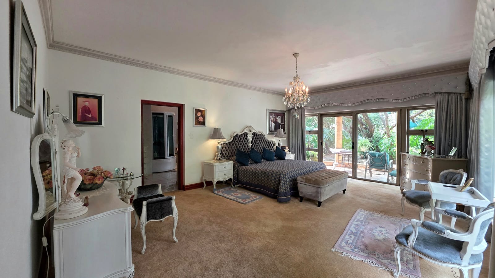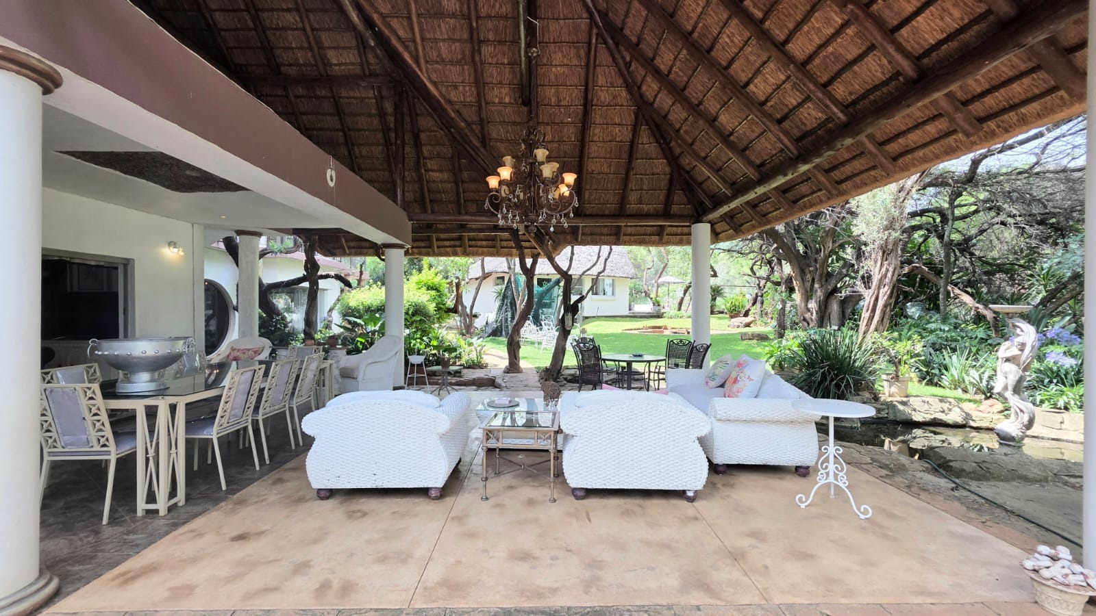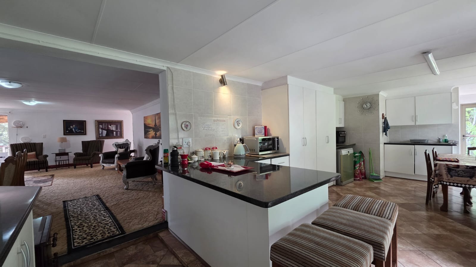 This exceptional residence boasts nine luxurious bedrooms and seven and a half bathrooms, including a guest toilet, as well as three dining areas, two lounges, a fully equipped flatlet, staff quarters, and outside facilities. The gourmet kitchen is a culinary showpiece, offering extensive cabinetry, gleaming granite countertops, multiple islands, integrated appliances, and a welcoming breakfast bar overlooking the garden. Outdoor living is elevated with a spacious covered thatched patio featuring a built-in braai, seamlessly connecting to manicured gardens, a tranquil pond, and breathtaking mountain views. Additional features include four garages, six parking bays, a solar geyser, a sprinkler system, and comprehensive estate security with controlled access.
