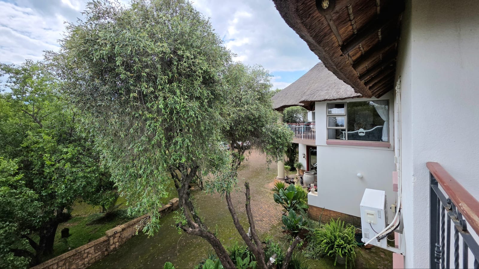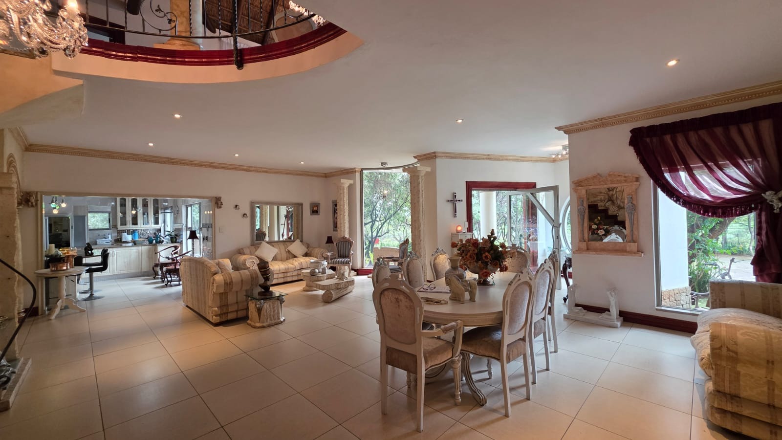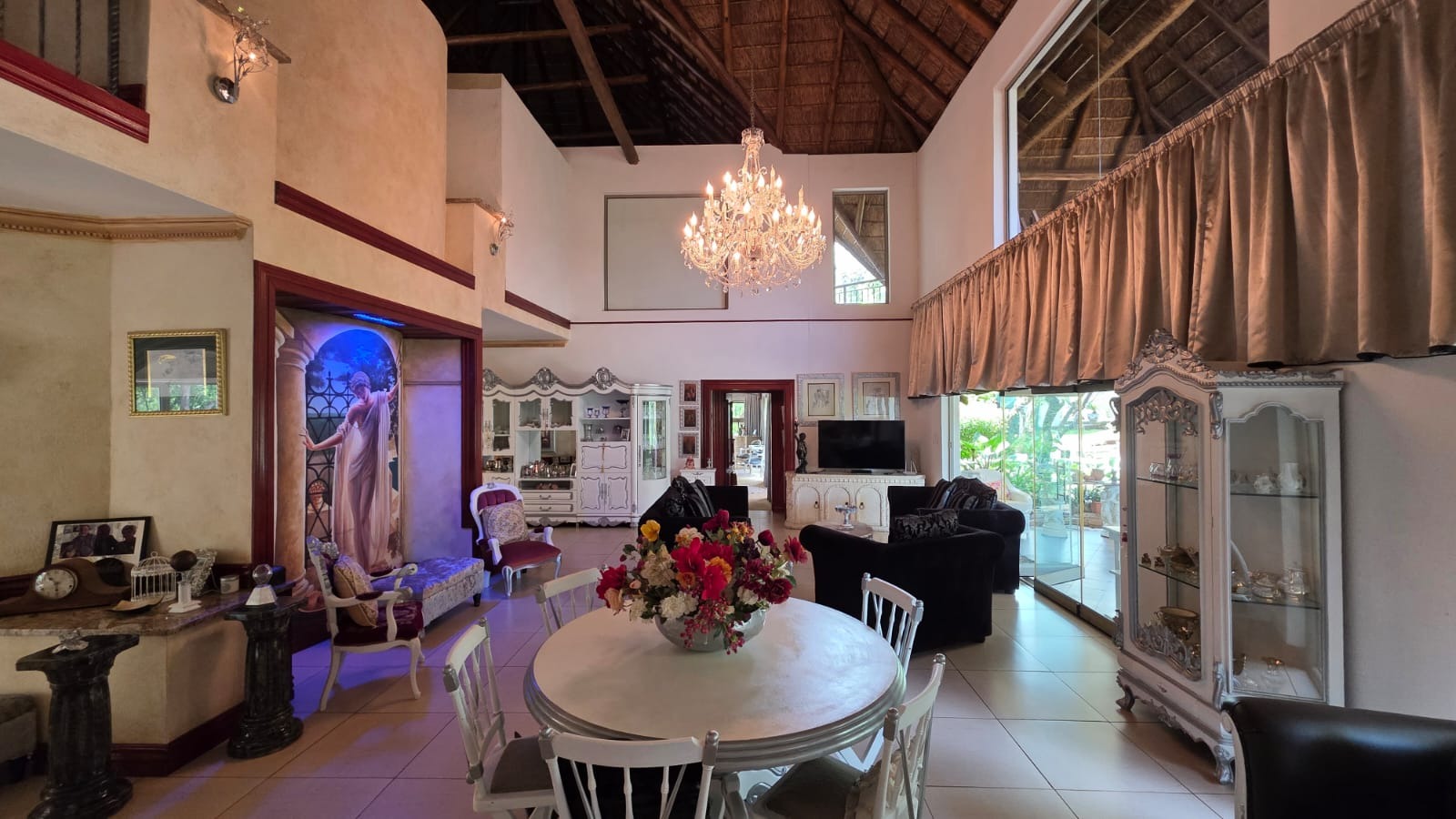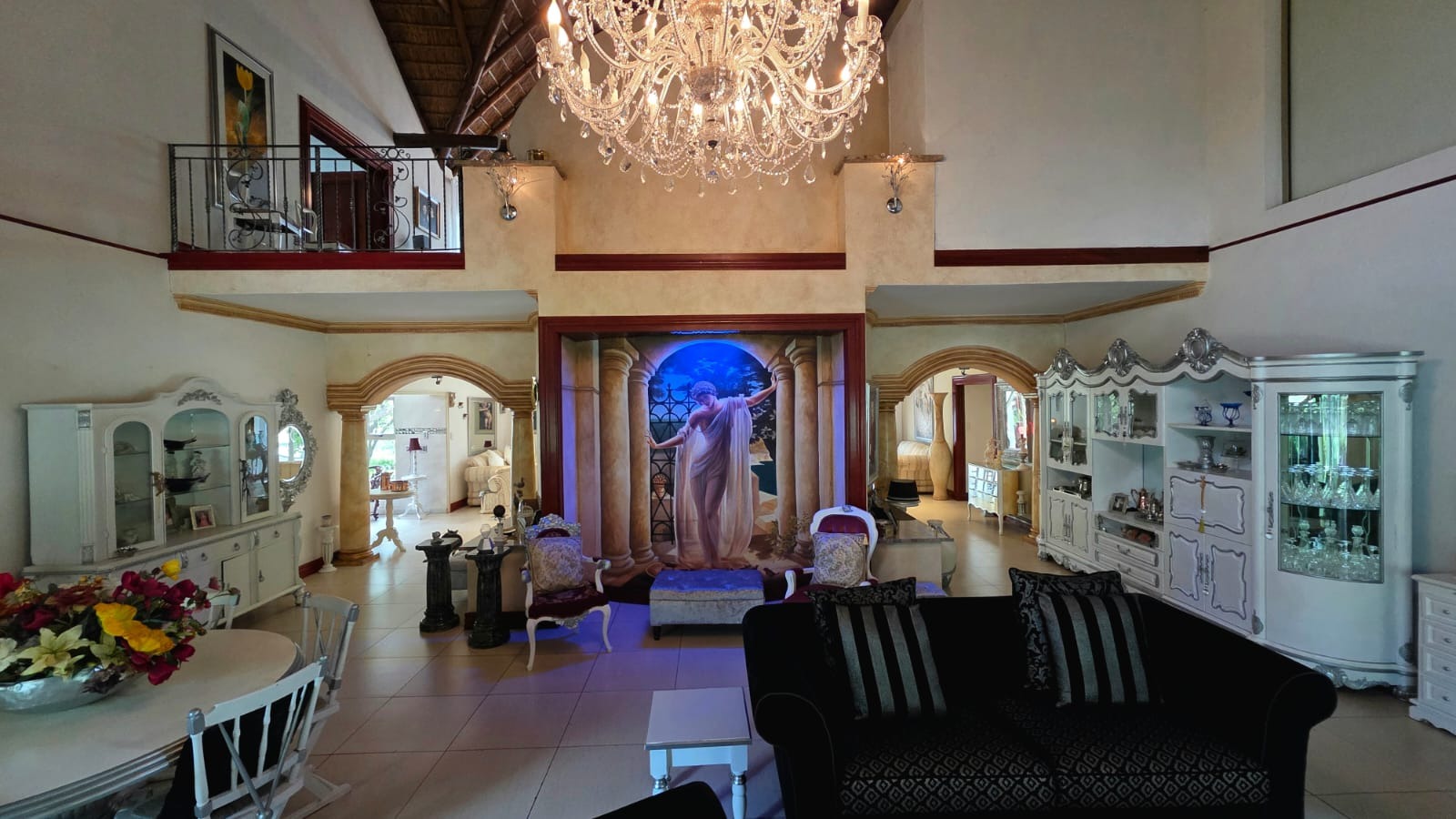 Nestled within the exclusive K’shane Security Estate in Hartbeespoort, this magnificent 1203 sqm residence on an expansive 8023 sqm erf offers an unmatched lifestyle in a pristine nature reserve and wildlife sanctuary. The home immediately impresses with its unique architectural charm, including rustic thatch-roofed accents, a rounded feature window, decorative pillars, and lush mature landscaping. A serene pond with a quaint wooden footbridge enhances the idyllic setting. Inside, a grand granite staircase with intricate wrought iron railings curves beneath a sparkling crystal chandelier, while a classical mural and rich architectural elements—columns, arches, and ornate mouldings—create an atmosphere of refined luxury. Expansive open-plan living and dining spaces with high ceilings, recessed lighting, and air conditioning provide an elegant environment for both intimate gatherings and large-scale entertaining.