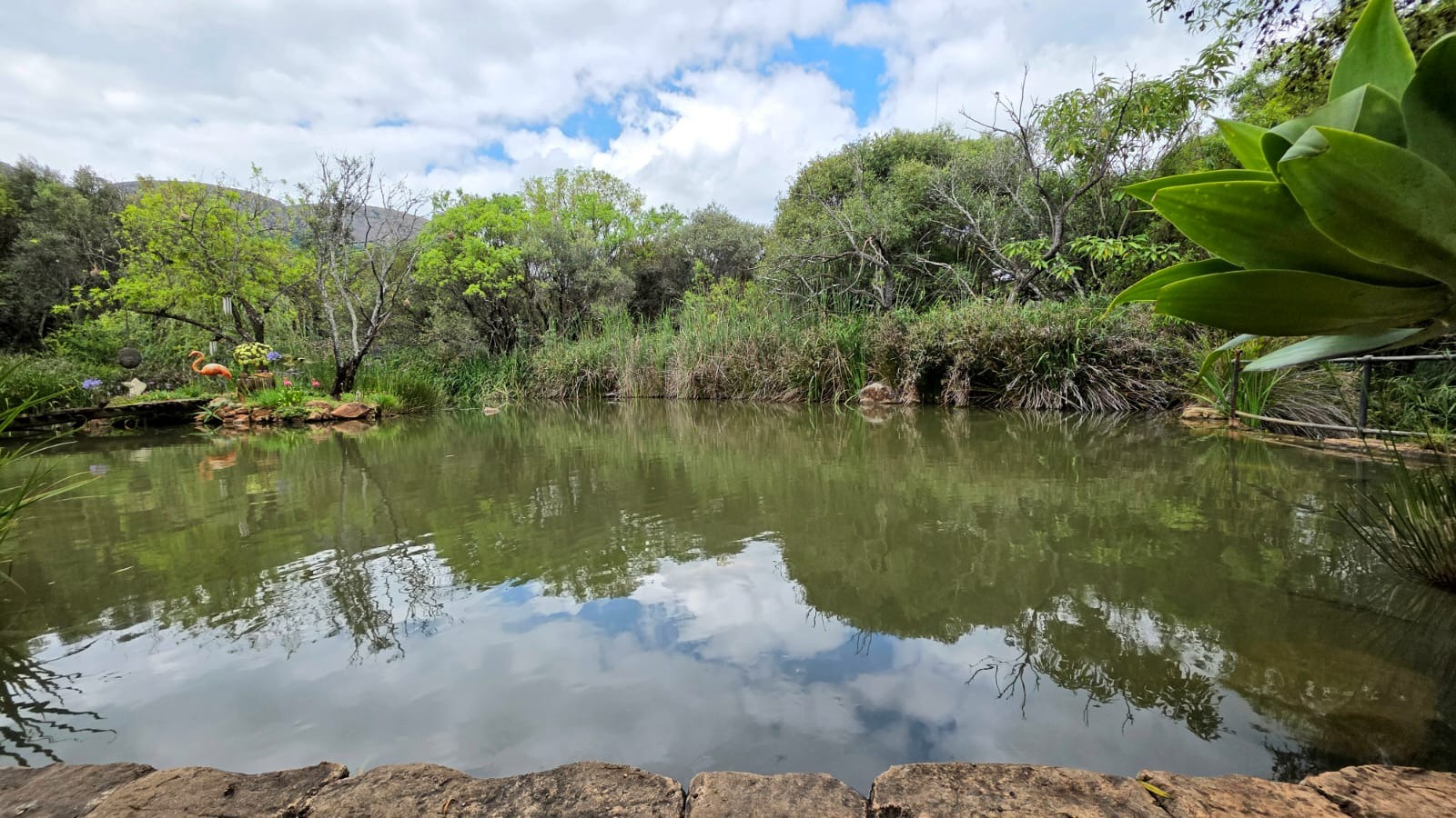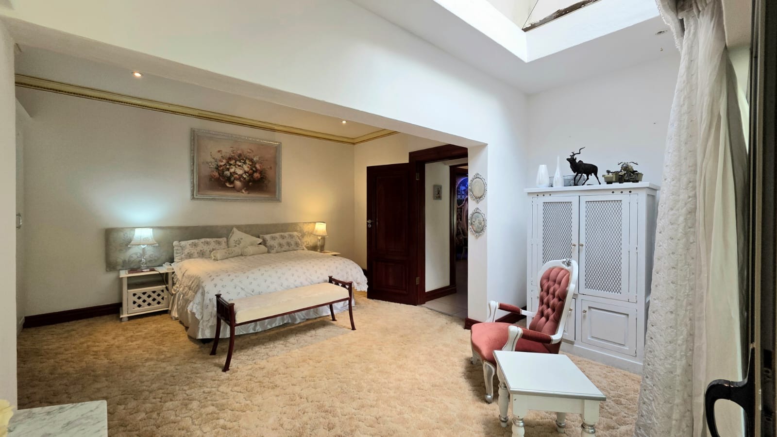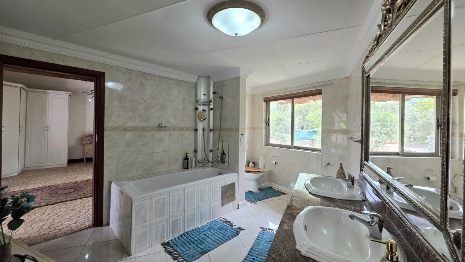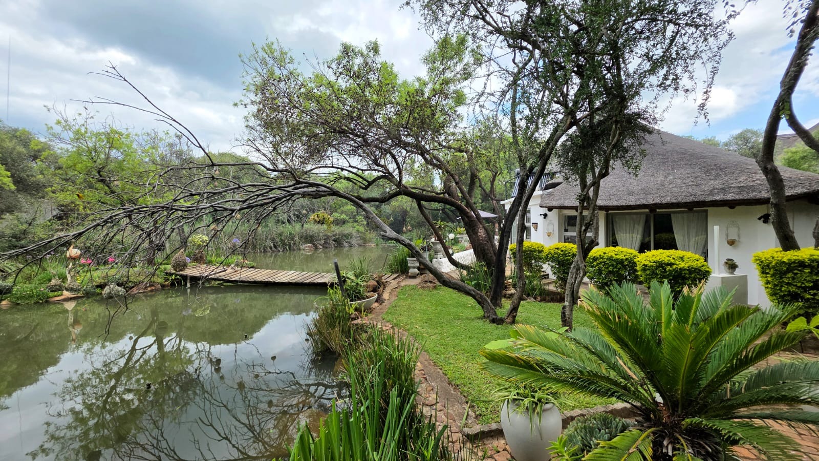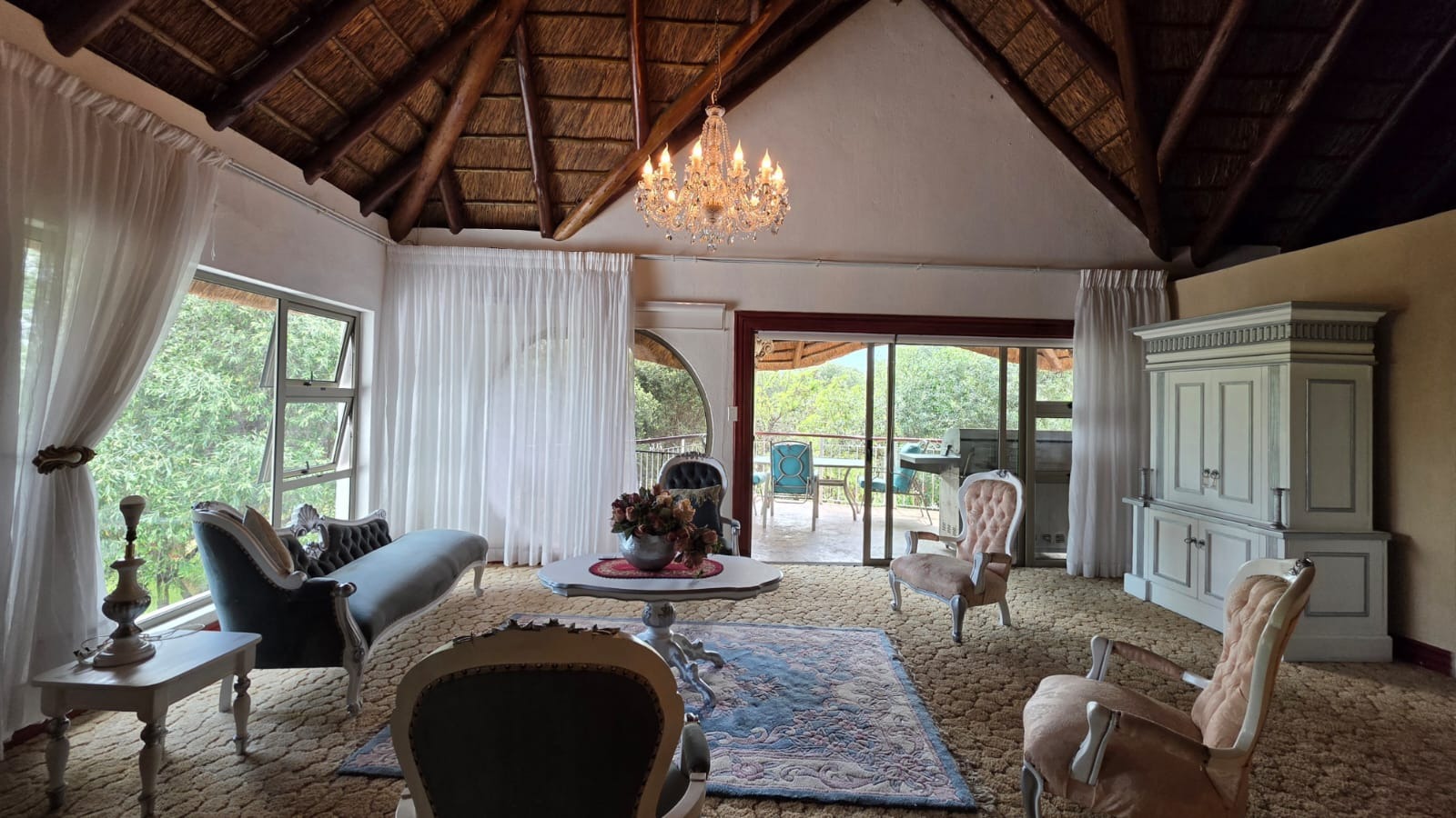 Nestled within the exclusive K’shane Security Estate in Hartbeespoort, this magnificent 1203 sqm residence on an expansive 8023 sqm erf offers an unmatched lifestyle in a pristine nature reserve and wildlife sanctuary. The home immediately impresses with its unique architectural charm, including rustic thatch-roofed accents, a rounded feature window, decorative pillars, and lush mature landscaping. A serene pond with a quaint wooden footbridge enhances the idyllic setting. Inside, a grand granite staircase with intricate wrought iron railings curves beneath a sparkling crystal chandelier, while a classical mural and rich architectural elements—columns, arches, and ornate mouldings—create an atmosphere of refined luxury. Expansive open-plan living and dining spaces with high ceilings, recessed lighting, and air conditioning provide an elegant environment for both intimate gatherings and large-scale entertaining.