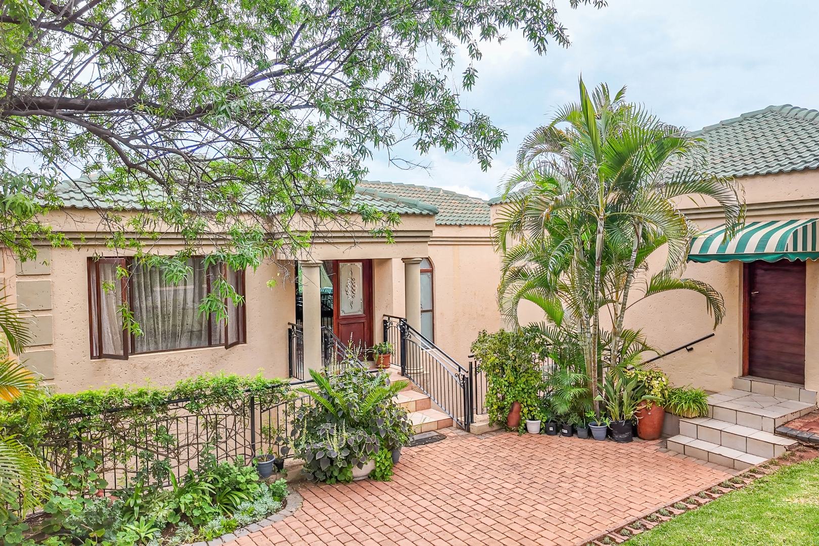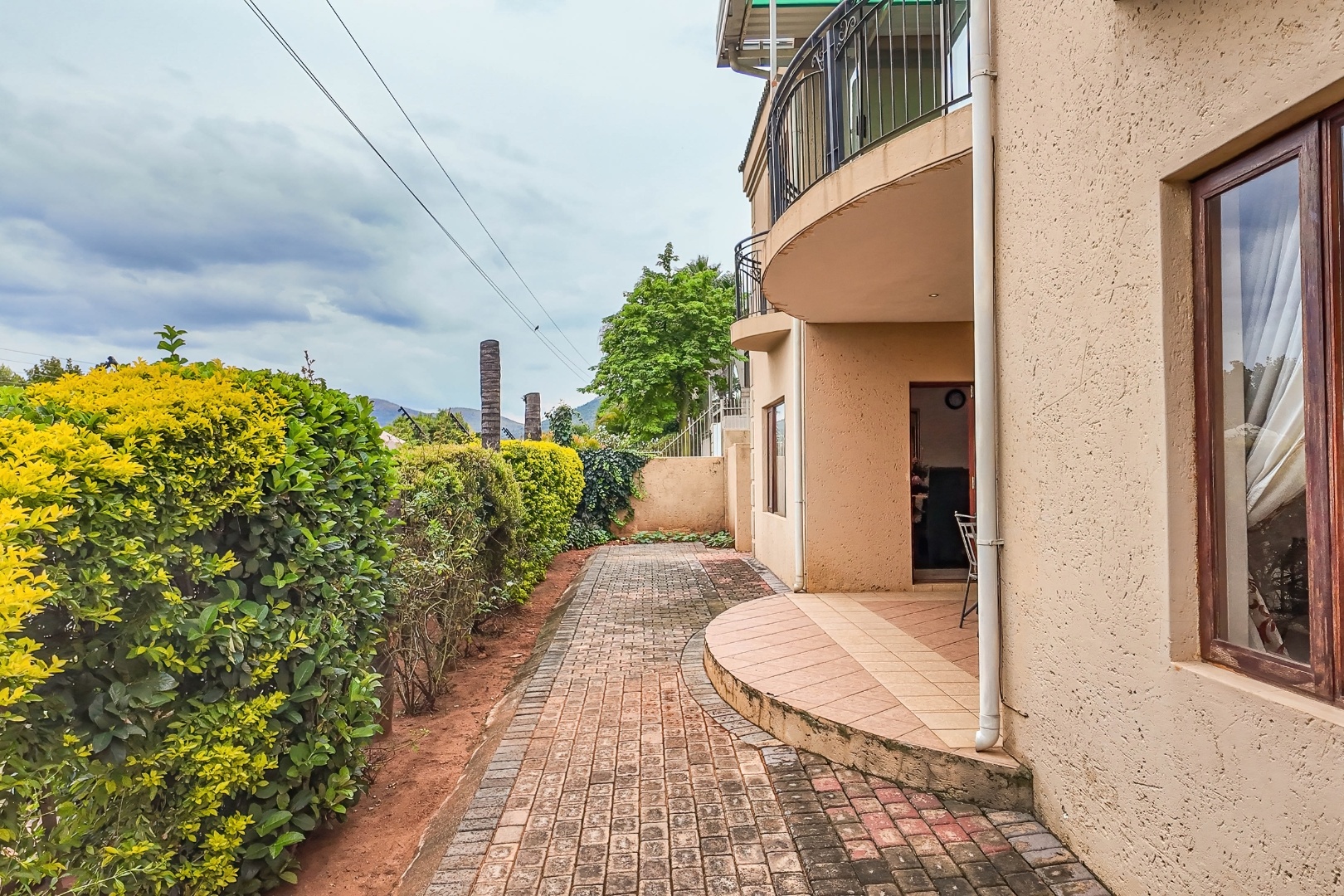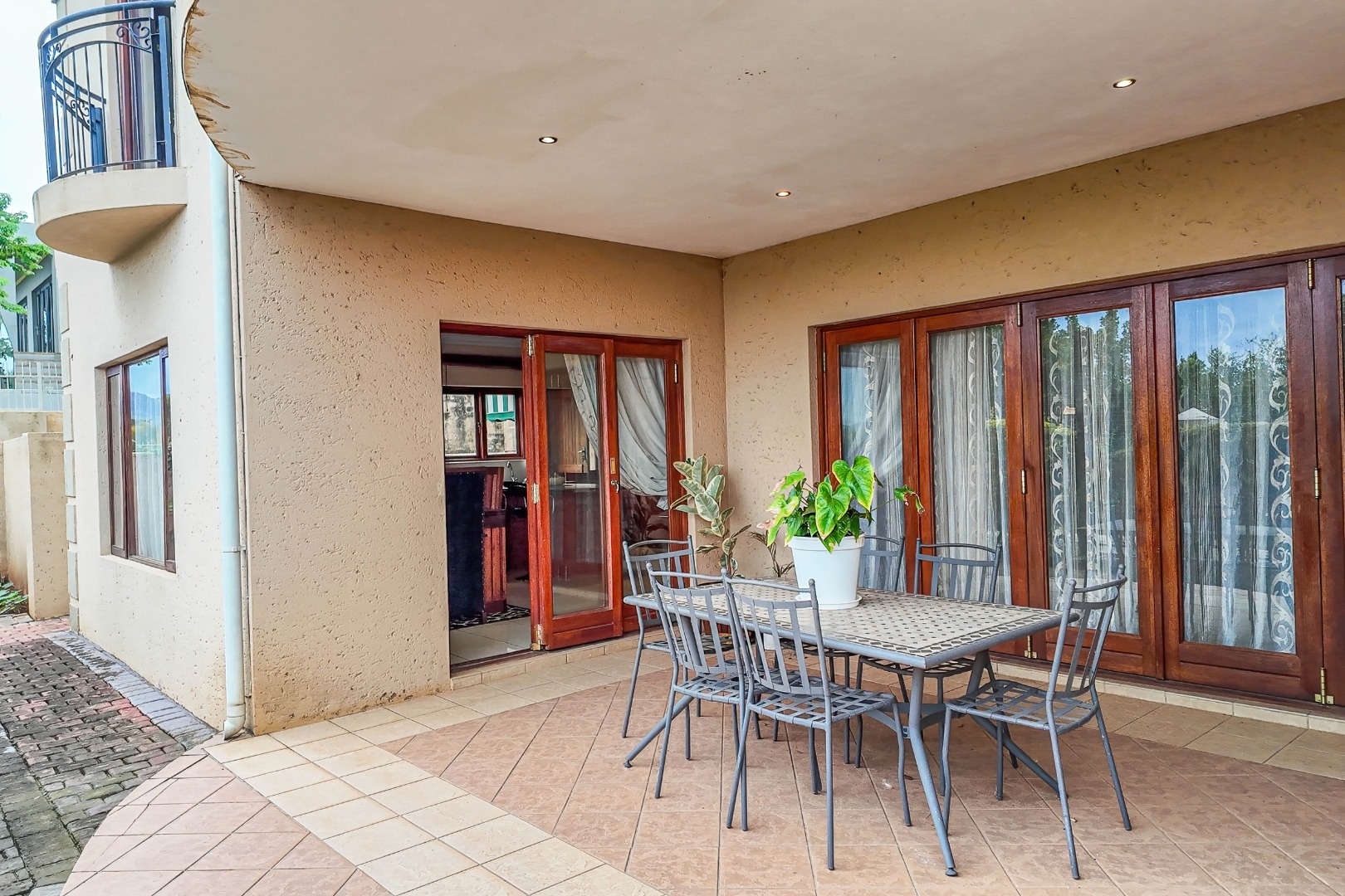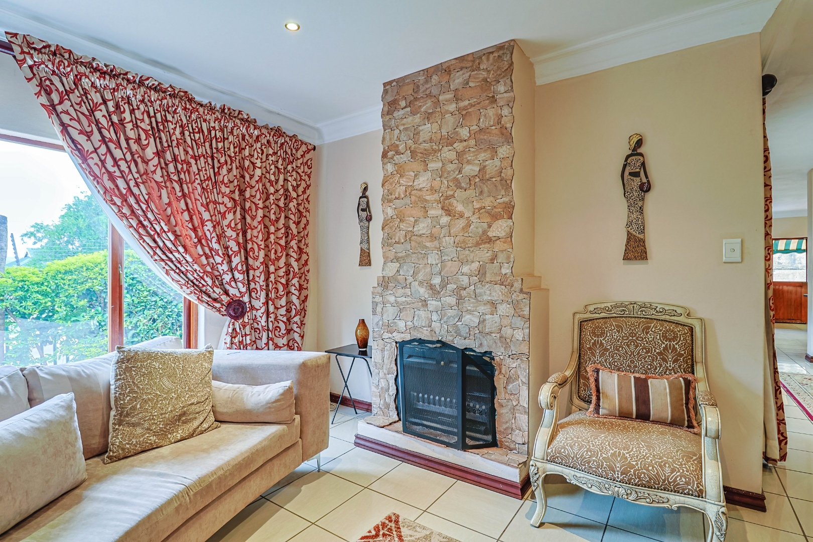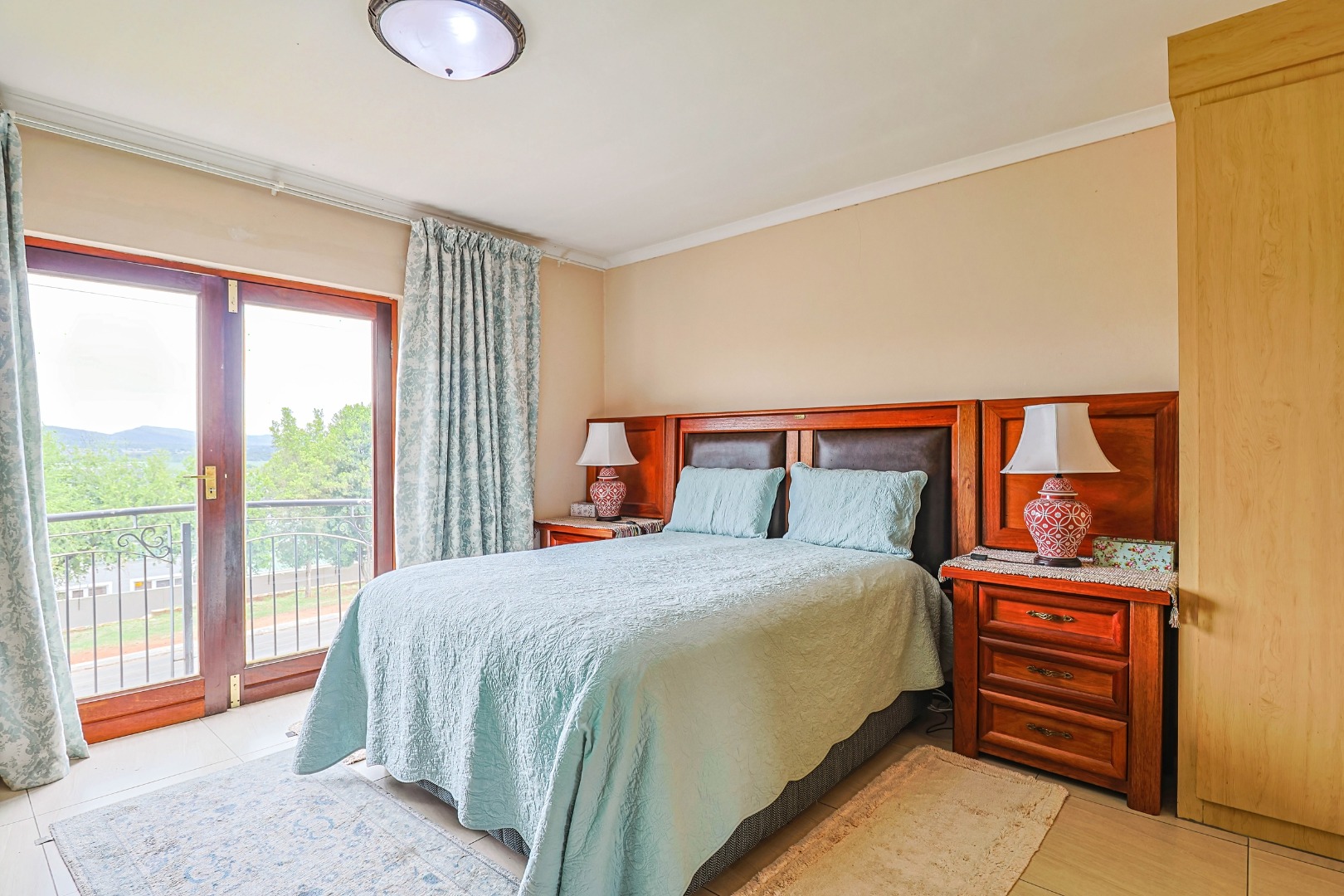 Discover this inviting 3-bedroom, 2-bathroom home set within the secure Kosmos Ridge estate in Hartbeespoort. The property offers excellent kerb appeal with distinctive architecture, wrought-iron railings, a paved brick driveway, and a beautifully maintained tropical garden. Inside, generous living areas include two lounges, a dining room, and a family TV room, all tiled and enhanced by crown moulding, large windows, and a cosy fireplace. An enclosed veranda captures panoramic views of the treed surroundings and distant hills, ideal for relaxing or entertaining.