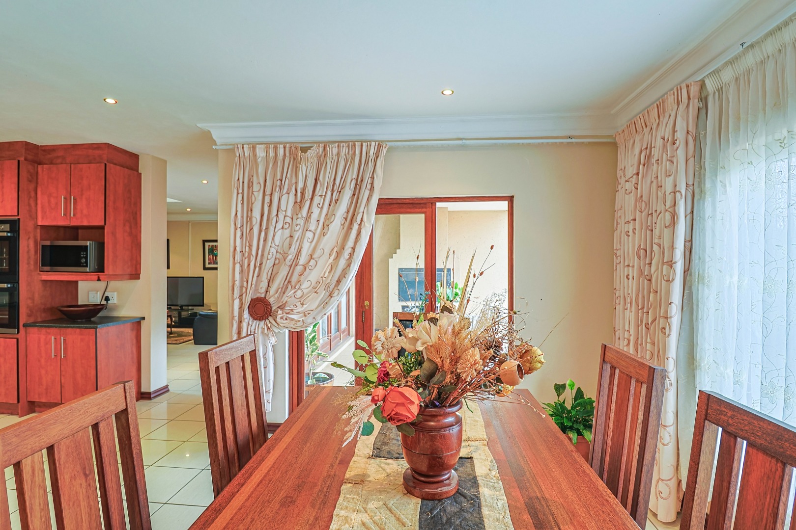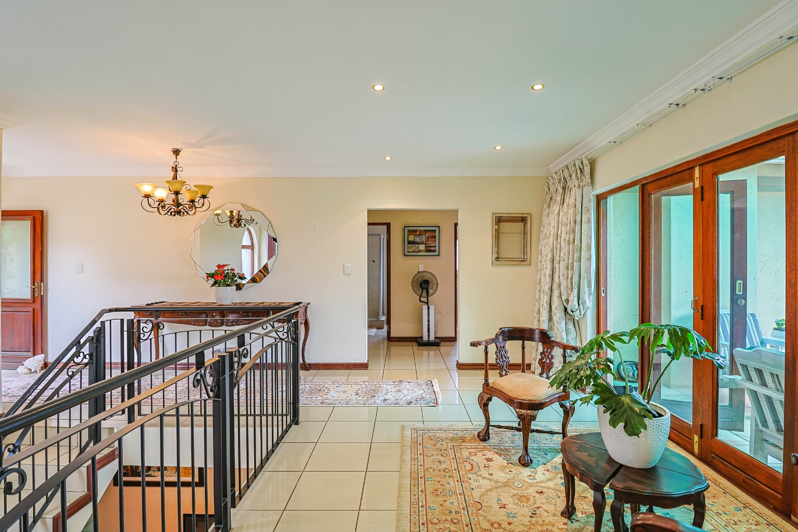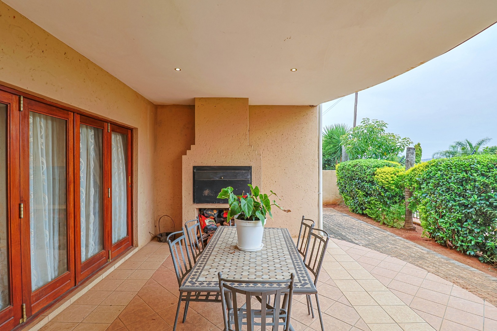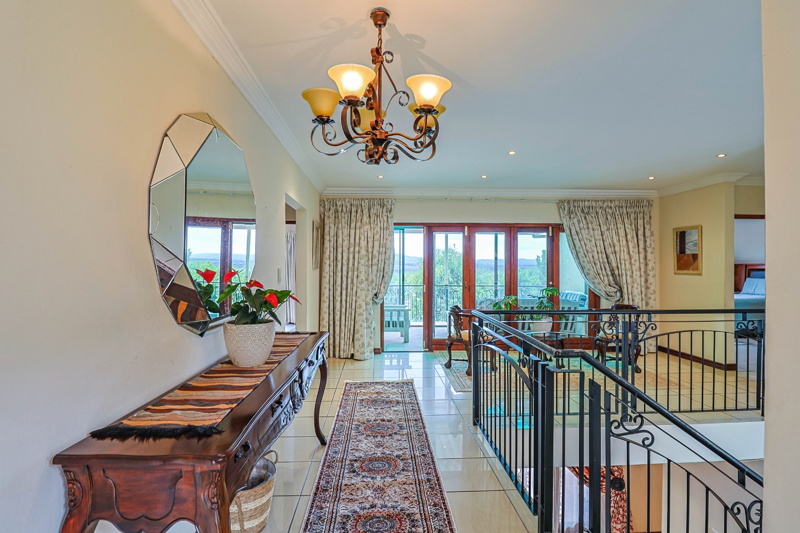 Discover this inviting 3-bedroom, 2-bathroom home set within the secure Kosmos Ridge estate in Hartbeespoort. The property offers excellent kerb appeal with distinctive architecture, wrought-iron railings, a paved brick driveway, and a beautifully maintained tropical garden. Inside, generous living areas include two lounges, a dining room, and a family TV room, all tiled and enhanced by crown moulding, large windows, and a cosy fireplace. An enclosed veranda captures panoramic views of the treed surroundings and distant hills, ideal for relaxing or entertaining.