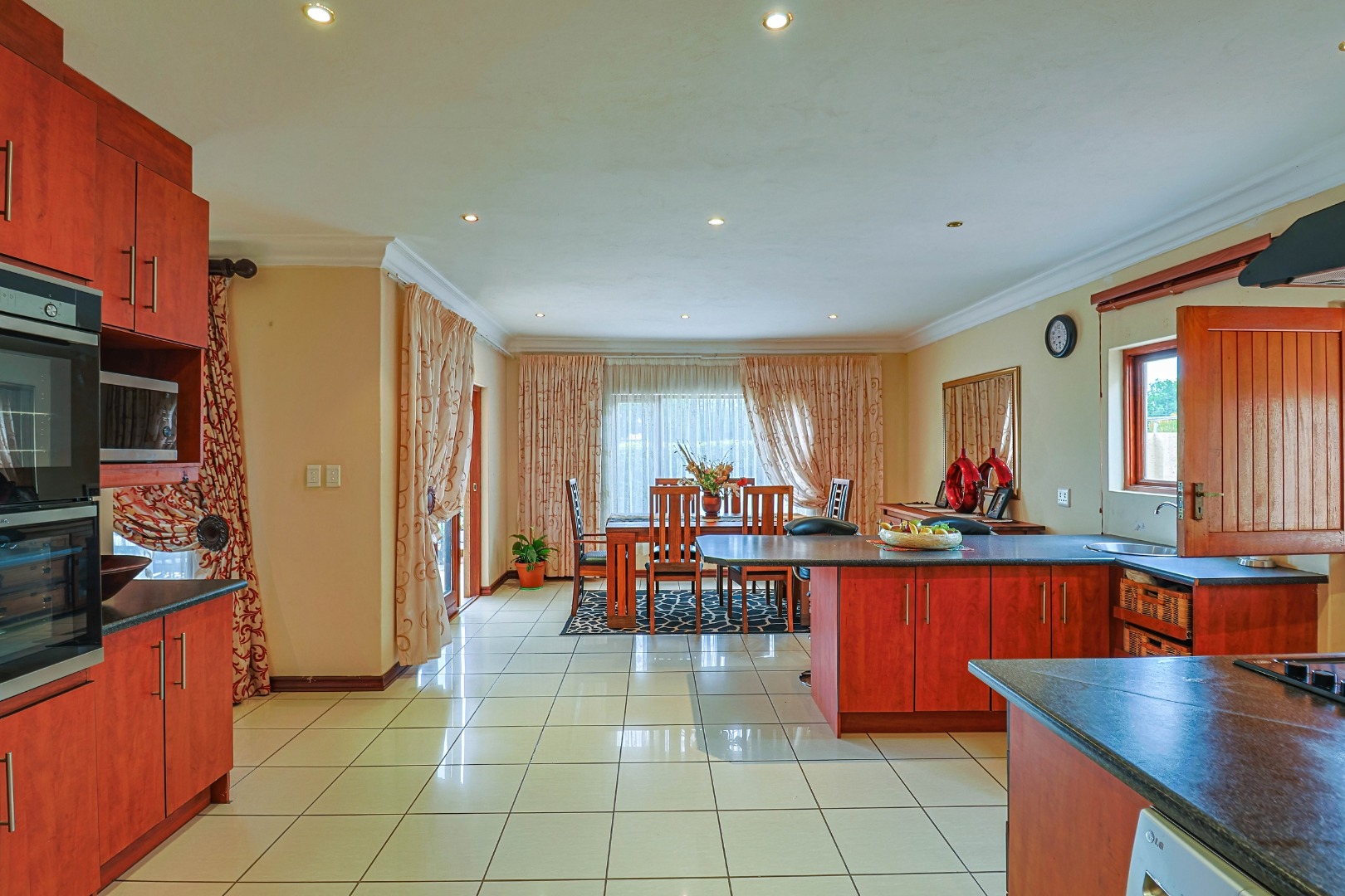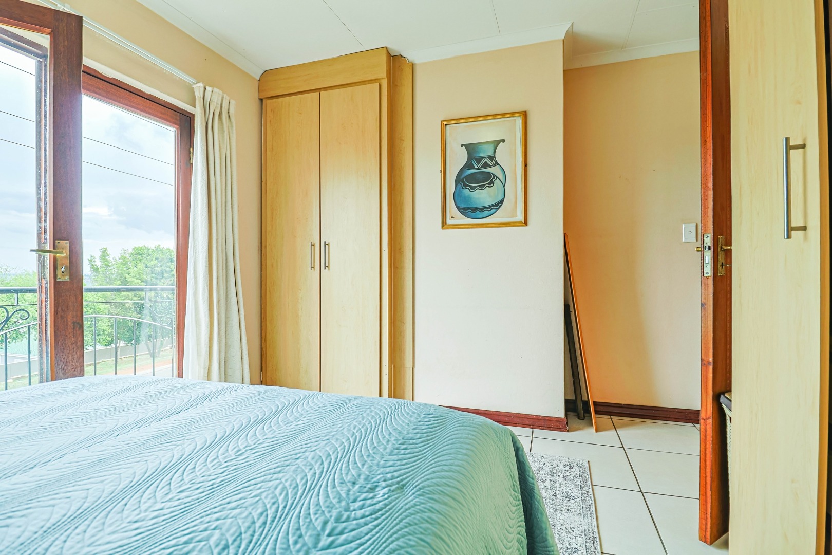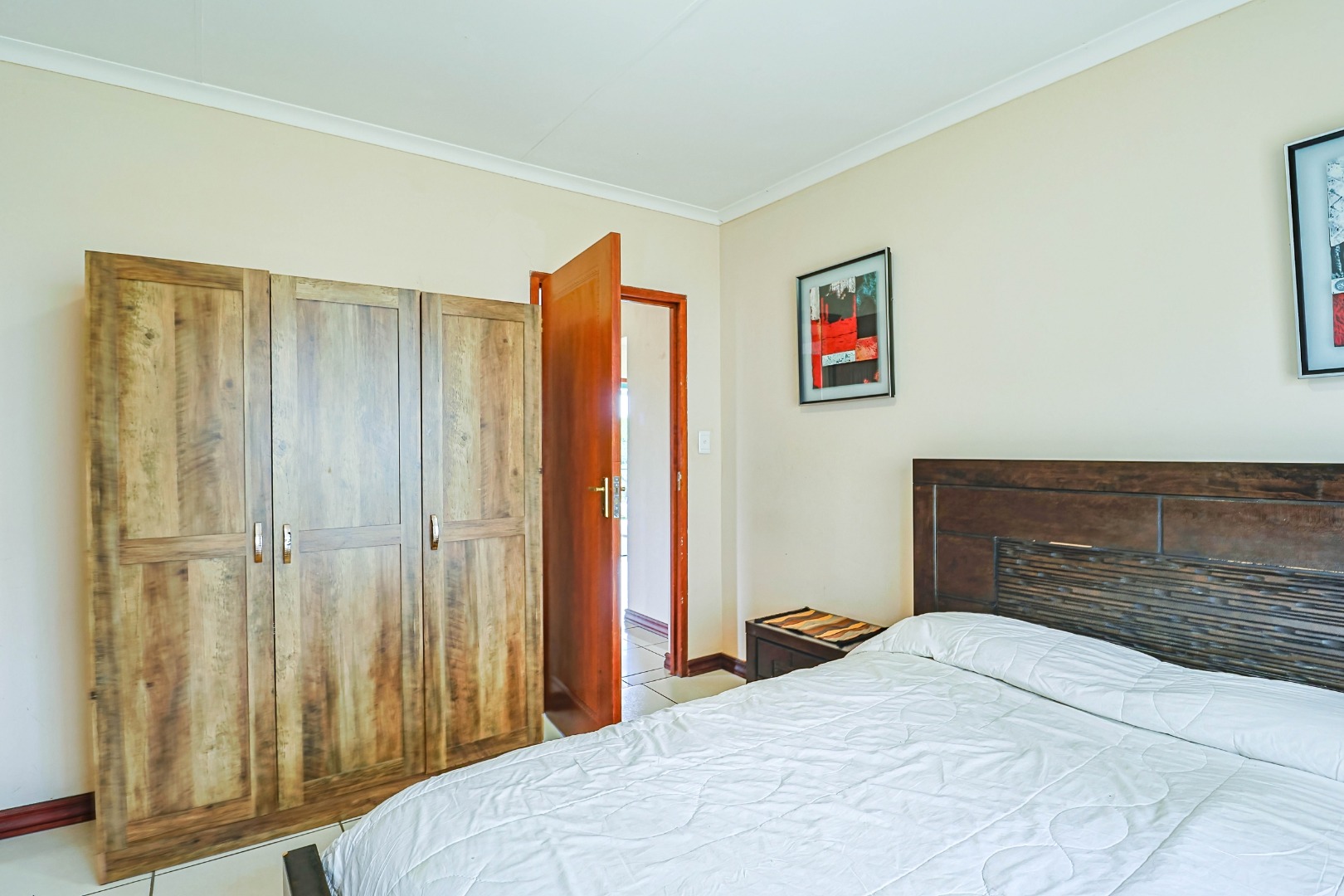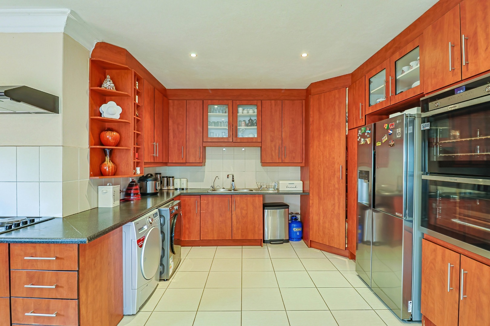 The functional kitchen features ample wooden cabinetry, dark countertops, a gas hob with extractor fan, double sink, and space for a washing machine and dryer. Accommodation includes three comfortable bedrooms, one en-suite, an additional full bathroom, and a guest toilet, plus staff quarters. Outdoors you’ll find a built-in braai, a well-kept garden, a double garage, and extra parking. With 24-hour security, electric fencing, access control, and pet-friendly living, this home offers a peaceful, secure lifestyle in one of Hartbeespoort’s most scenic estates.