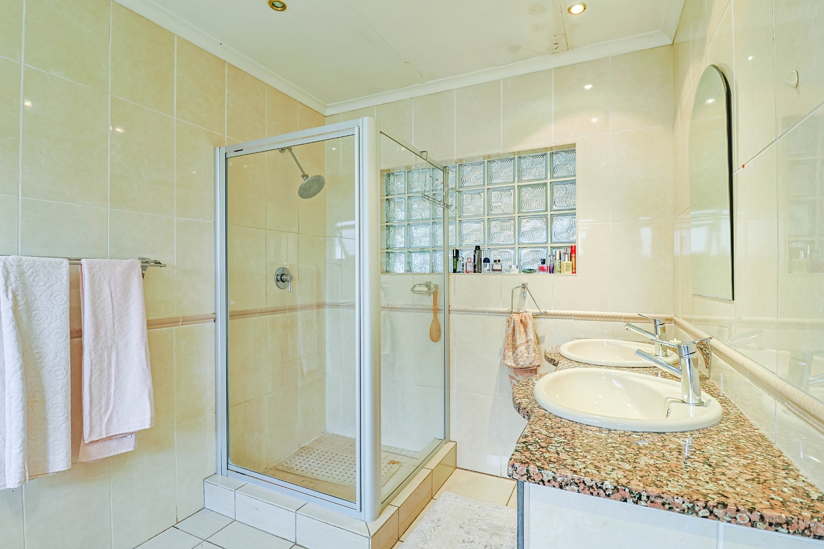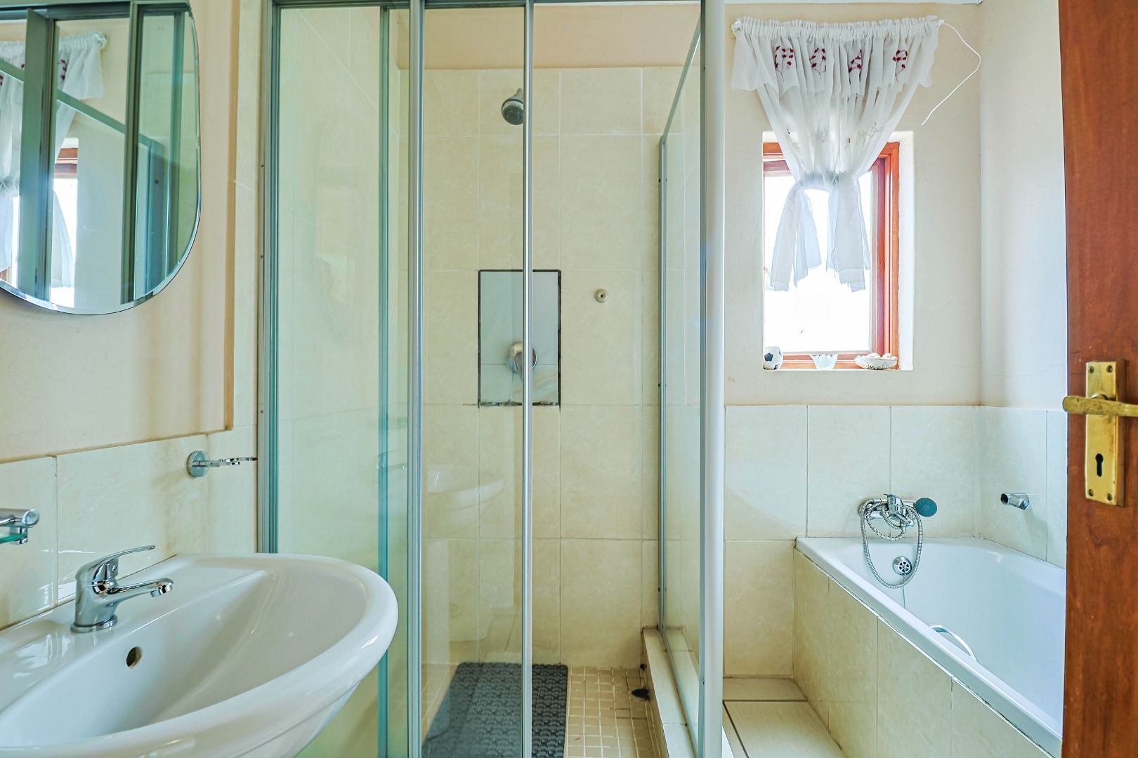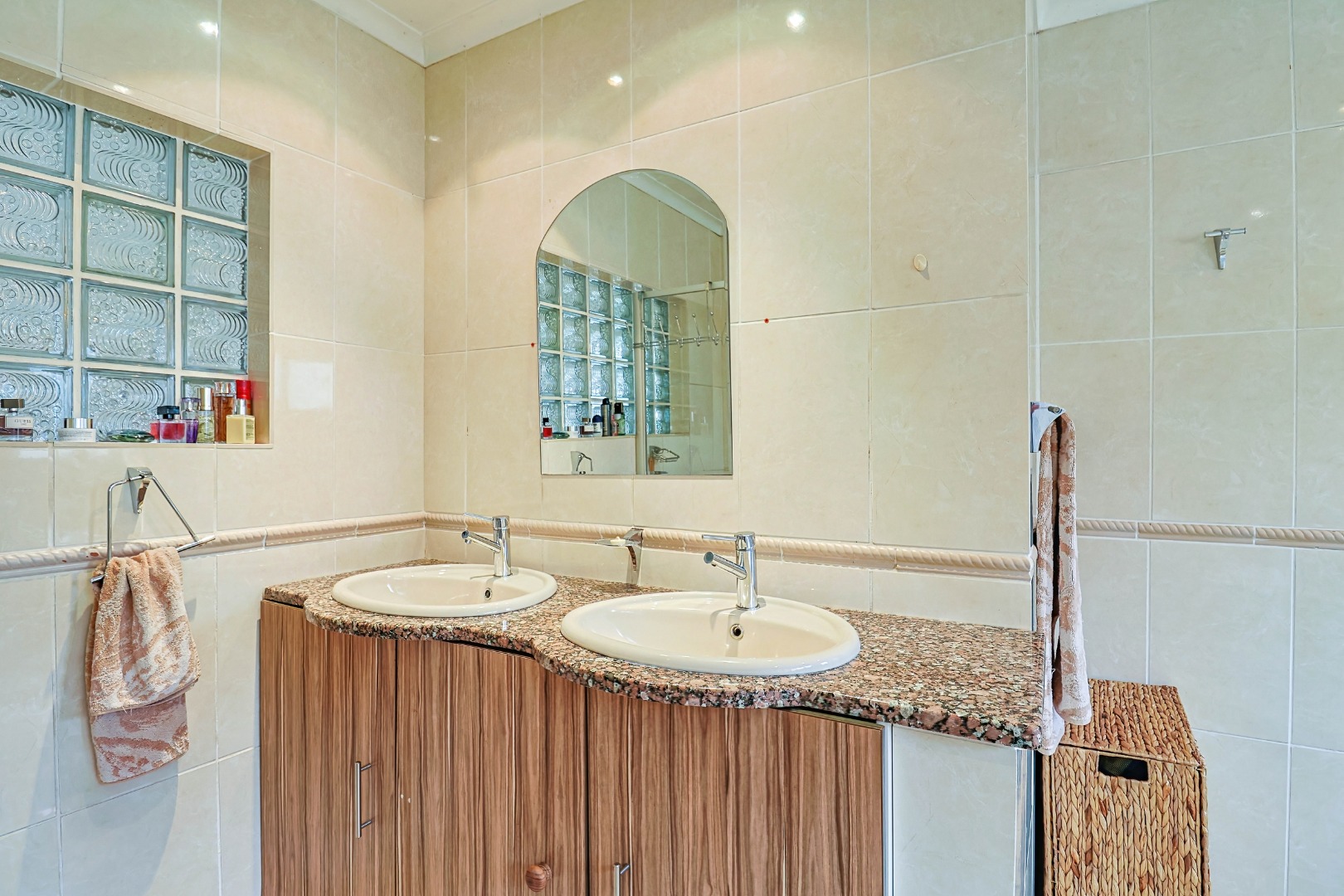 The functional kitchen features ample wooden cabinetry, dark countertops, a gas hob with extractor fan, double sink, and space for a washing machine and dryer. Accommodation includes three comfortable bedrooms, one en-suite, an additional full bathroom, and a guest toilet, plus staff quarters. Outdoors you’ll find a built-in braai, a well-kept garden, a double garage, and extra parking. With 24-hour security, electric fencing, access control, and pet-friendly living, this home offers a peaceful, secure lifestyle in one of Hartbeespoort’s most scenic estates.