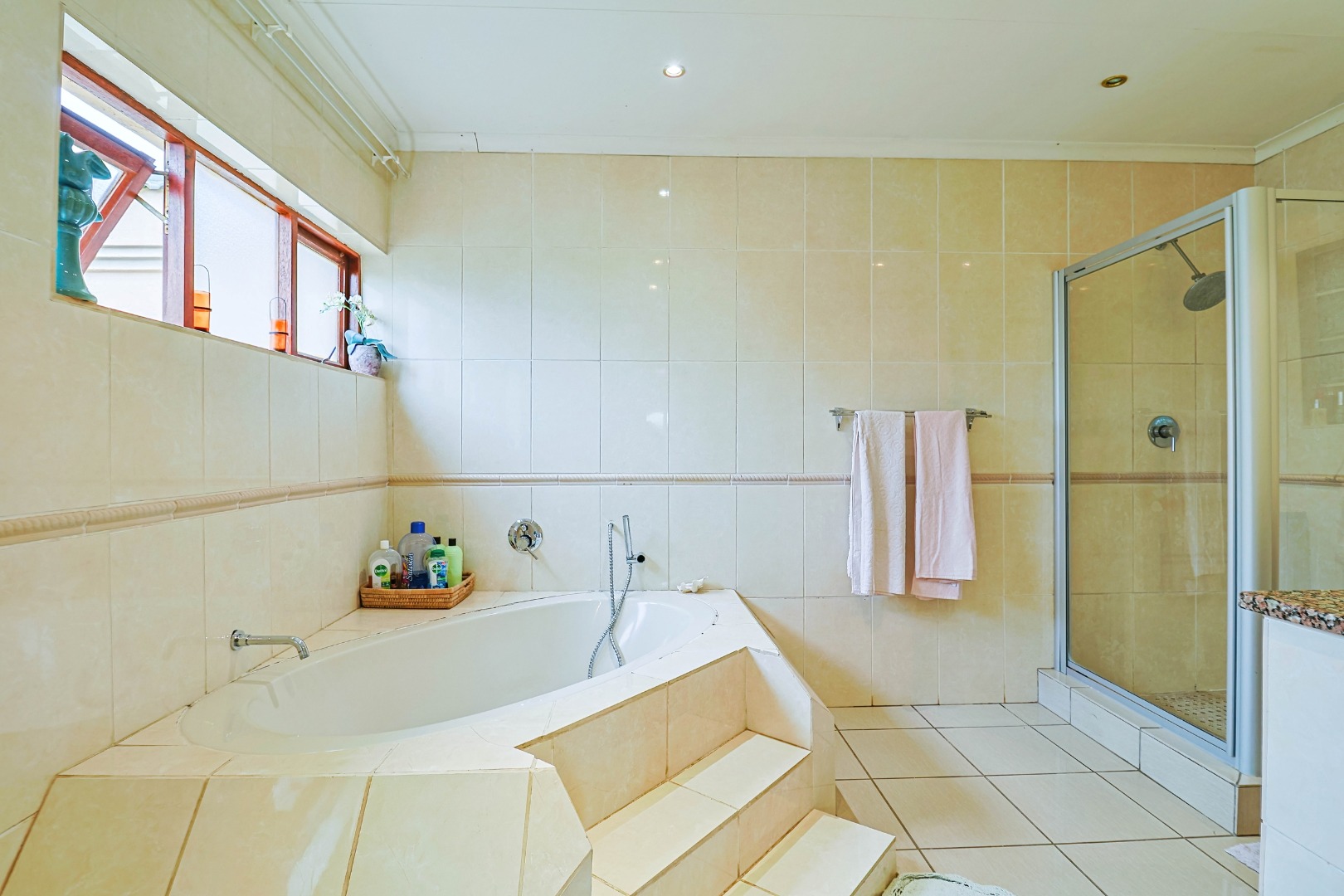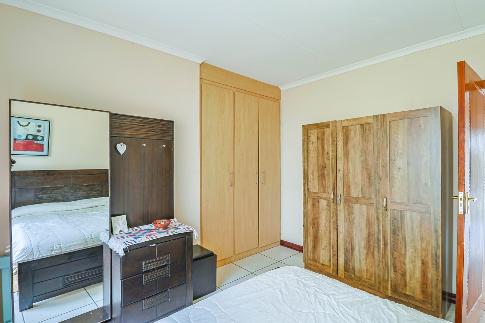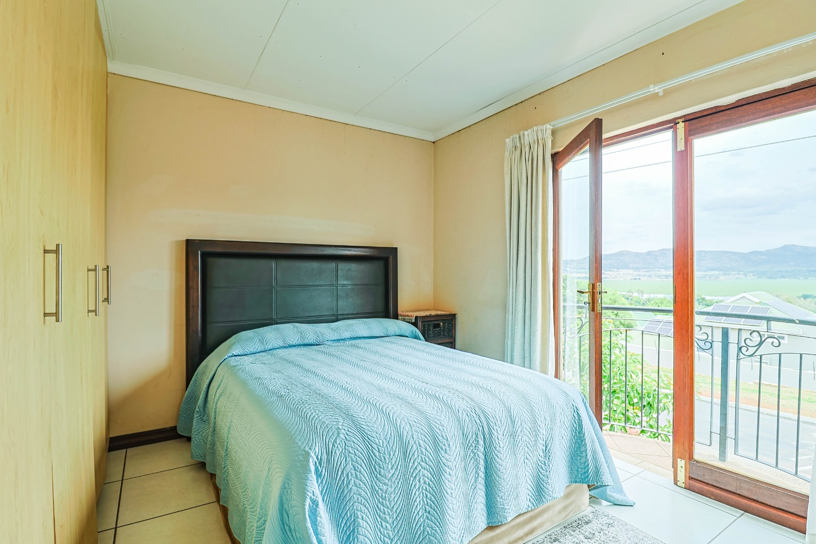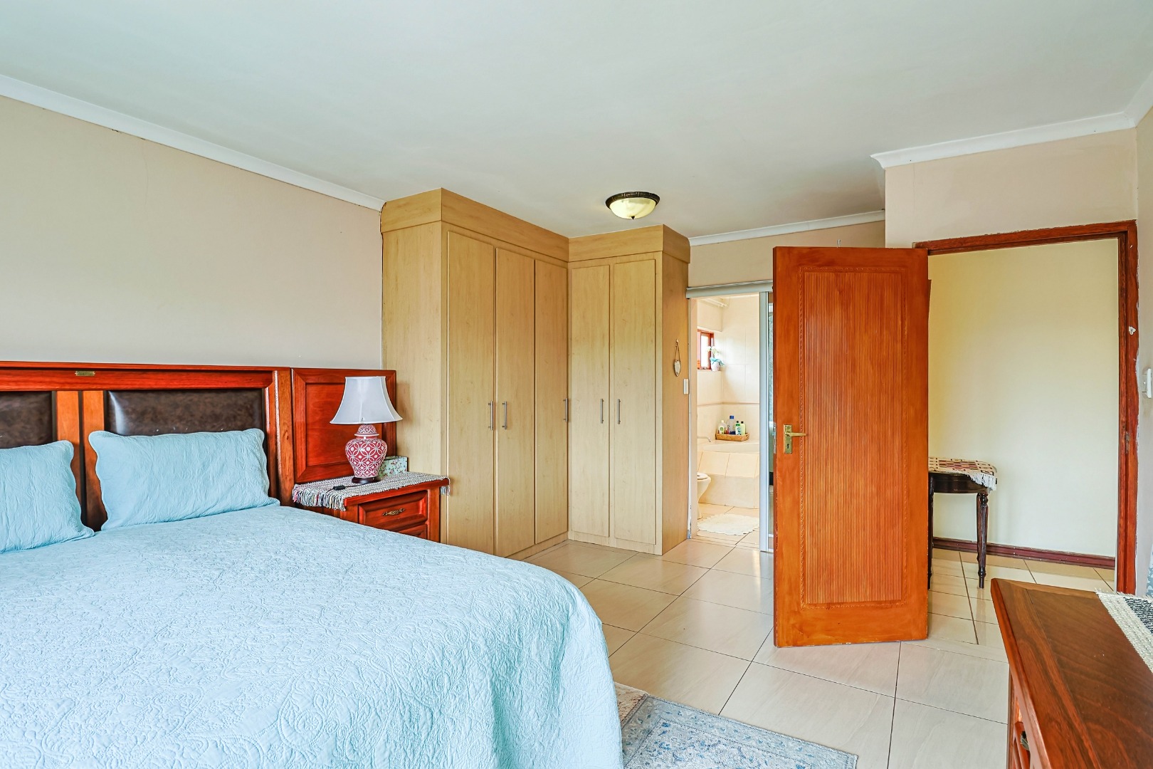 The functional kitchen features ample wooden cabinetry, dark countertops, a gas hob with extractor fan, double sink, and space for a washing machine and dryer. Accommodation includes three comfortable bedrooms, one en-suite, an additional full bathroom, and a guest toilet, plus staff quarters. Outdoors you’ll find a built-in braai, a well-kept garden, a double garage, and extra parking. With 24-hour security, electric fencing, access control, and pet-friendly living, this home offers a peaceful, secure lifestyle in one of Hartbeespoort’s most scenic estates.