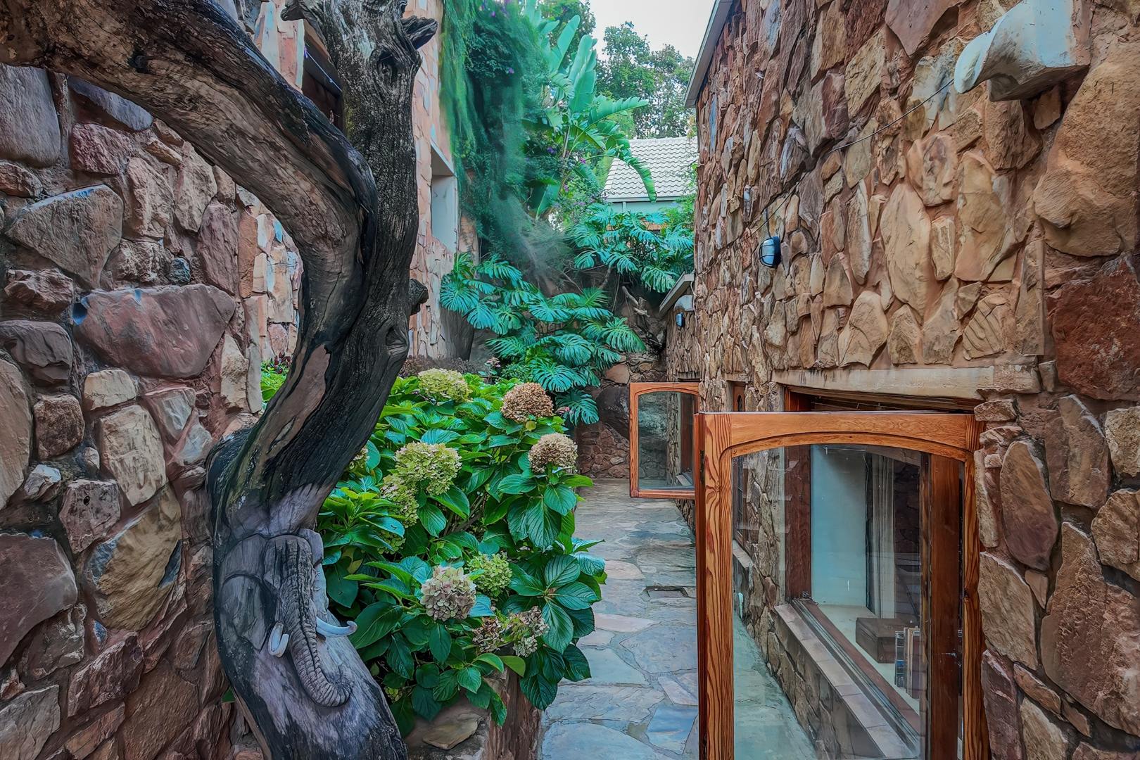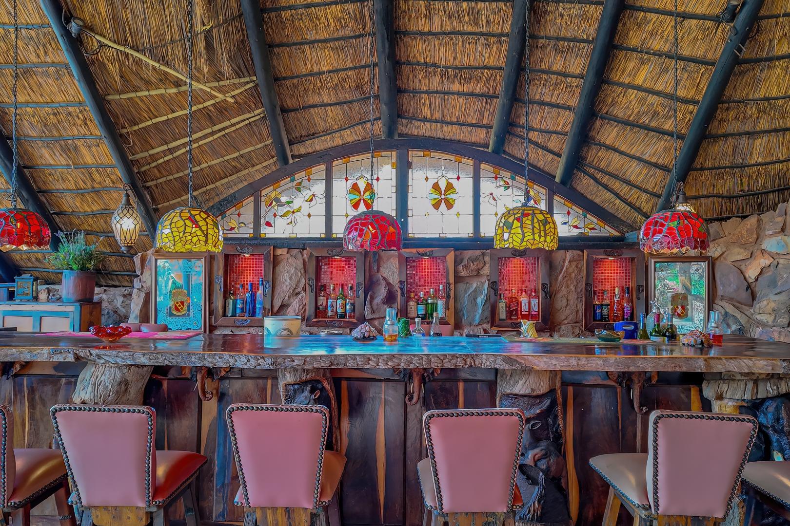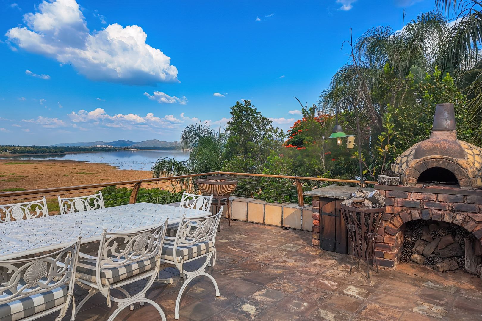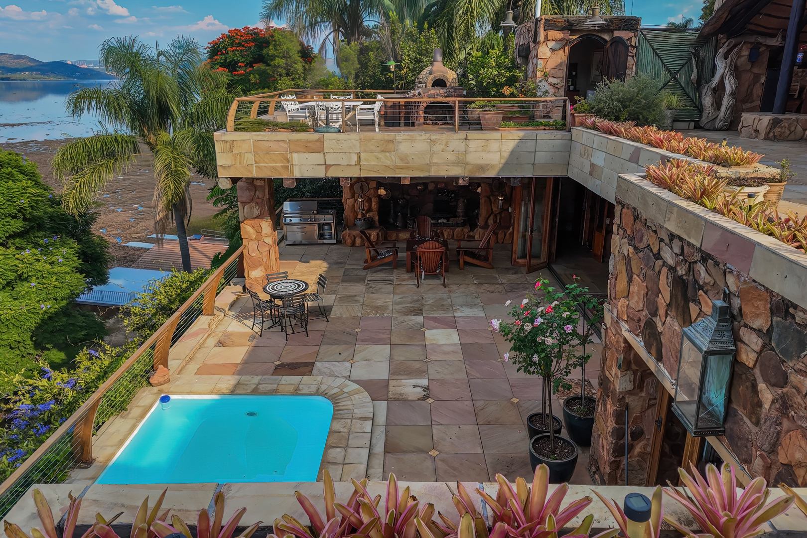 Upon entering from the four garages, you are welcomed onto a spectacular rooftop garden designed for unforgettable entertaining. This space features an enormous lapa with a handcrafted leadwood bar, elegant leaded glass windows, ambient hanging lighting, and a grand 12-seater sleeper dining table. A hot-house entertainment area flows onto a vast patio with 180-degree dam views, complete with a built-in braai and kitchenette and guest toilet - perfect for hosting on any scale. The beautifully landscaped garden is fully irrigated, completing this idyllic setting.
