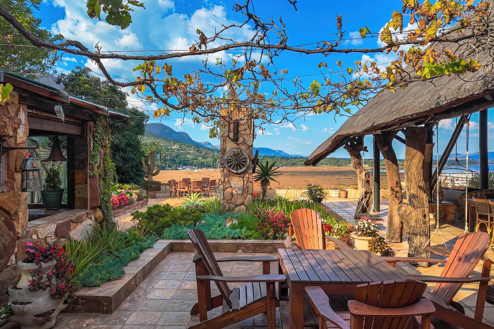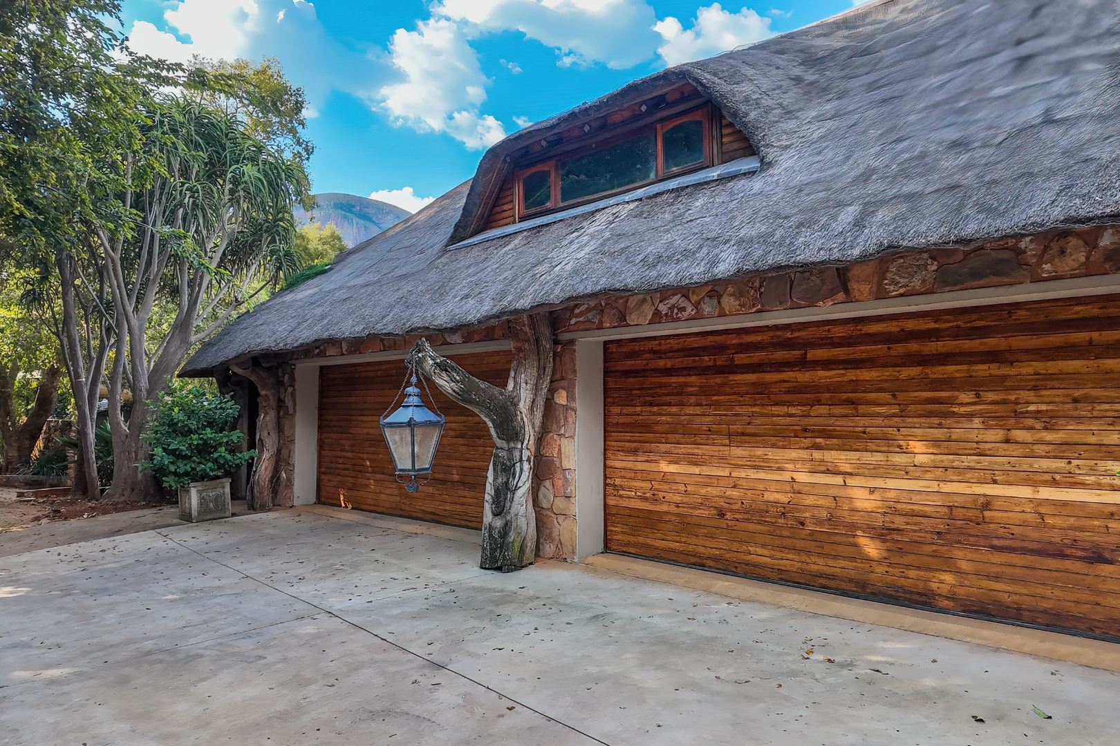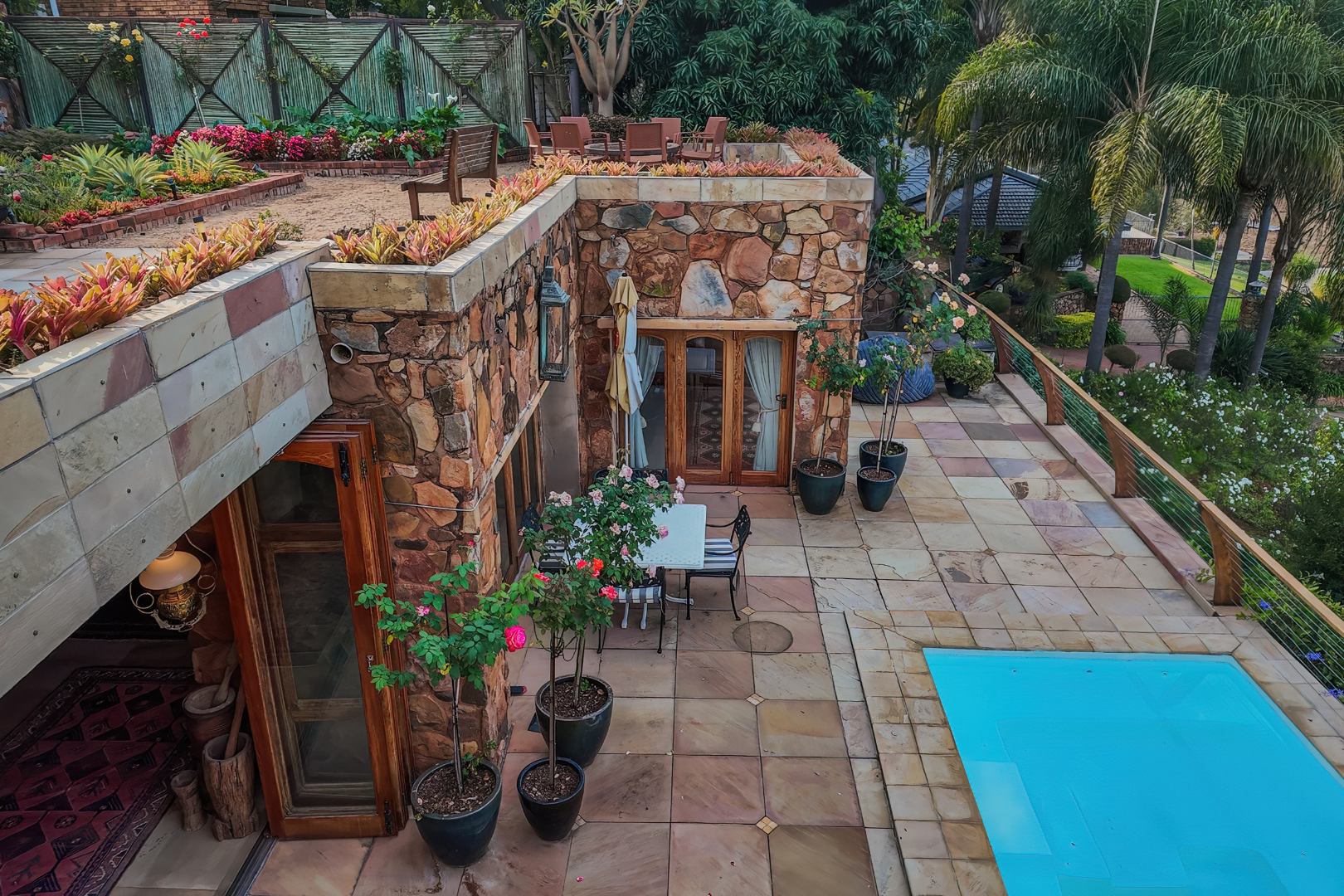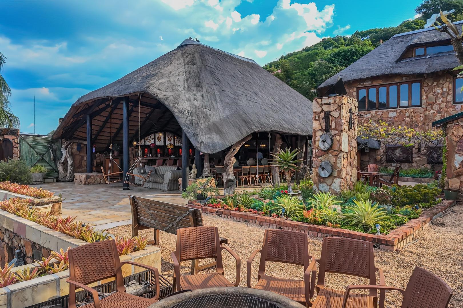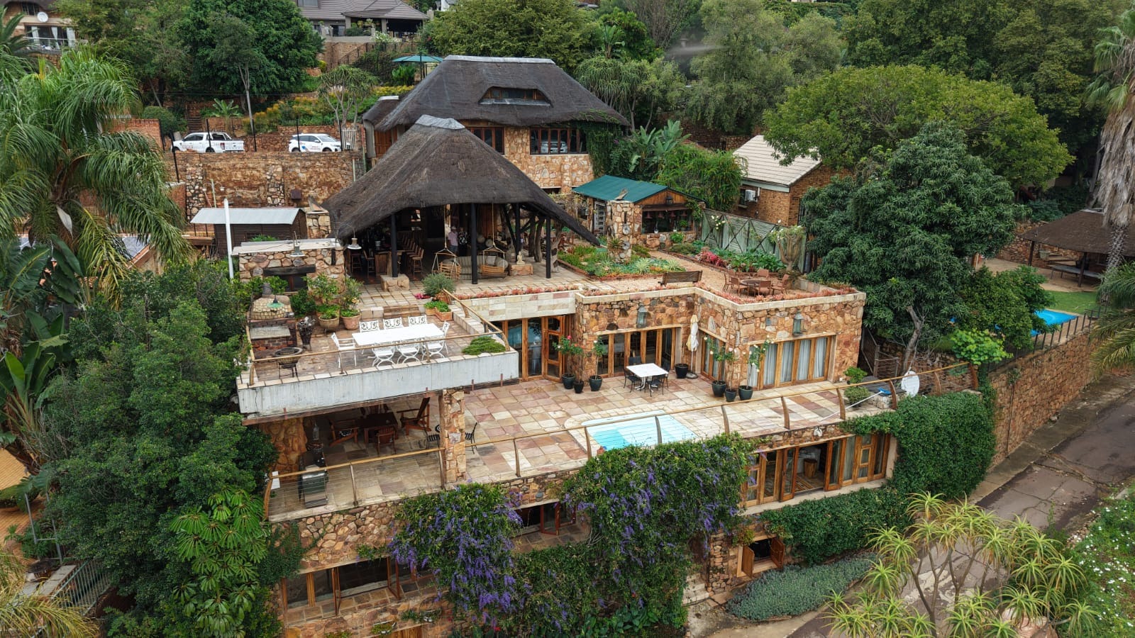 Upon entering from the four garages, you are welcomed onto a spectacular rooftop garden designed for unforgettable entertaining. This space features an enormous lapa with a handcrafted leadwood bar, elegant leaded glass windows, ambient hanging lighting, and a grand 12-seater sleeper dining table. A hot-house entertainment area flows onto a vast patio with 180-degree dam views, complete with a built-in braai and kitchenette and guest toilet - perfect for hosting on any scale. The beautifully landscaped garden is fully irrigated, completing this idyllic setting.