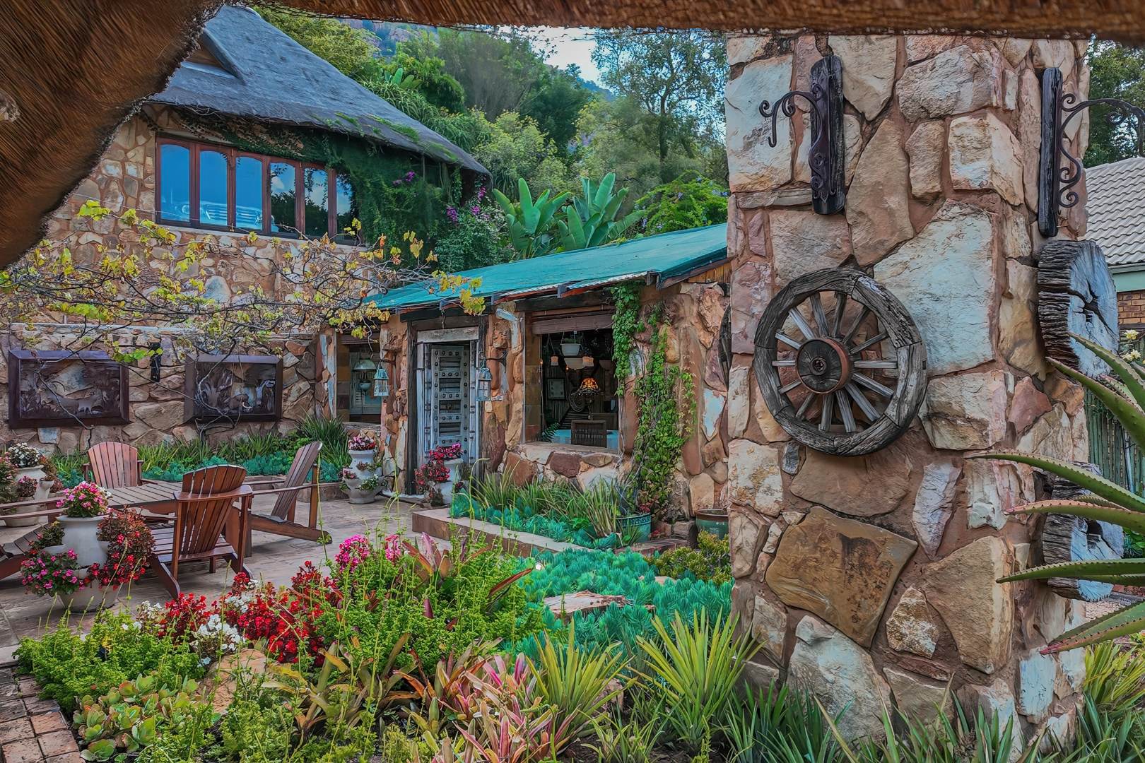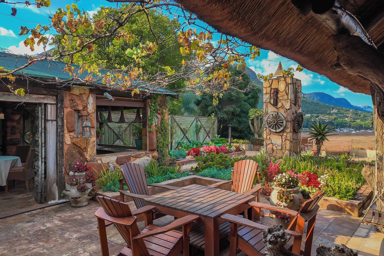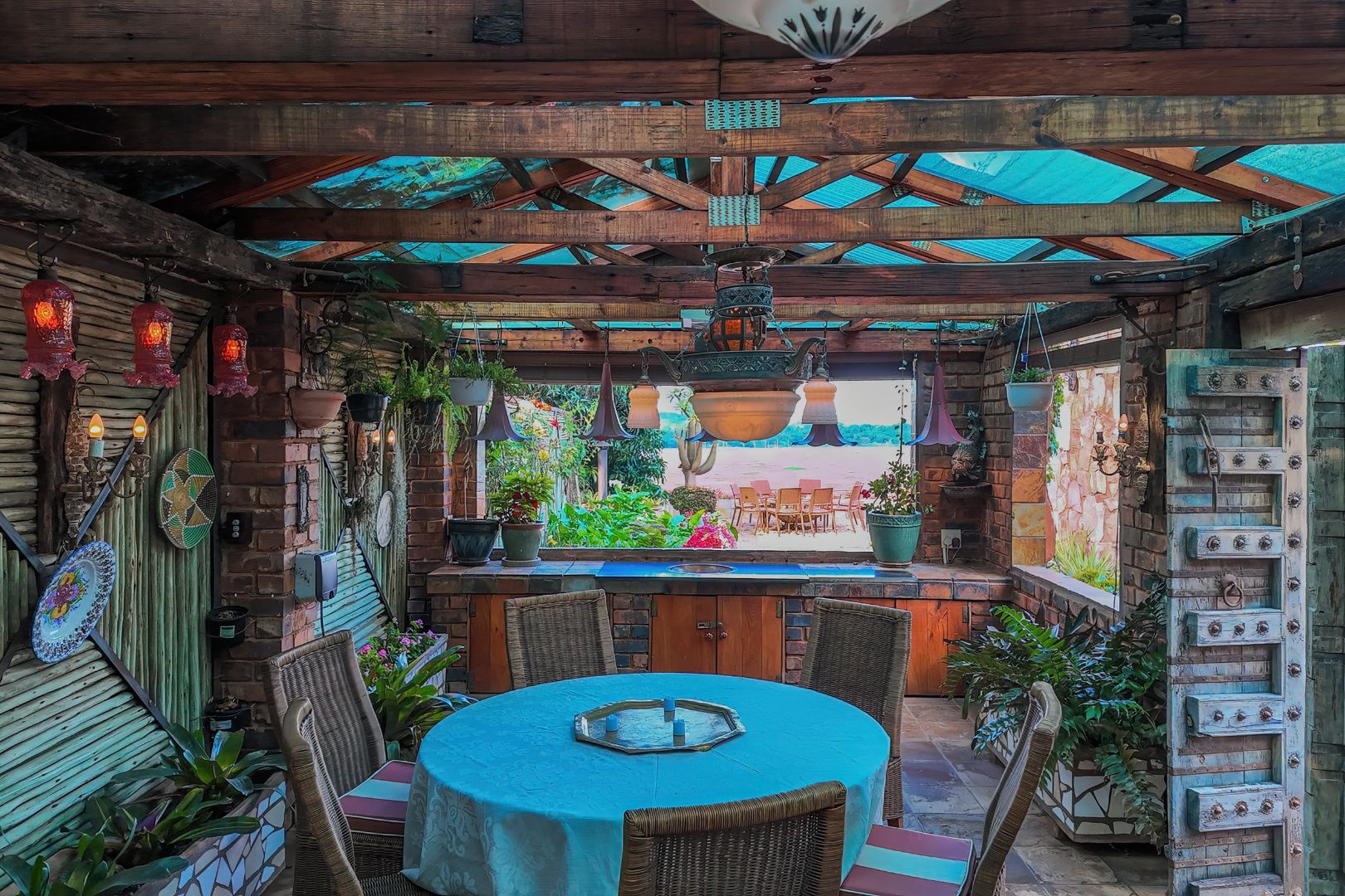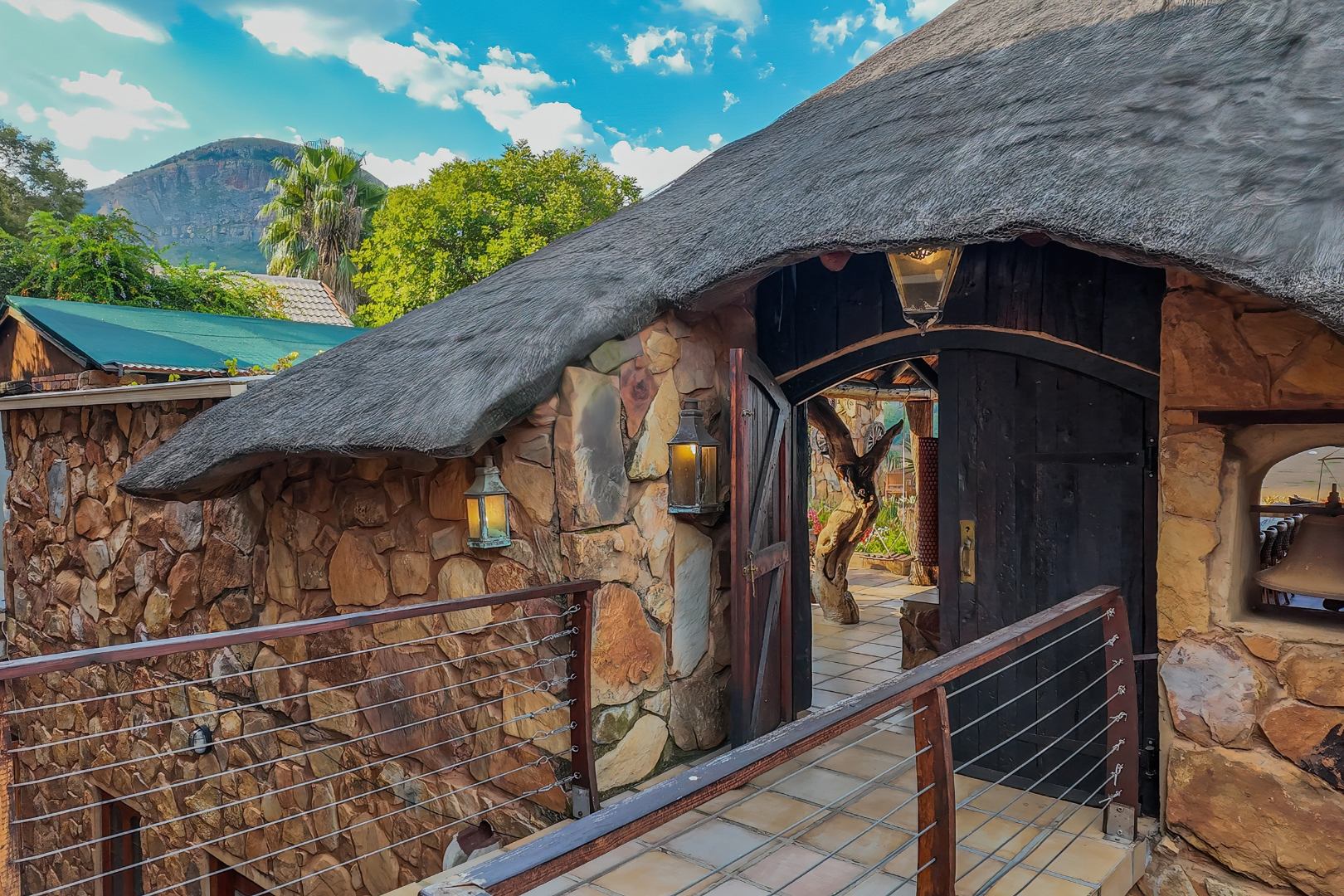 Upon entering from the four garages, you are welcomed onto a spectacular rooftop garden designed for unforgettable entertaining. This space features an enormous lapa with a handcrafted leadwood bar, elegant leaded glass windows, ambient hanging lighting, and a grand 12-seater sleeper dining table. A hot-house entertainment area flows onto a vast patio with 180-degree dam views, complete with a built-in braai and kitchenette and guest toilet - perfect for hosting on any scale. The beautifully landscaped garden is fully irrigated, completing this idyllic setting.