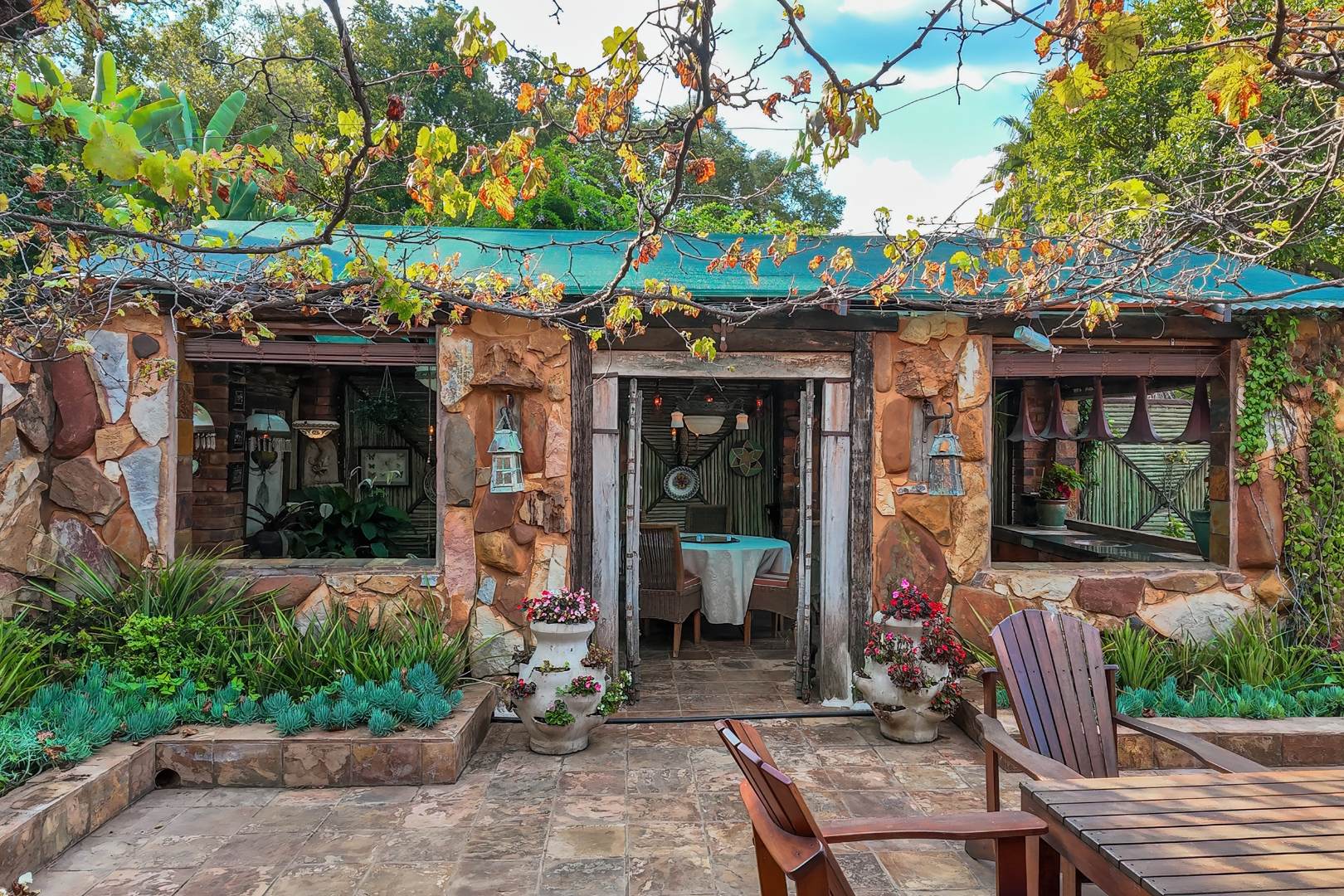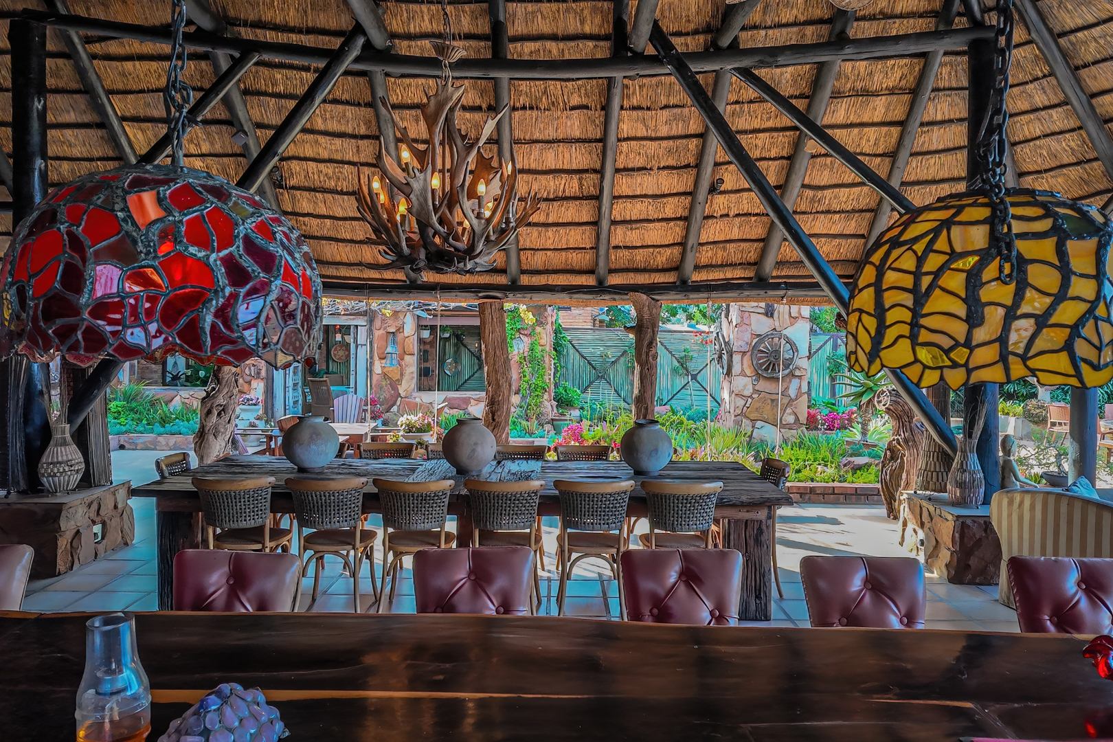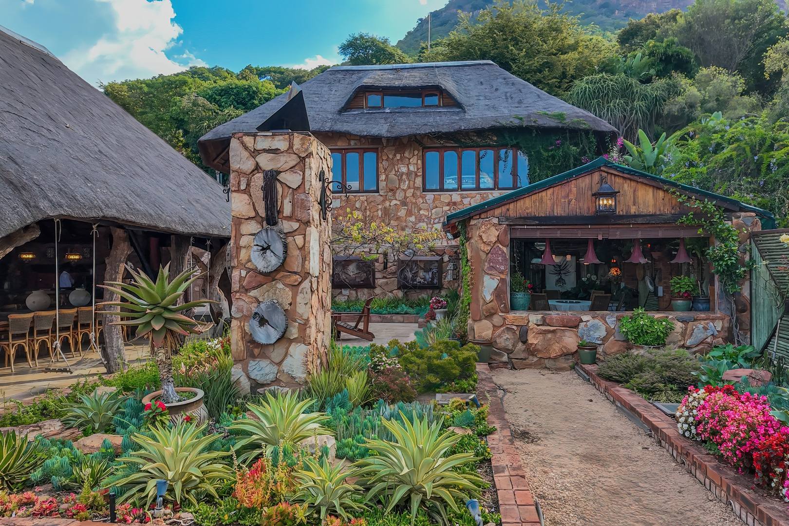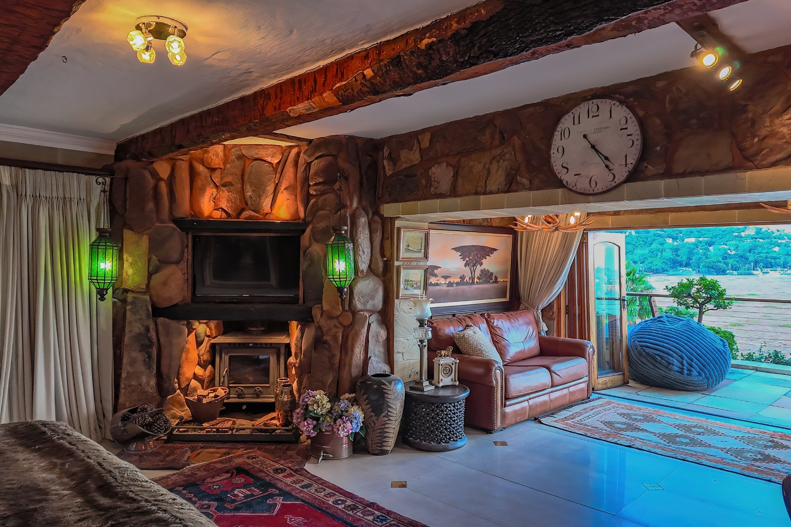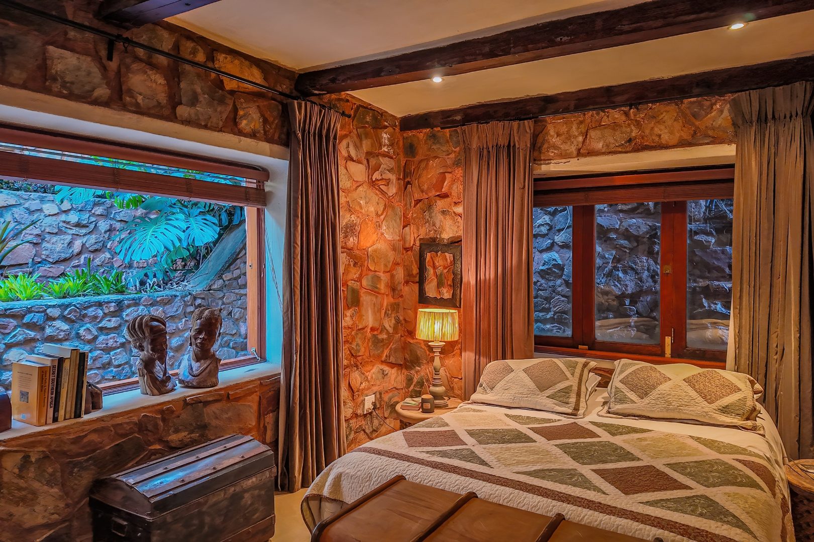 Upon entering from the four garages, you are welcomed onto a spectacular rooftop garden designed for unforgettable entertaining. This space features an enormous lapa with a handcrafted leadwood bar, elegant leaded glass windows, ambient hanging lighting, and a grand 12-seater sleeper dining table. A hot-house entertainment area flows onto a vast patio with 180-degree dam views, complete with a built-in braai and kitchenette and guest toilet - perfect for hosting on any scale. The beautifully landscaped garden is fully irrigated, completing this idyllic setting.