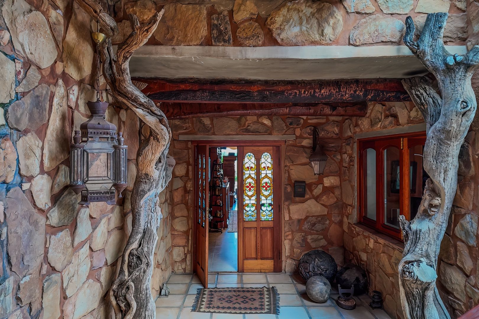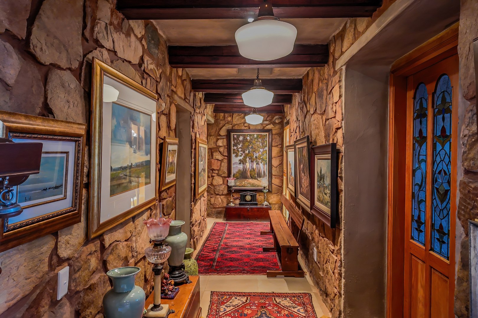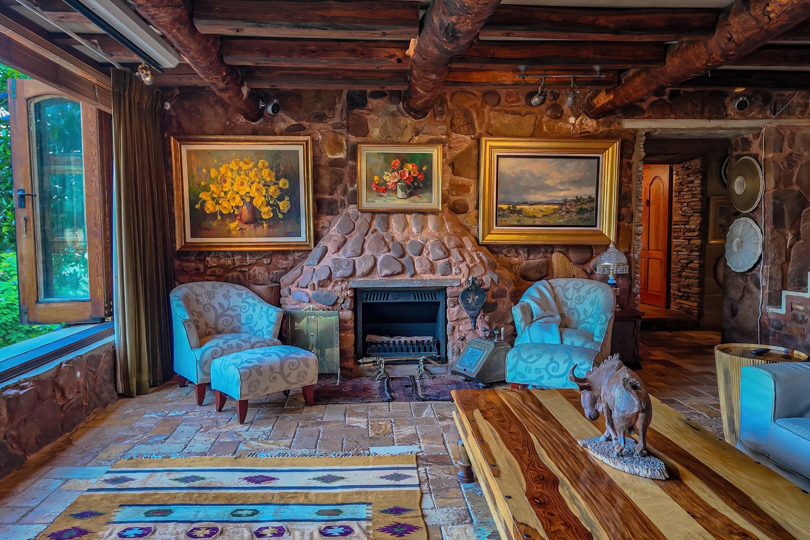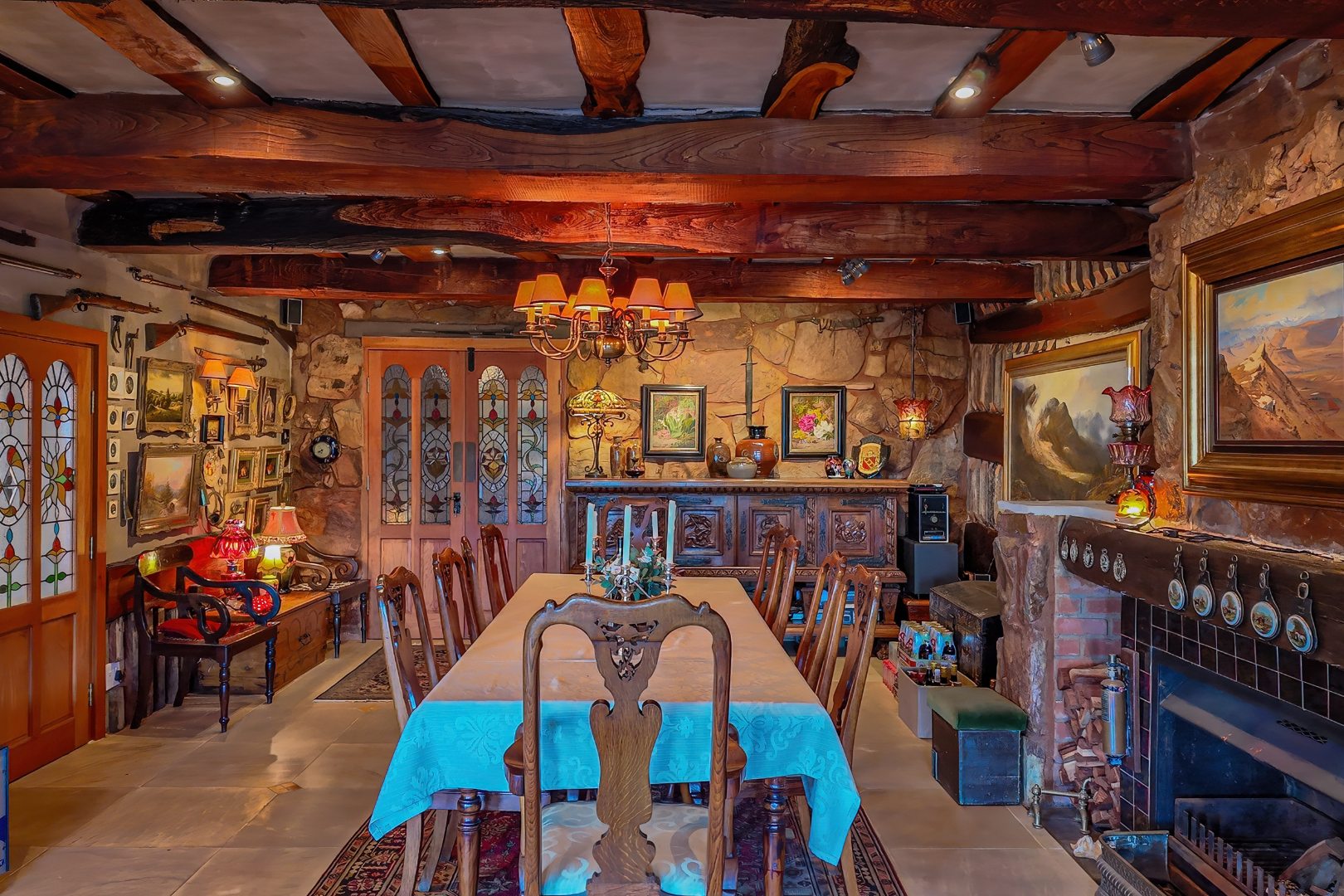 Throughout the home, intricate leaded glass windows, imported light fittings, and four statement stone fireplaces reinforce its unique character and craftsmanship.