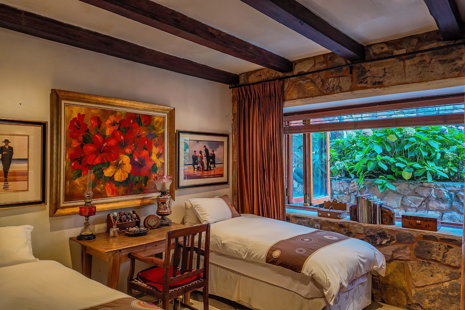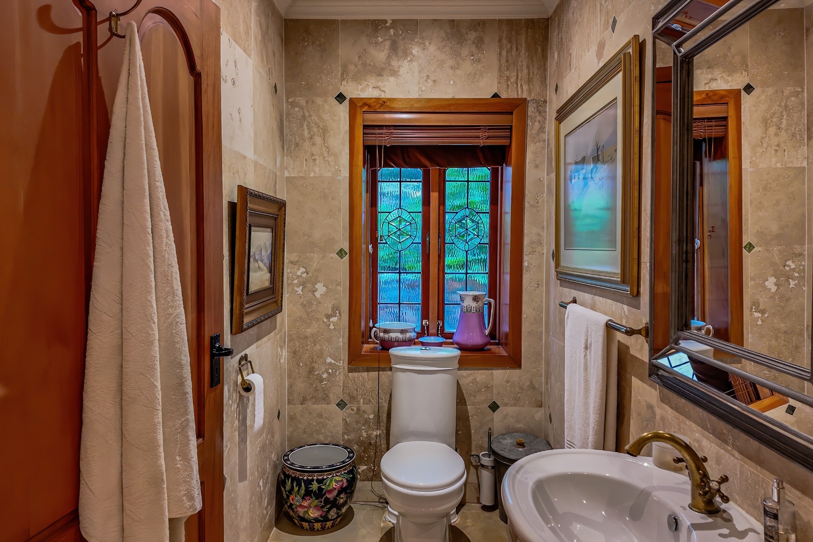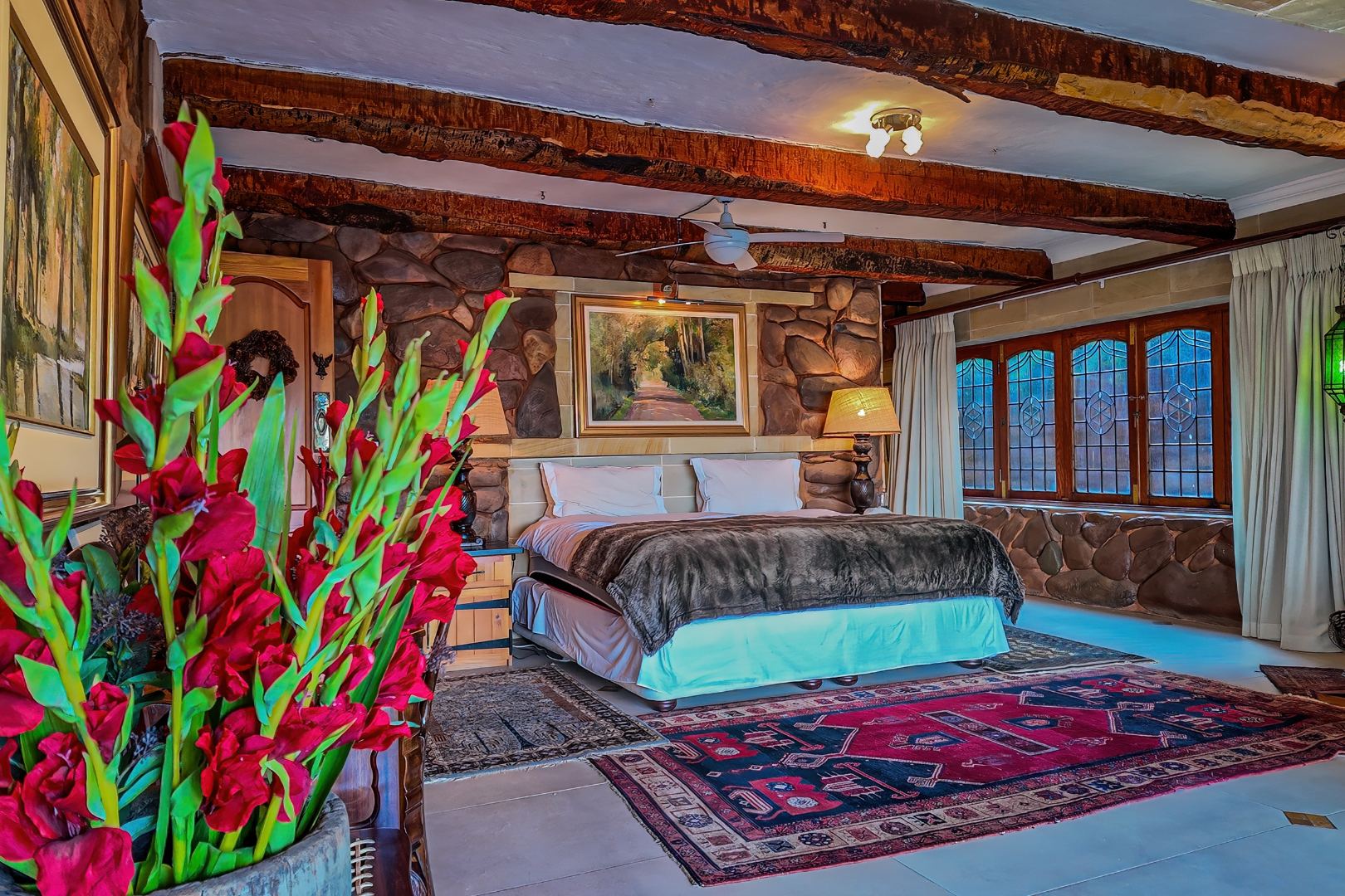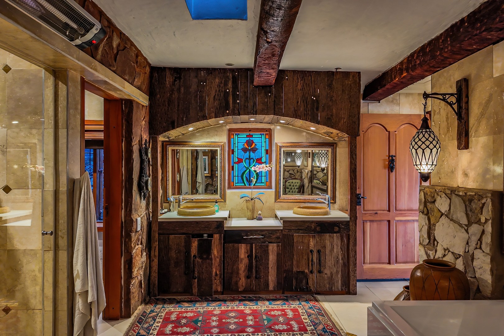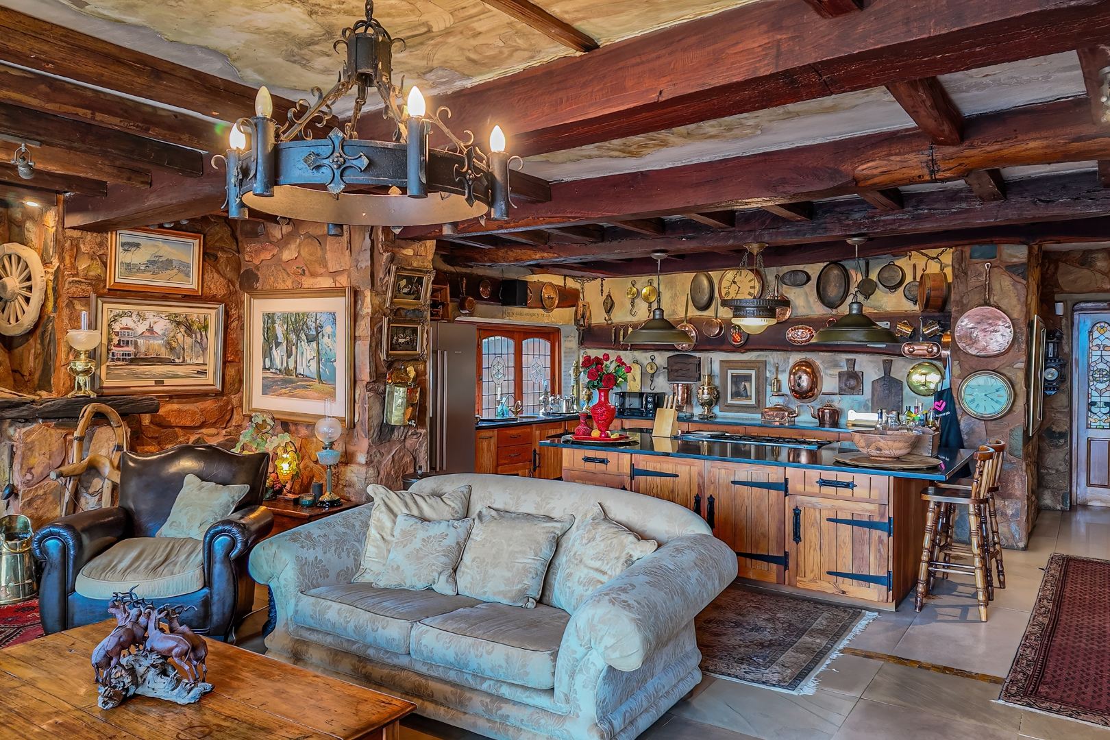 Throughout the home, intricate leaded glass windows, imported light fittings, and four statement stone fireplaces reinforce its unique character and craftsmanship.