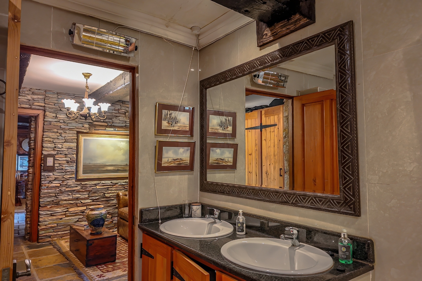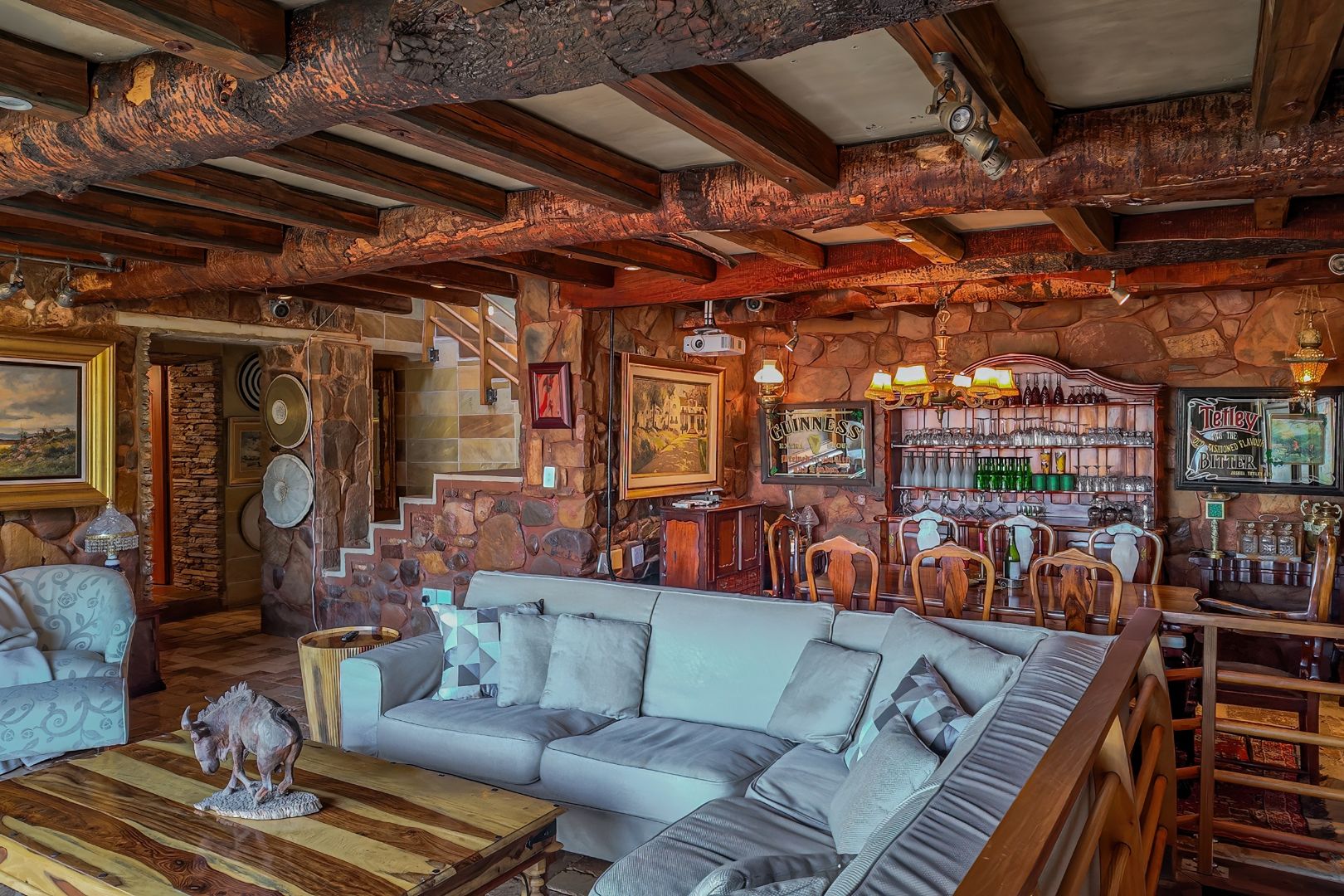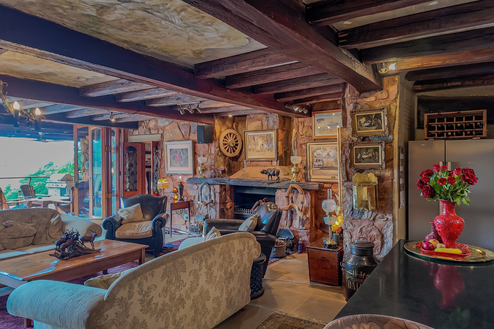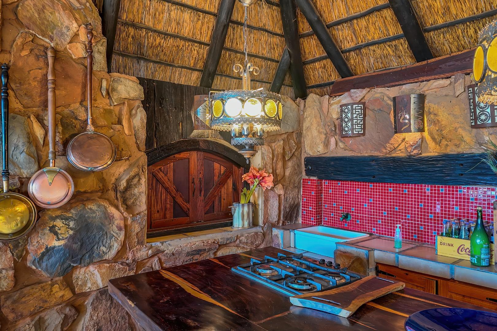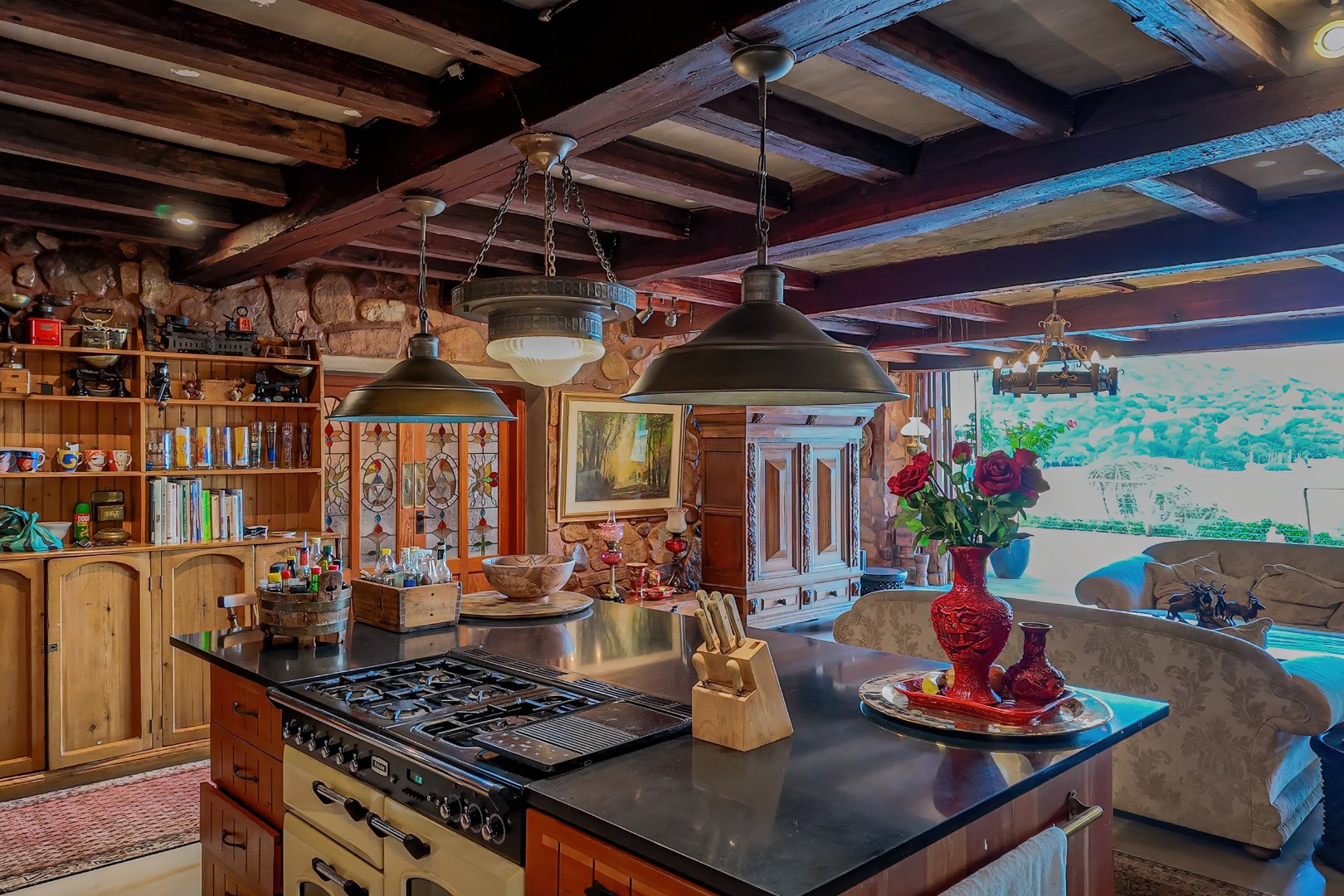 The main living level boasts a gourmet open-plan kitchen with Oregon pine cabinetry, granite countertops, and a separate scullery and pantry. Exposed solid saligna and poplar beams enhance the warm, rustic elegance throughout the home. The expansive lounge opens seamlessly via stacking doors onto a spacious veranda overlooking the pool and dam, creating effortless indoor-outdoor living.