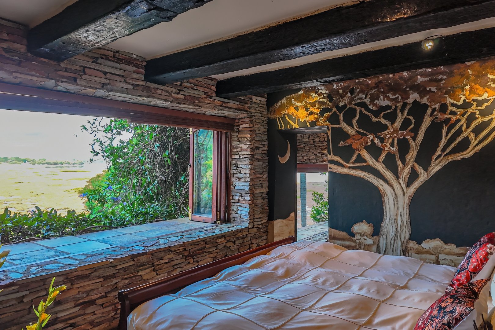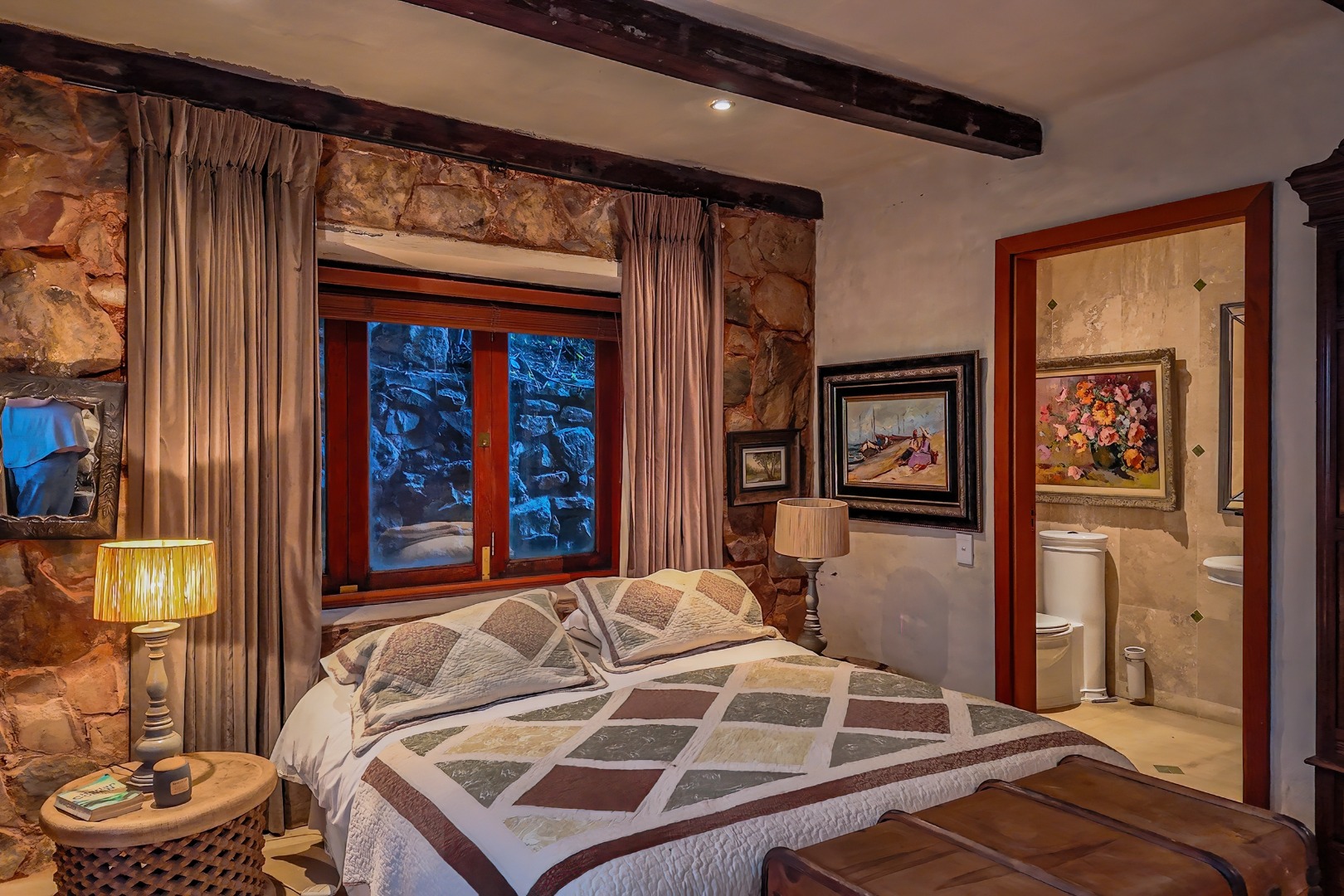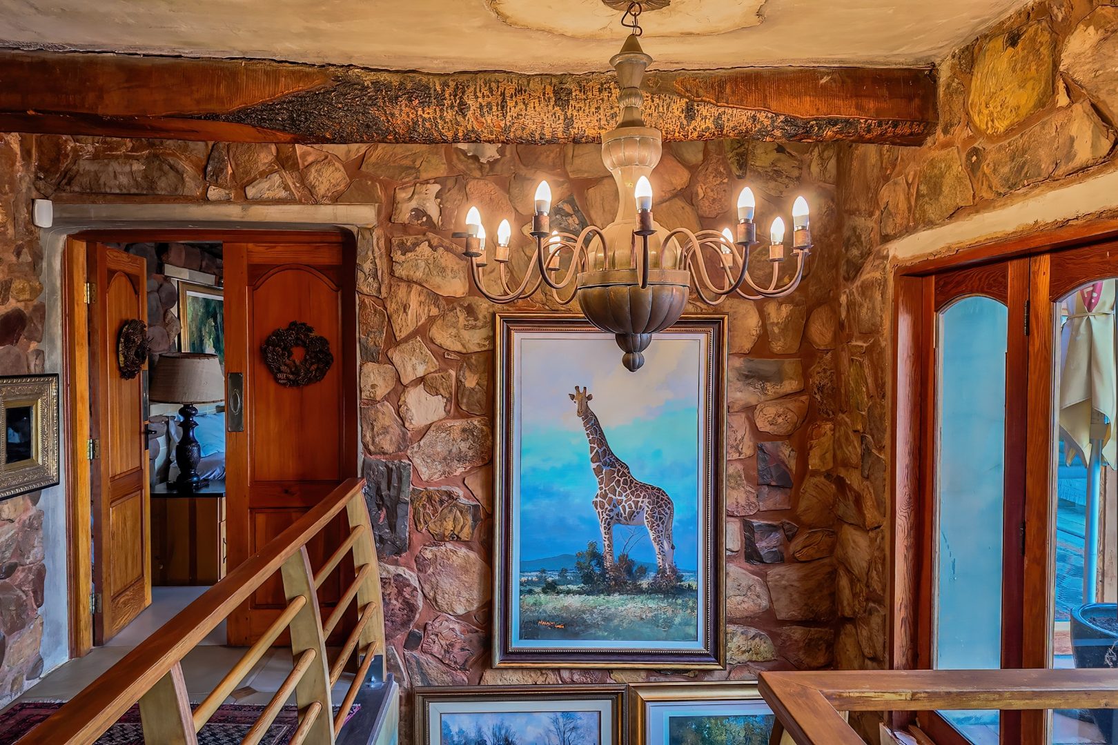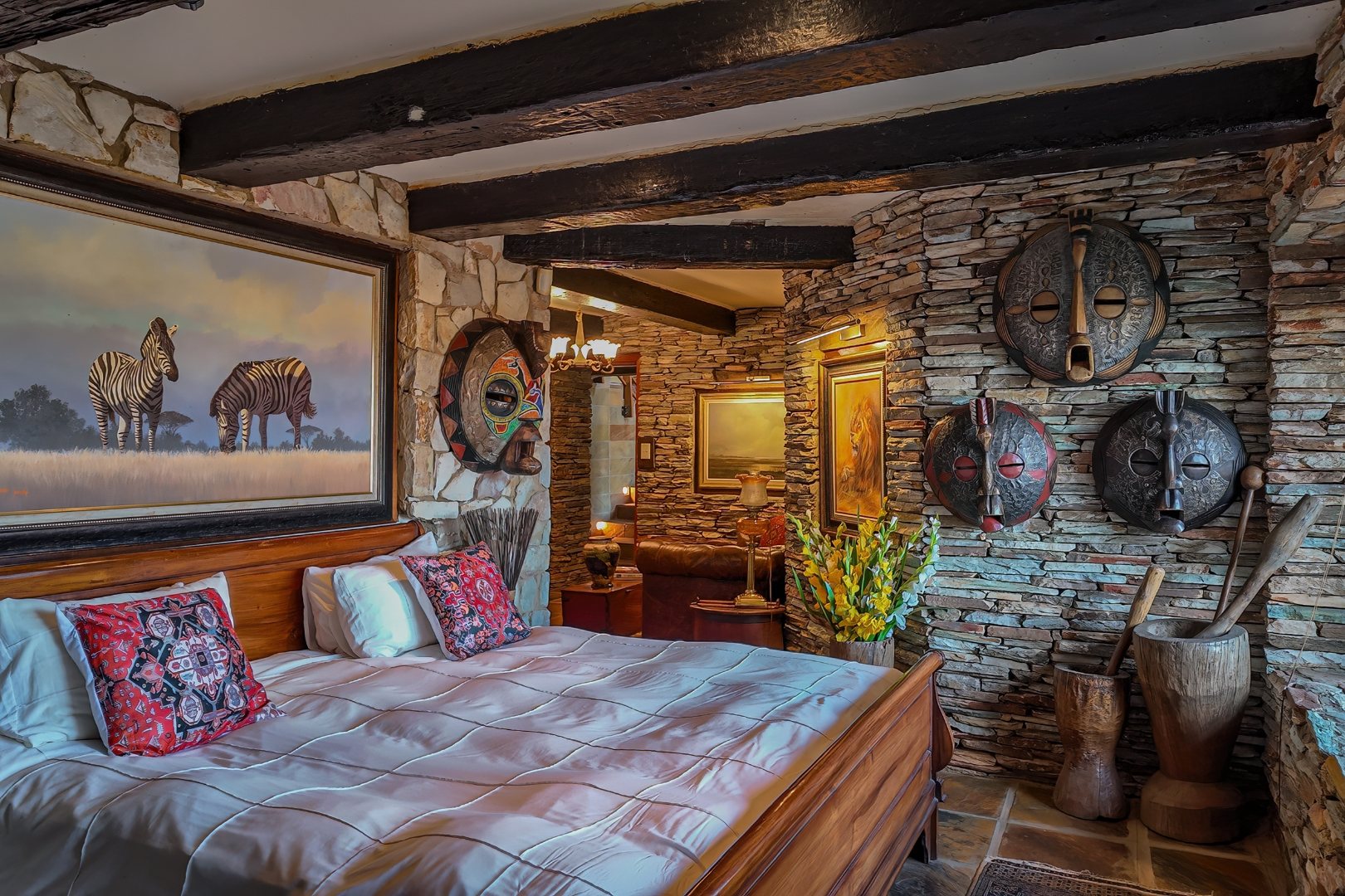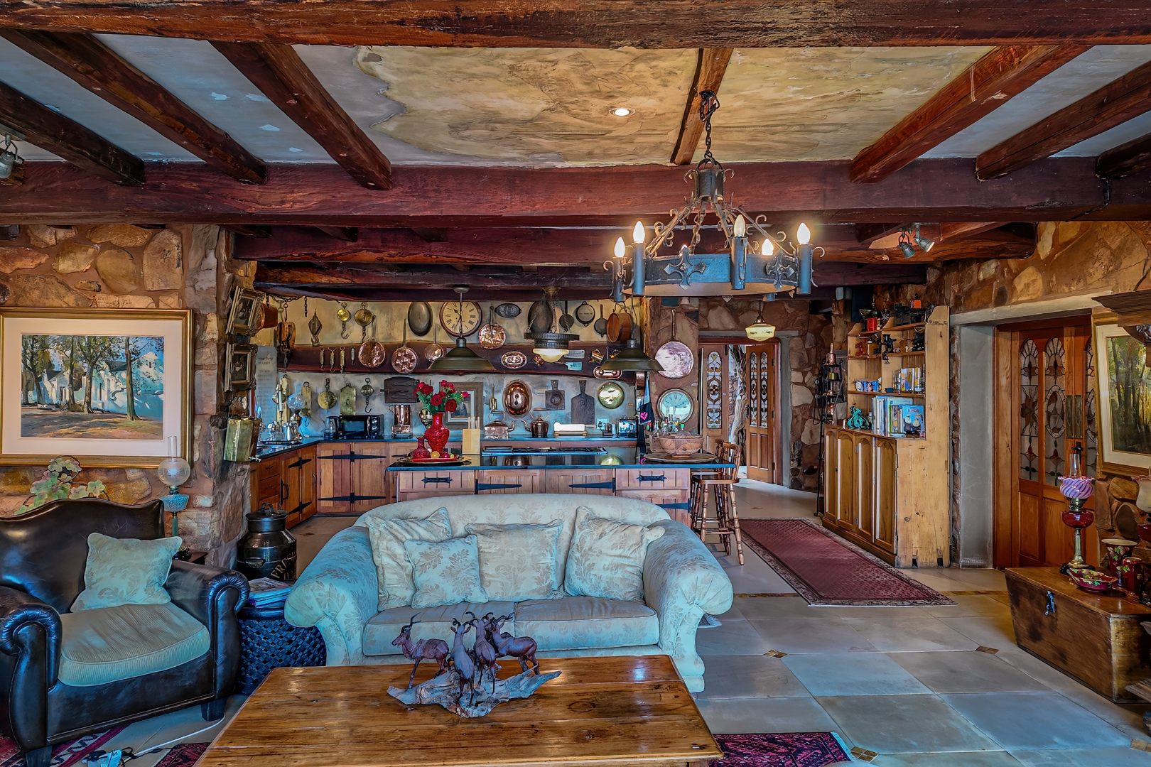 The main living level boasts a gourmet open-plan kitchen with Oregon pine cabinetry, granite countertops, and a separate scullery and pantry. Exposed solid saligna and poplar beams enhance the warm, rustic elegance throughout the home. The expansive lounge opens seamlessly via stacking doors onto a spacious veranda overlooking the pool and dam, creating effortless indoor-outdoor living.