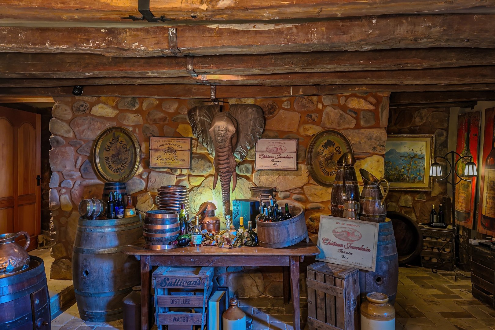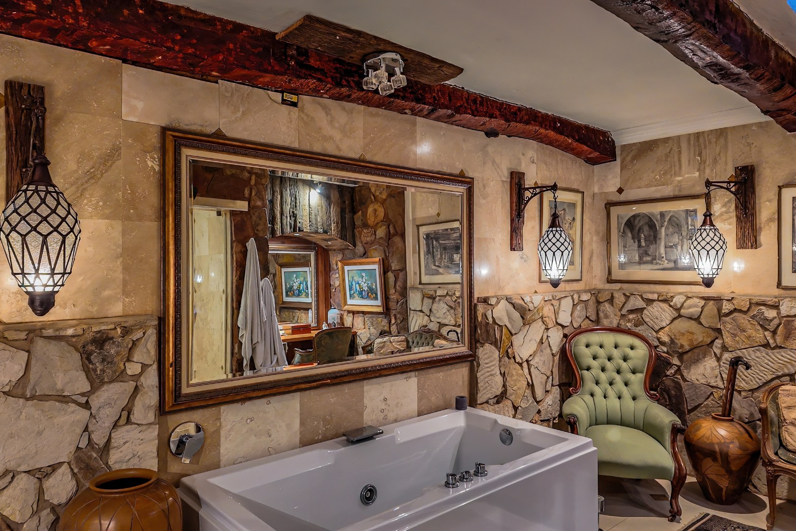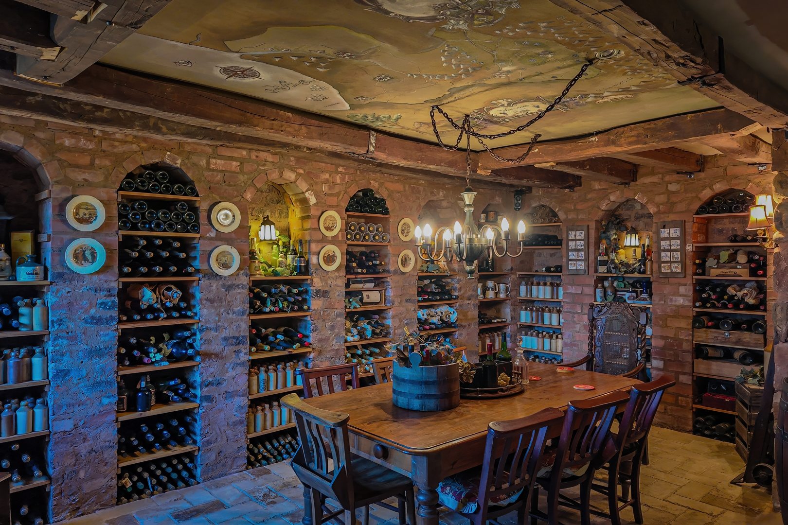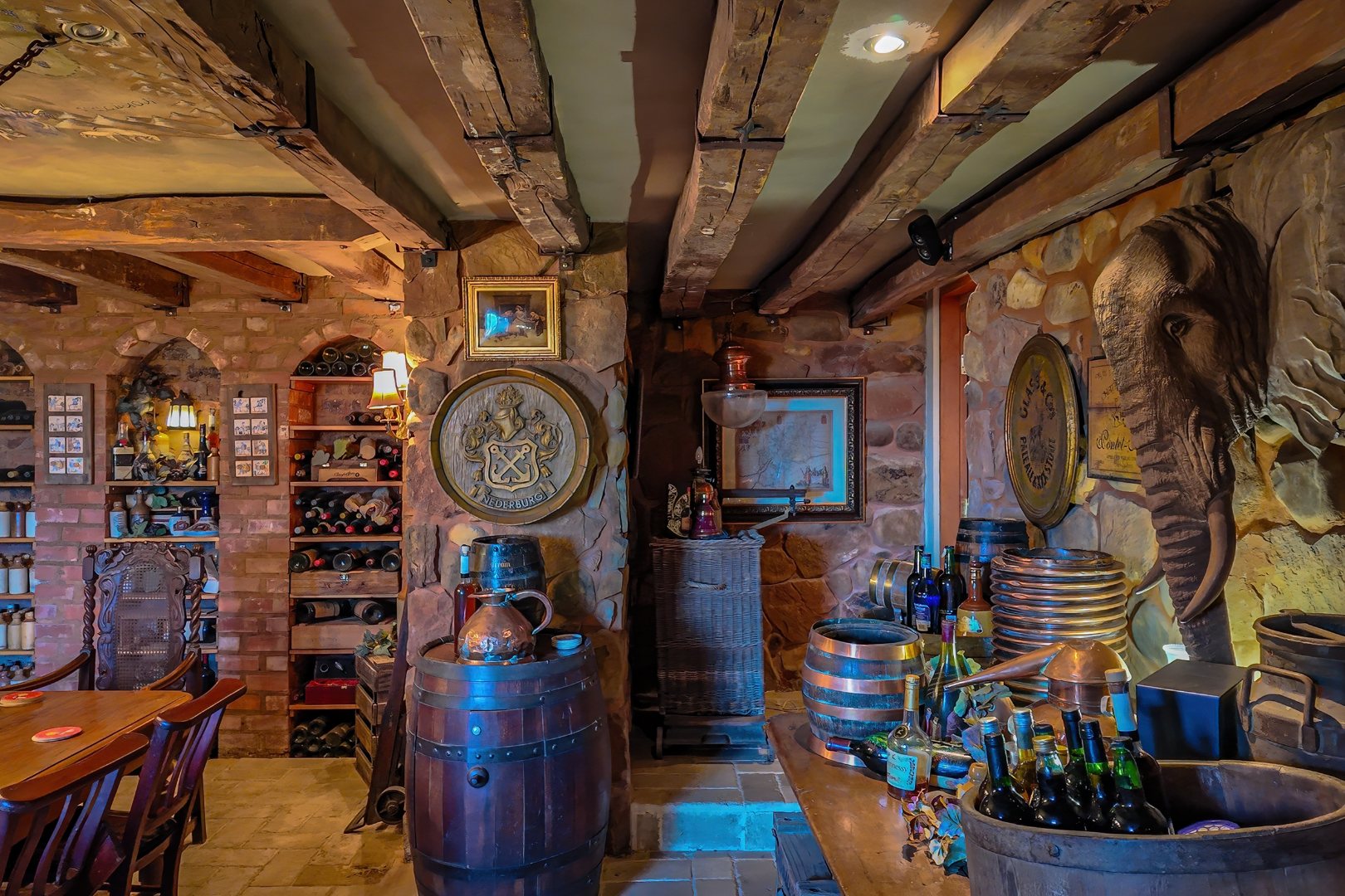 Descending further, you’ll discover a truly special feature: an atmospheric wine cellar with a dining area, rich in old-world charm—perfect for intimate dinners and showcasing an impressive wine collection.