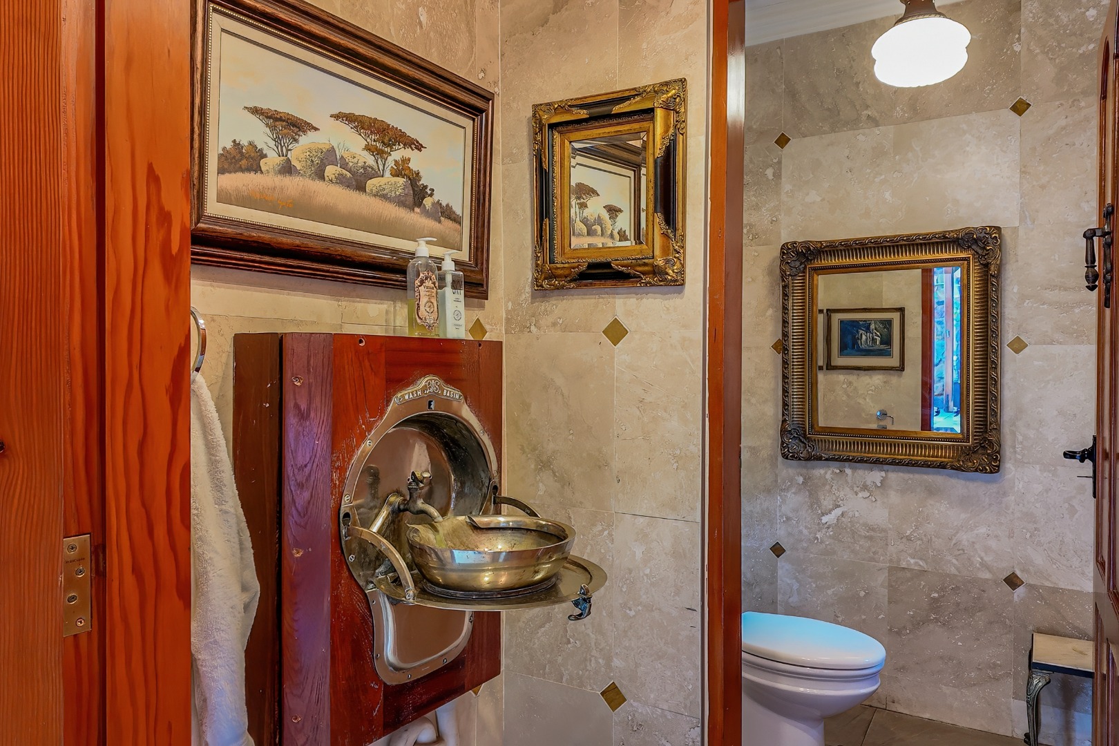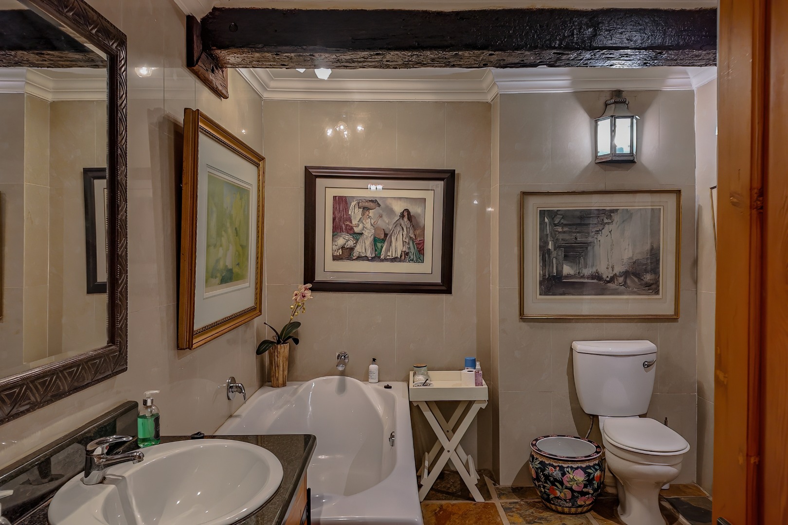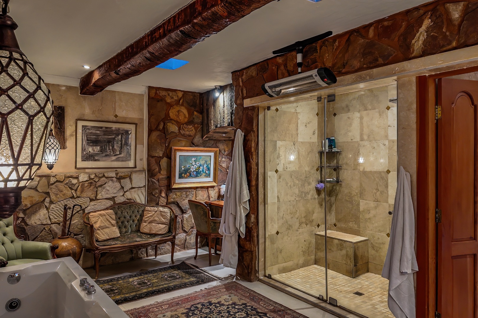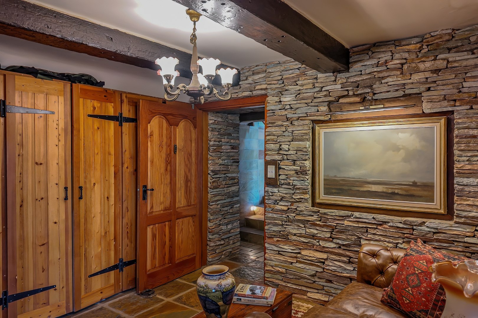 Descending further, you’ll discover a truly special feature: an atmospheric wine cellar with a dining area, rich in old-world charm—perfect for intimate dinners and showcasing an impressive wine collection.