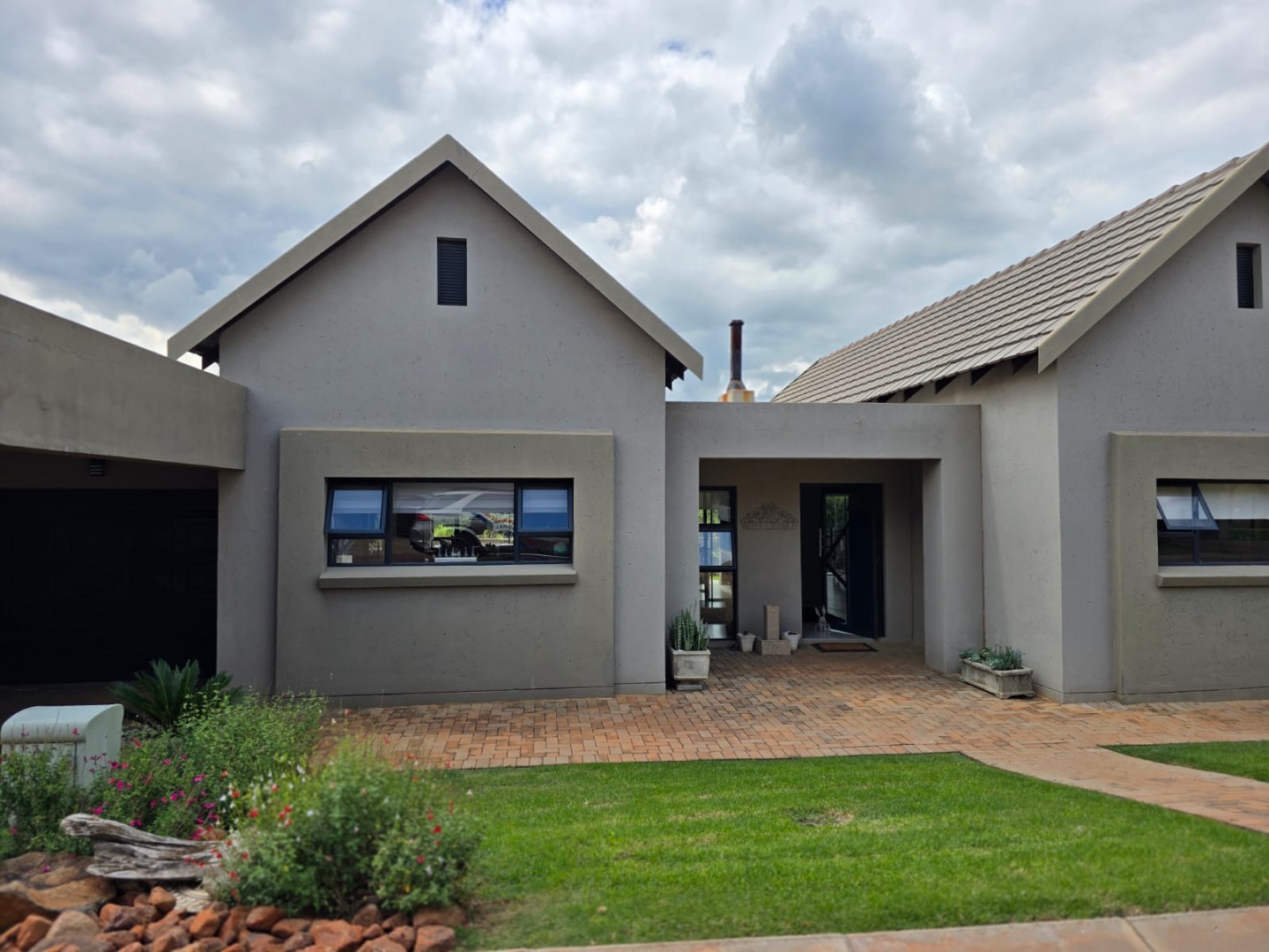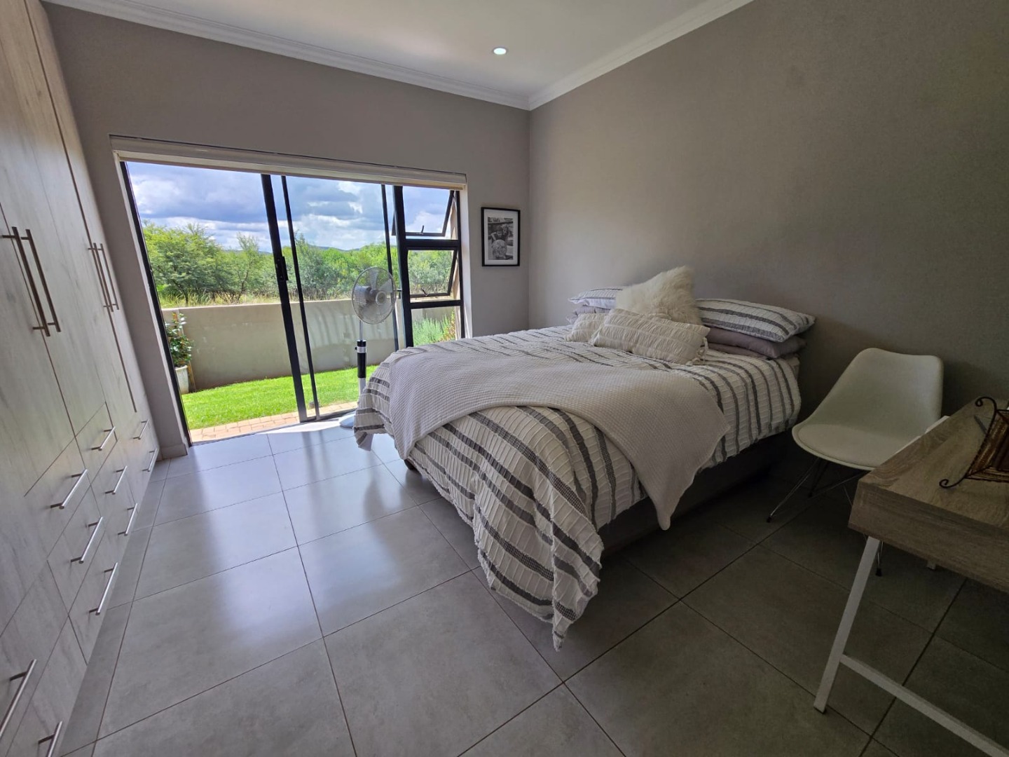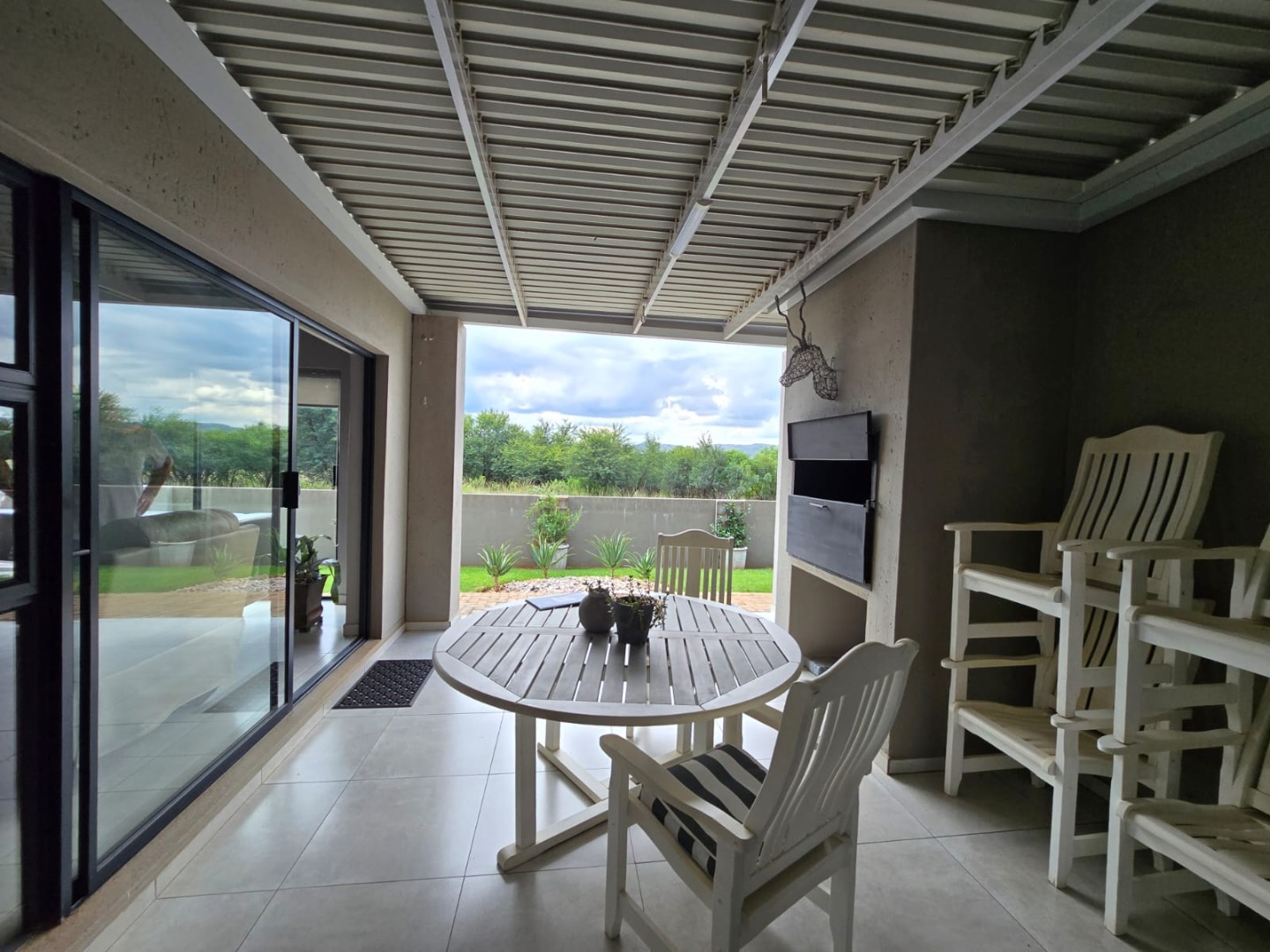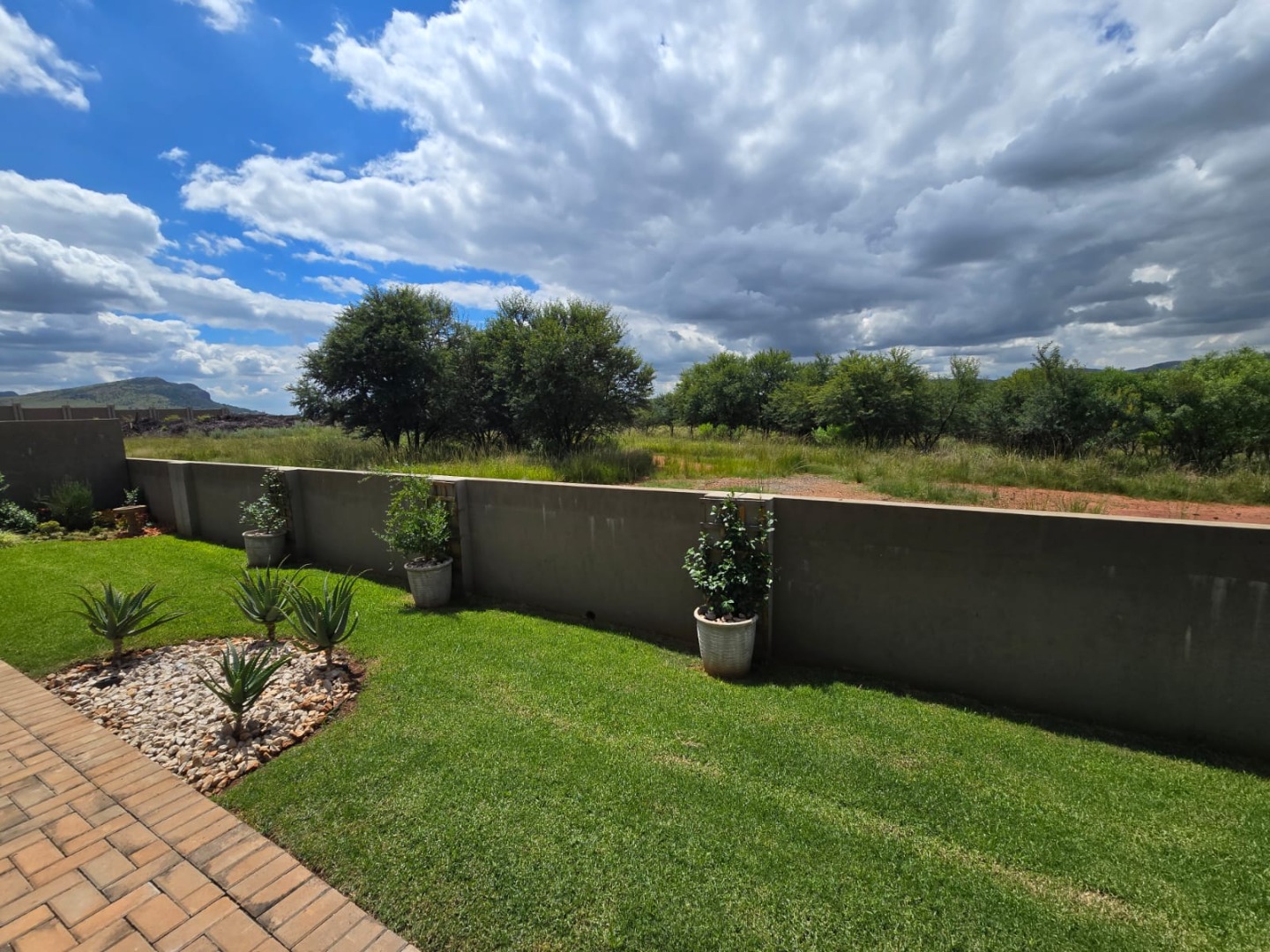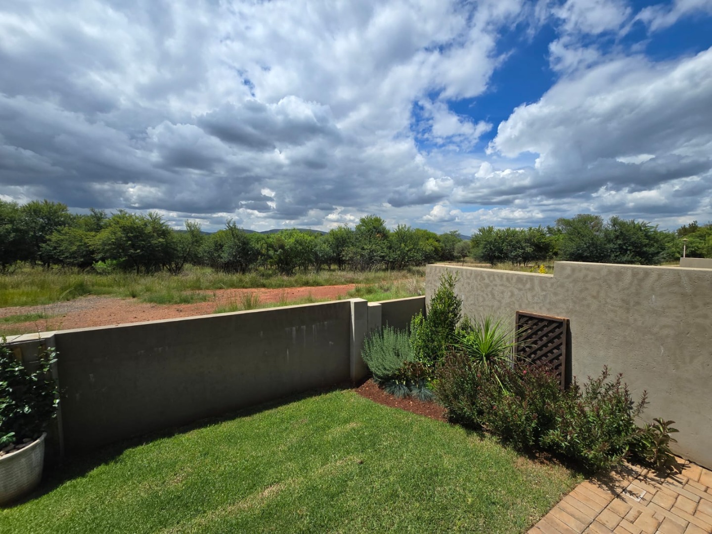 The modern L-shaped kitchen offers light wood-grain cabinetry, dark countertops, a subway tile backsplash, and a pantry, flowing seamlessly into the dining and lounge areas with large windows and sliding doors. Outdoor living is enhanced by a covered patio with a built-in braai and a private irrigated garden. Additional features include a single garage, extra parking, fibre connectivity, 24-hour security, pet-friendly living, and wheelchair accessibility—perfectly complementing the relaxed country lifestyle Leloko is known for.