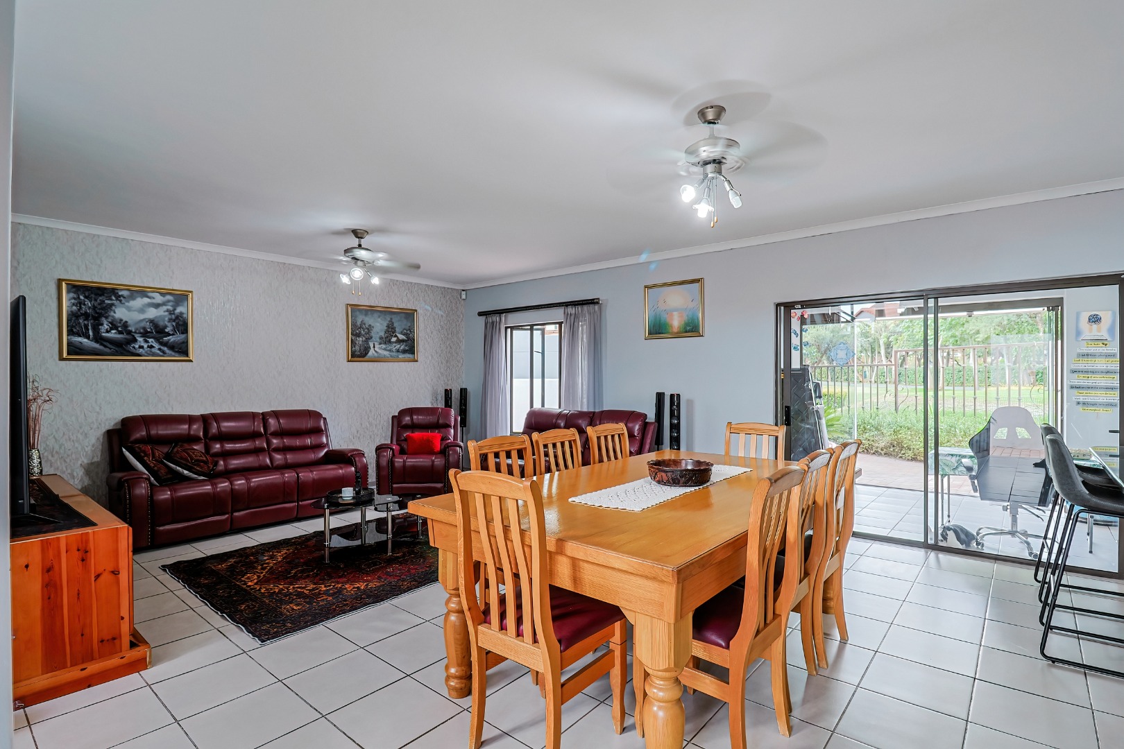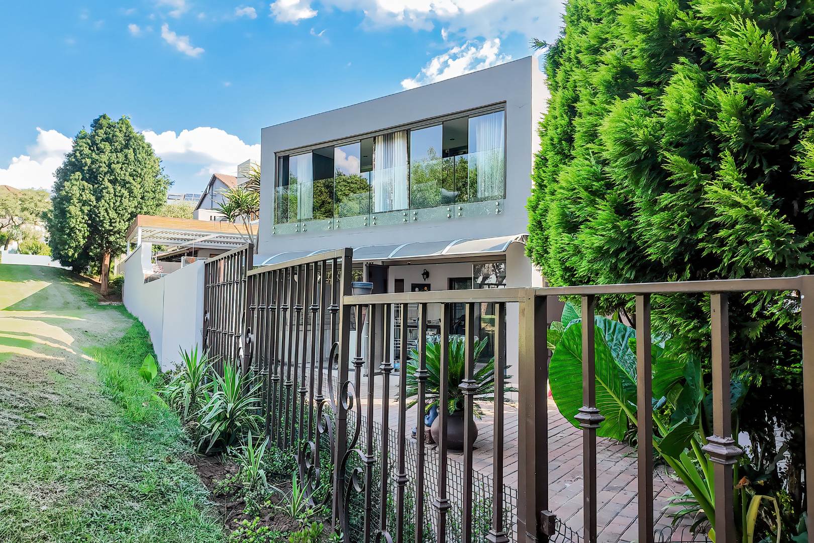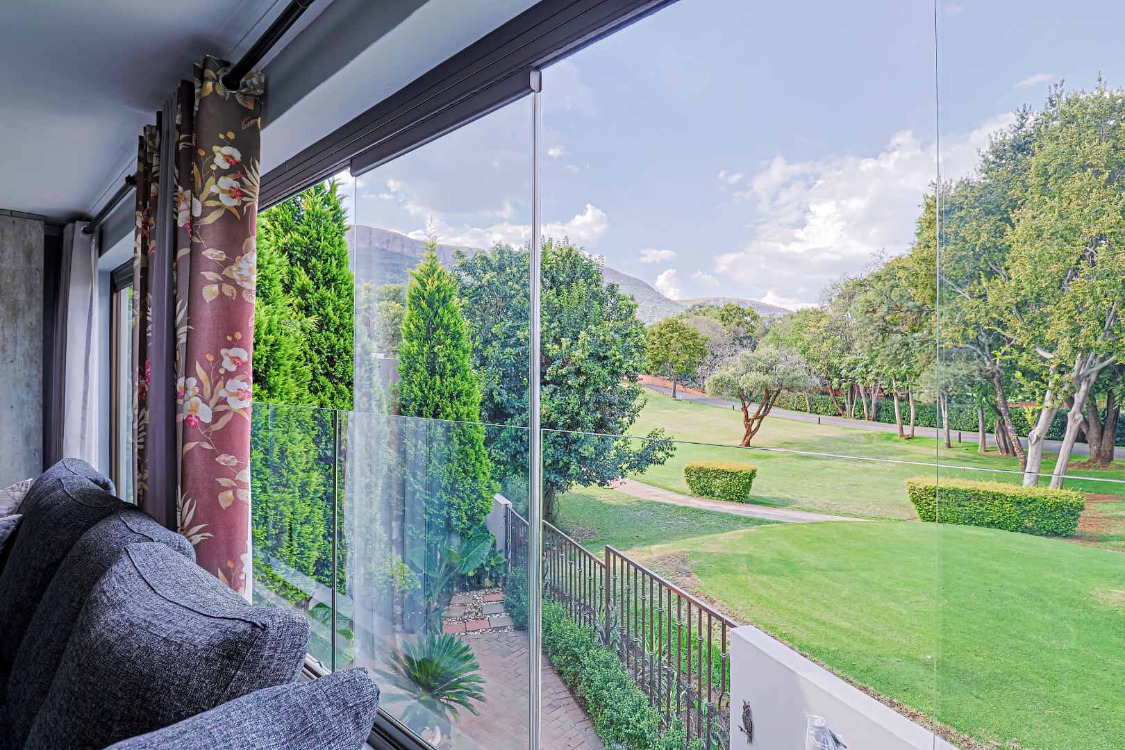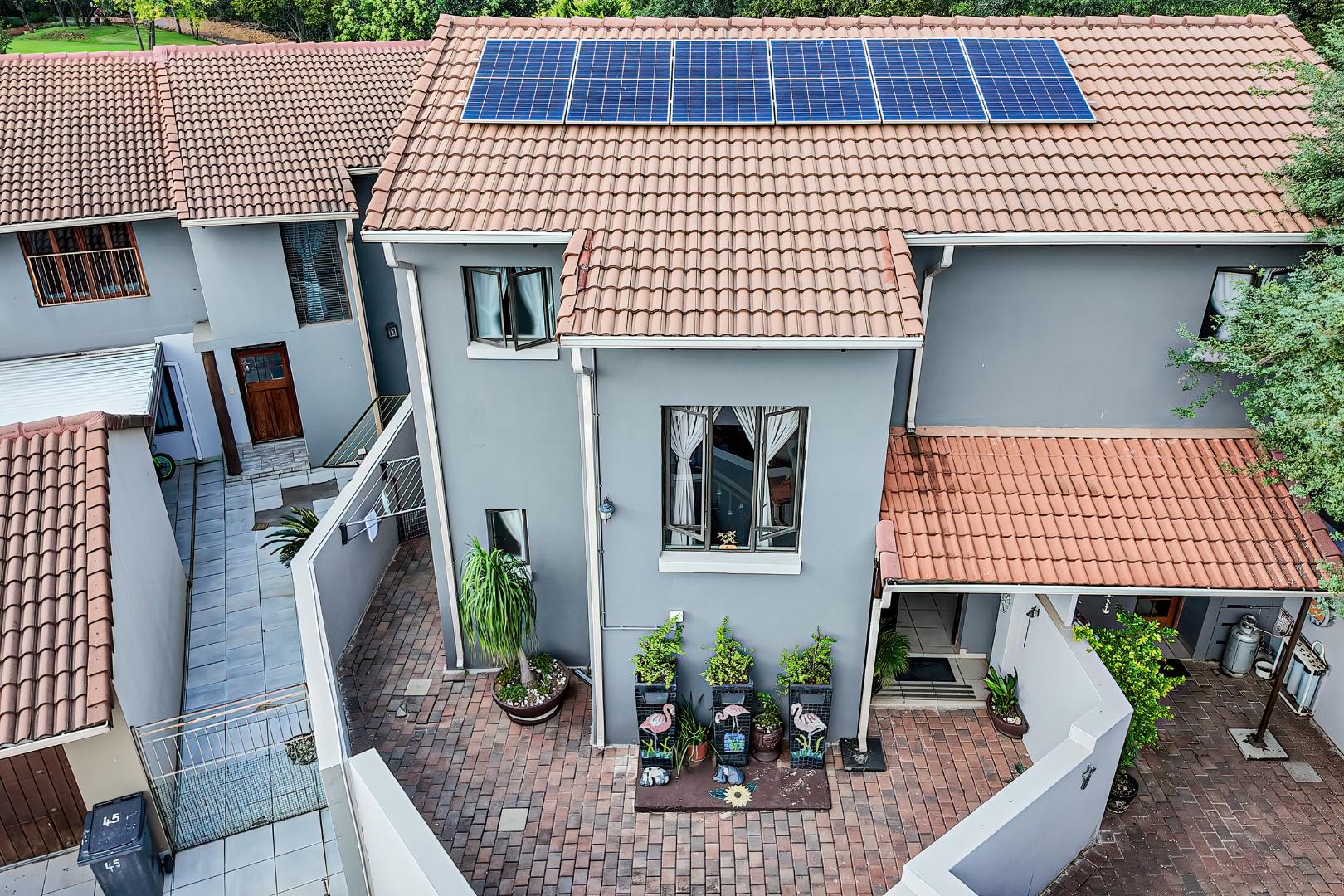 Upstairs, three spacious bedrooms open onto undercover balconies, allowing for elevated views and abundant natural light. The home offers three bedrooms and two-and-a-half bathrooms in total, thoughtfully designed for comfortable family living. Additional features include two inverters, two batteries, 14 solar panels, five air conditioners, three Big Blu water filtration systems, and filtered drinking water in the kitchen. Located within a secure golf and wildlife estate with 24-hour security, residents also enjoy access to Magalies Park facilities for a nominal annual fee.