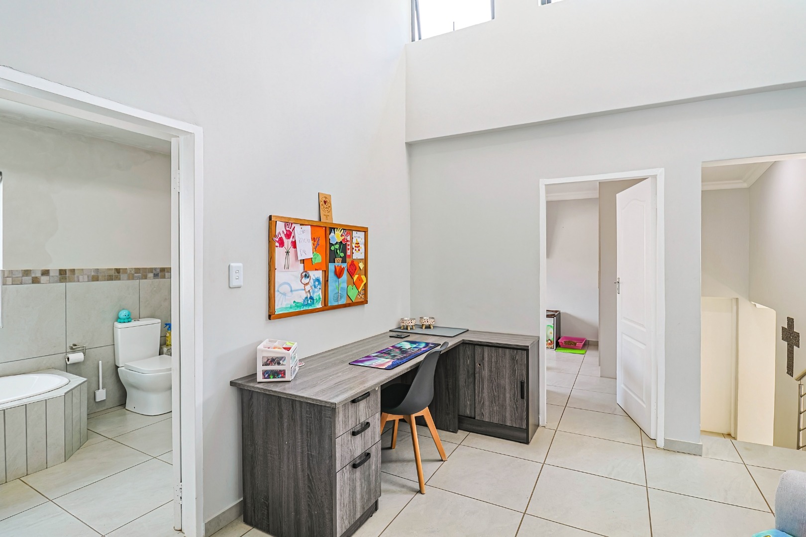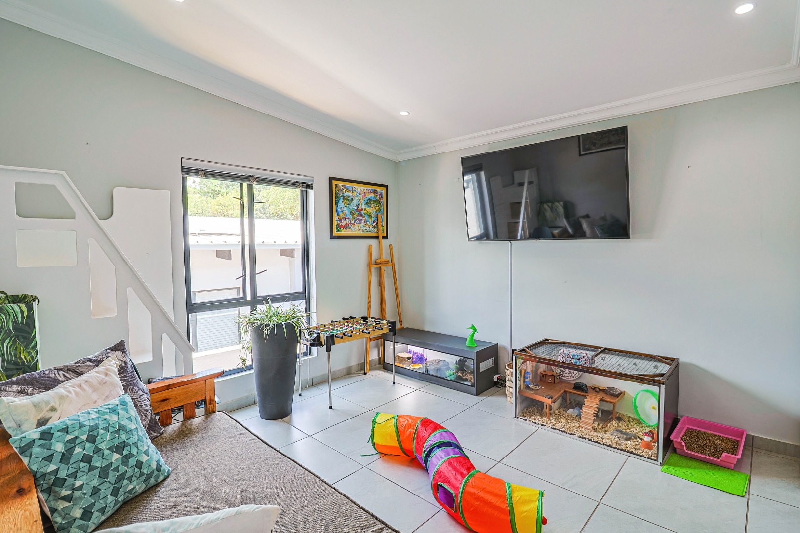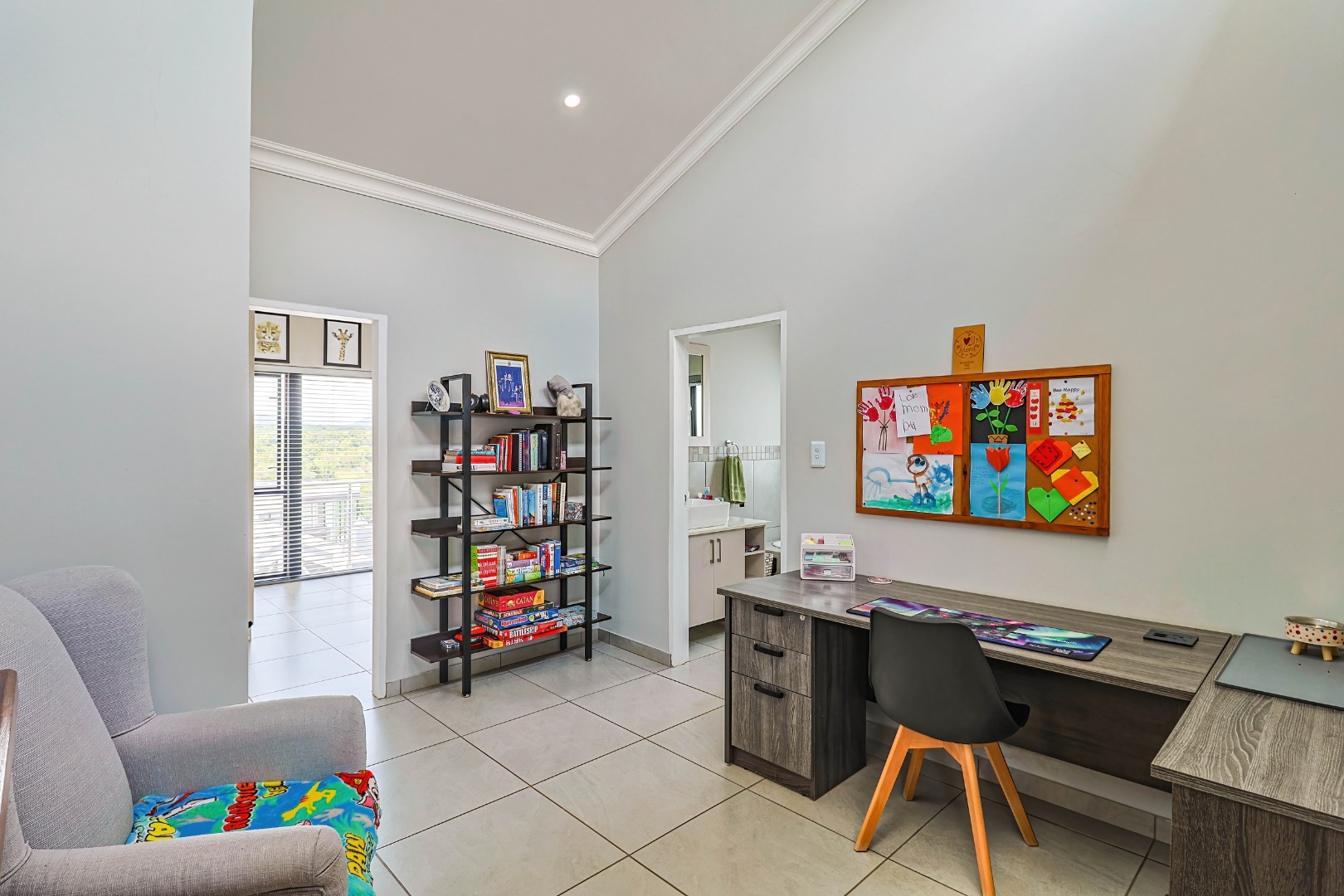 Upstairs, you’ll find three well-appointed bedrooms with built-in cupboards (two with air-conditioning), two modern bathrooms including a main en-suite, and a light-filled pajama lounge ideal for unwinding. Additional highlights include a sparkling swimming pool, beautiful natural surroundings, and top-tier estate security—offering a perfect blend of comfort, style, and serenity.