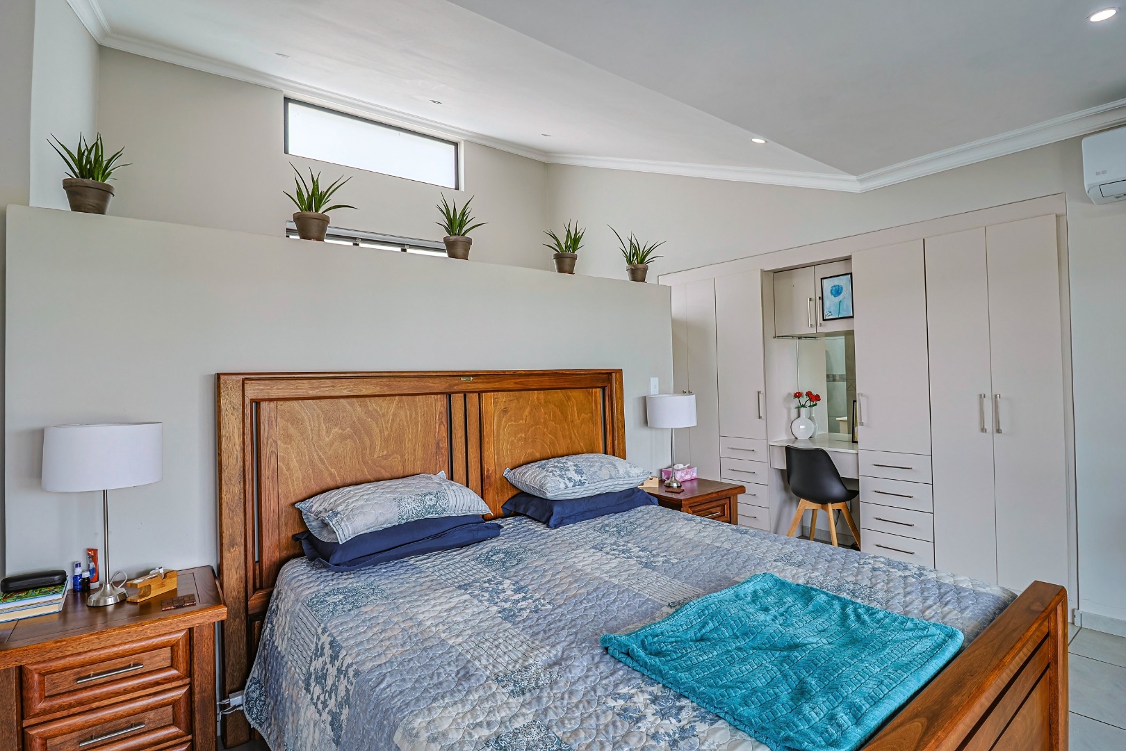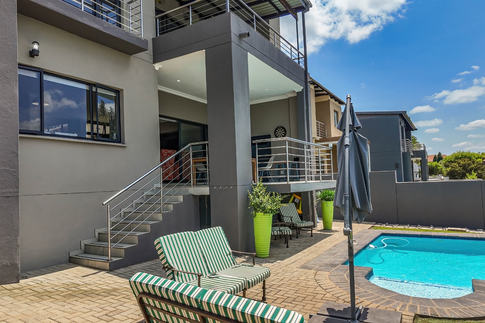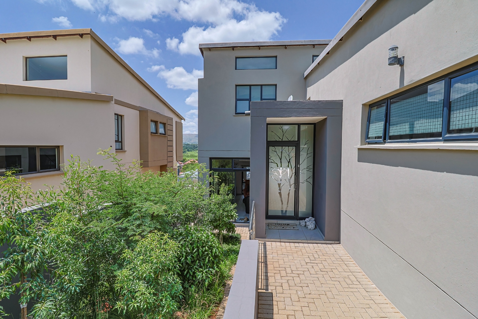 Upstairs, you’ll find three well-appointed bedrooms with built-in cupboards (two with air-conditioning), two modern bathrooms including a main en-suite, and a light-filled pajama lounge ideal for unwinding. Additional highlights include a sparkling swimming pool, beautiful natural surroundings, and top-tier estate security—offering a perfect blend of comfort, style, and serenity.