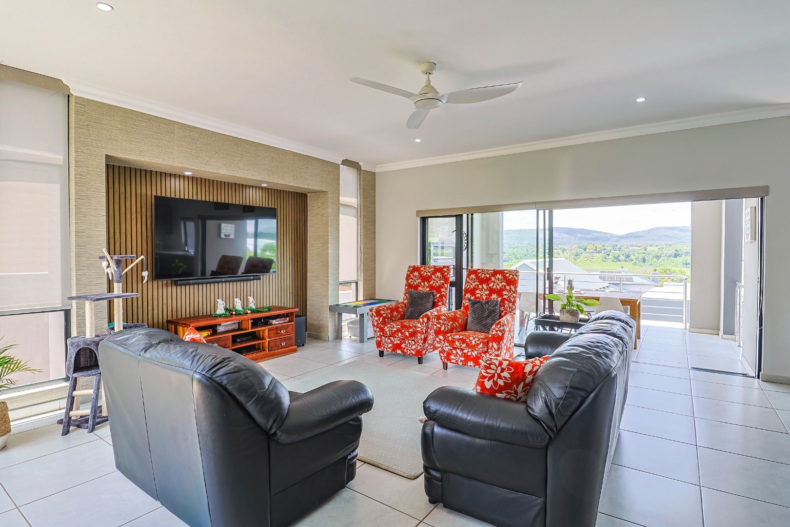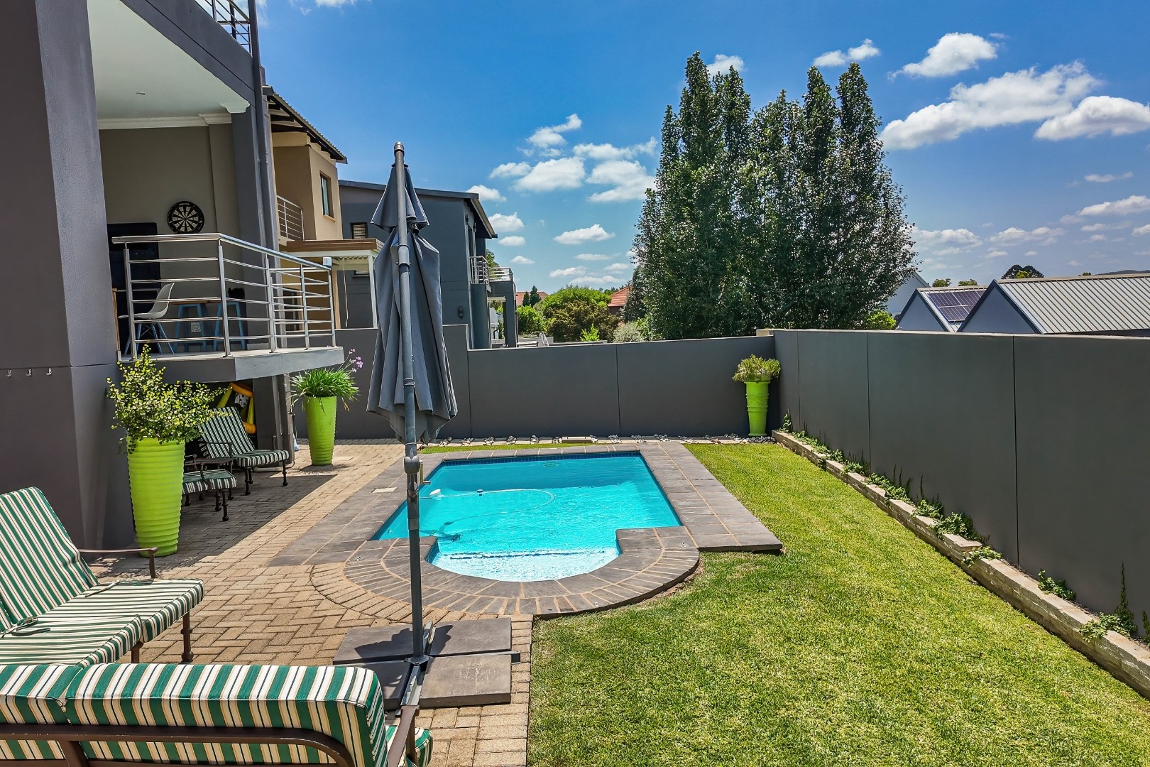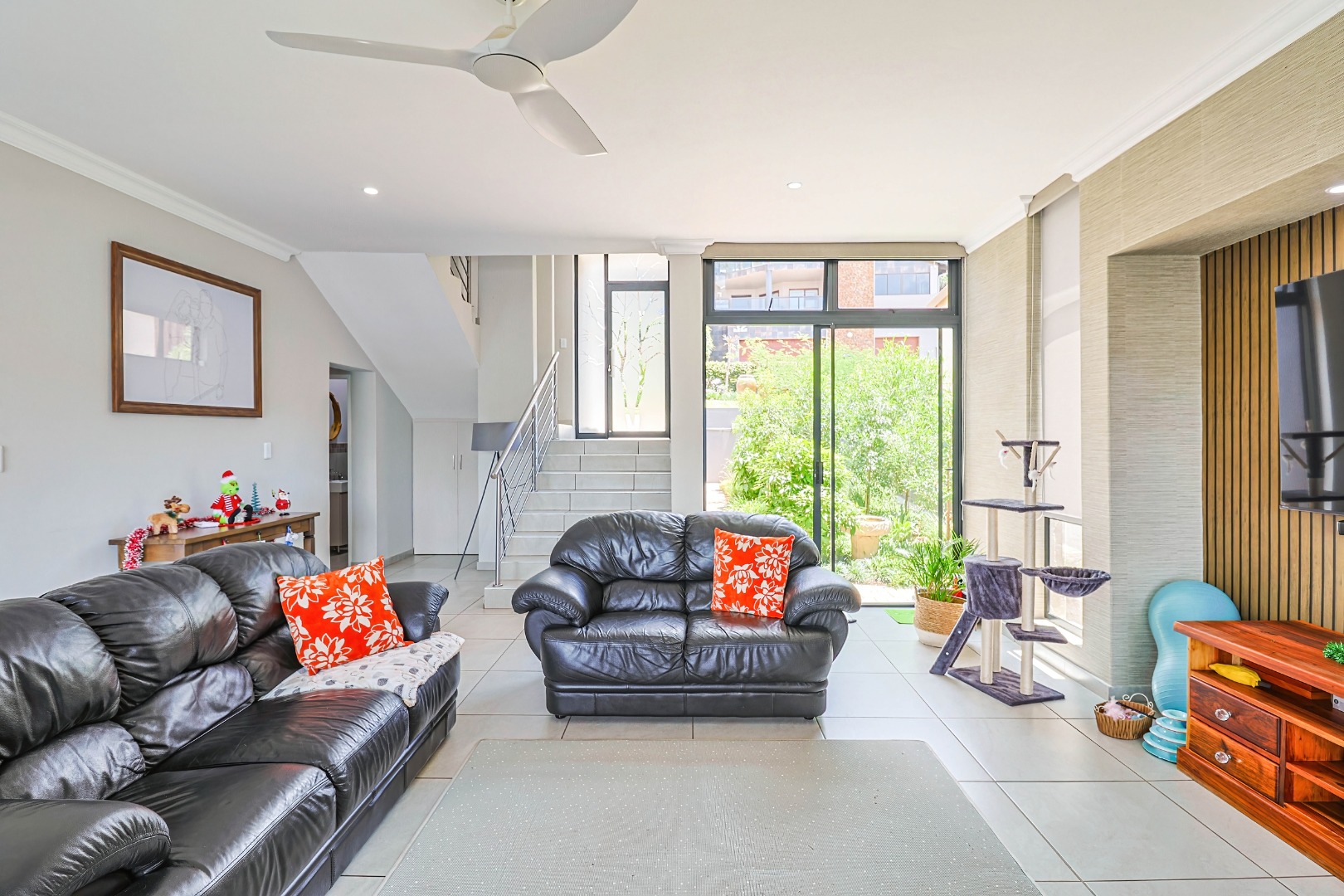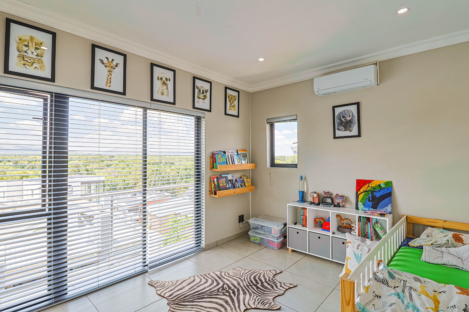 Upstairs, you’ll find three well-appointed bedrooms with built-in cupboards (two with air-conditioning), two modern bathrooms including a main en-suite, and a light-filled pajama lounge ideal for unwinding. Additional highlights include a sparkling swimming pool, beautiful natural surroundings, and top-tier estate security—offering a perfect blend of comfort, style, and serenity.