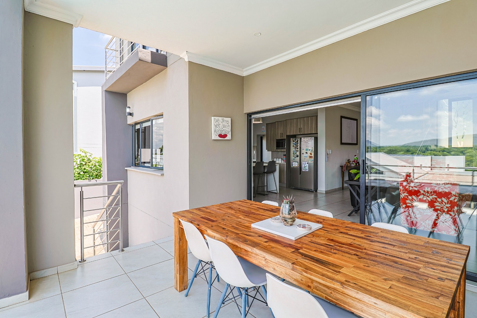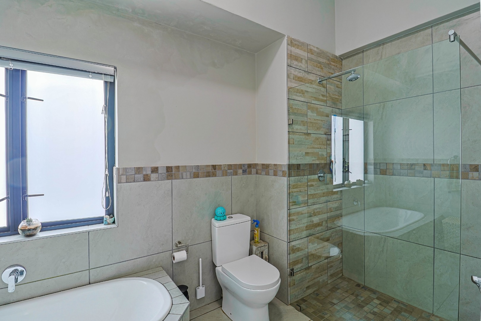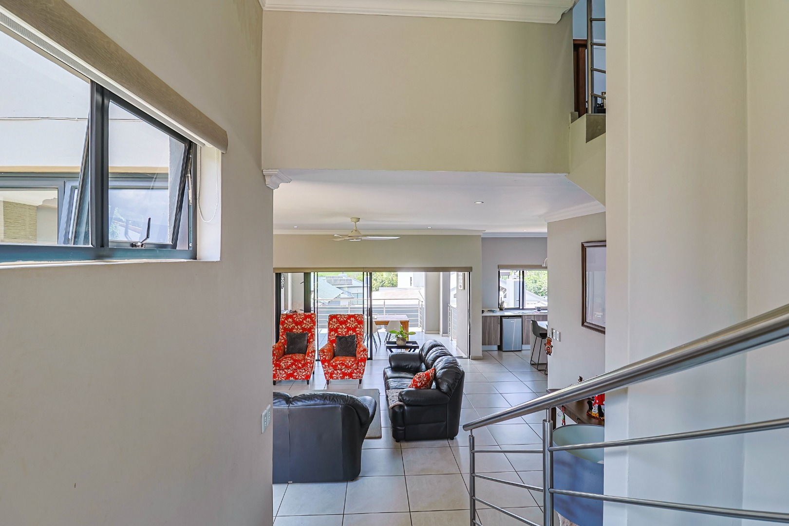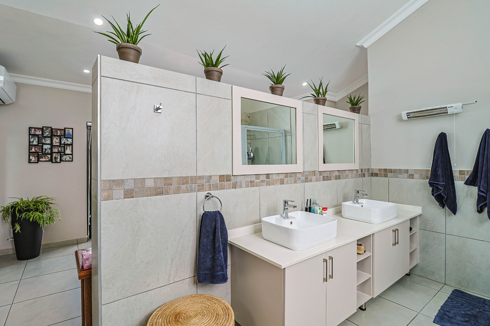 Upstairs, you’ll find three well-appointed bedrooms with built-in cupboards (two with air-conditioning), two modern bathrooms including a main en-suite, and a light-filled pajama lounge ideal for unwinding. Additional highlights include a sparkling swimming pool, beautiful natural surroundings, and top-tier estate security—offering a perfect blend of comfort, style, and serenity.