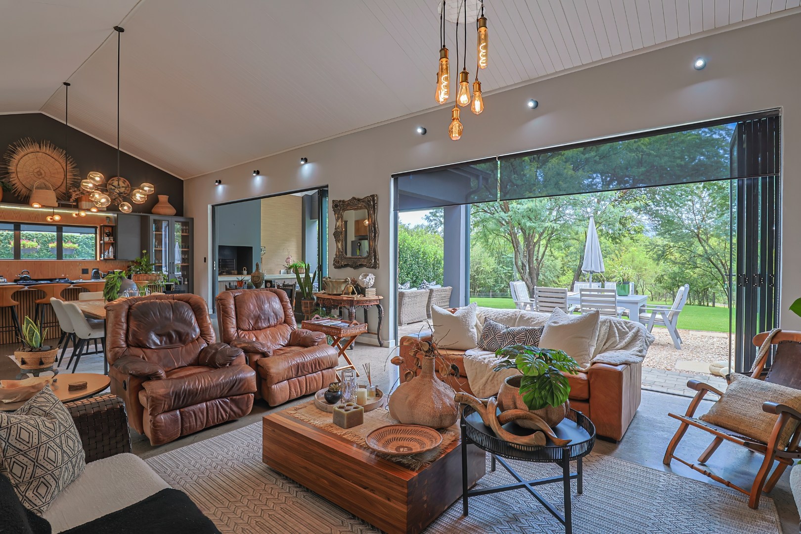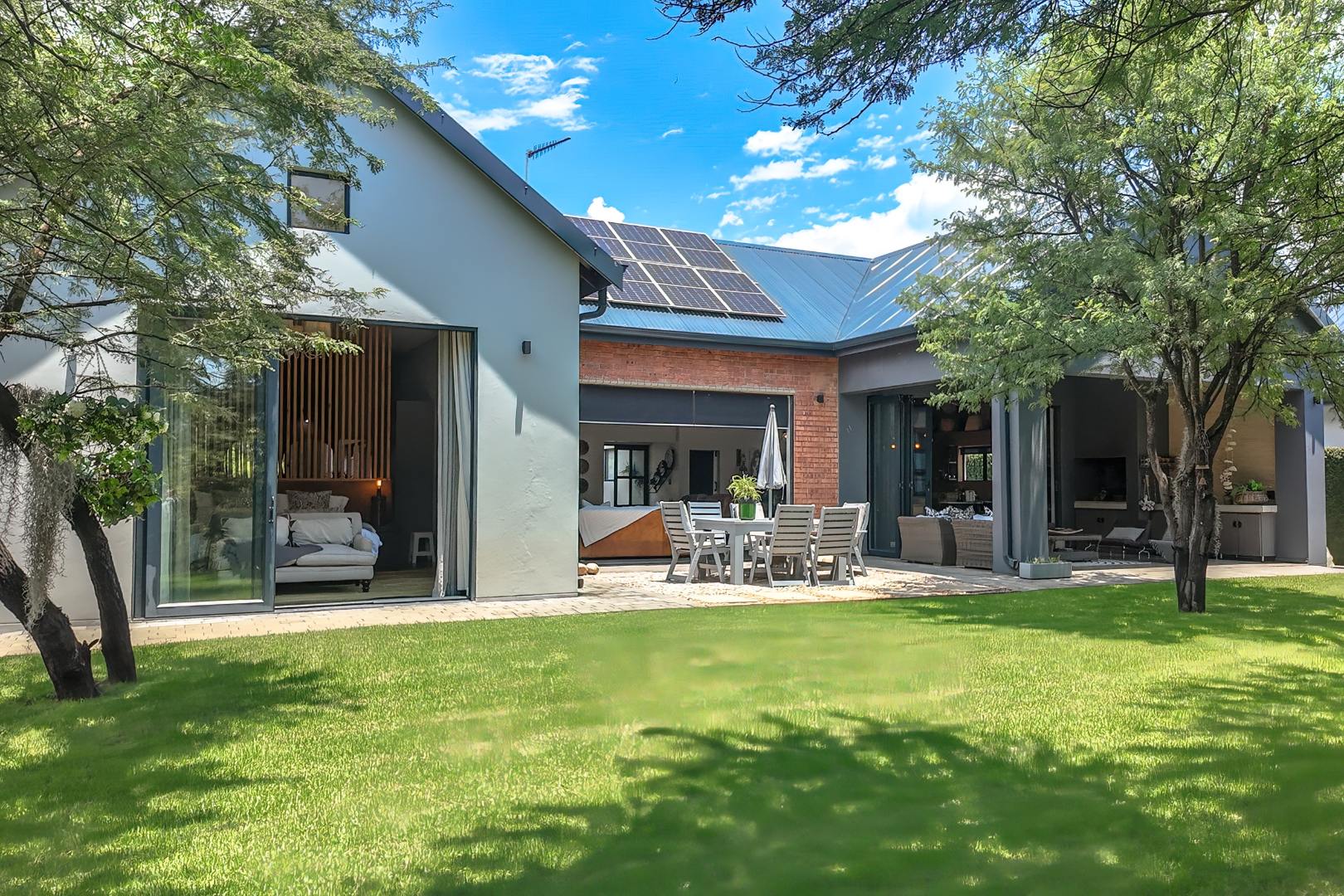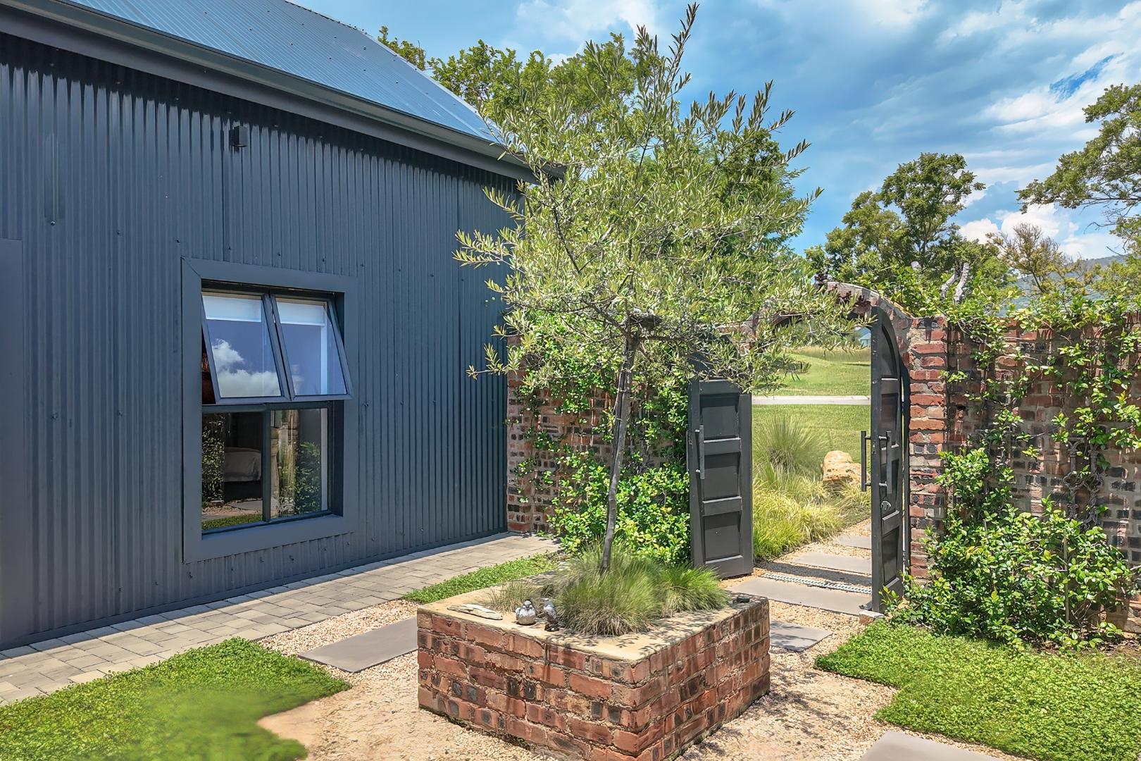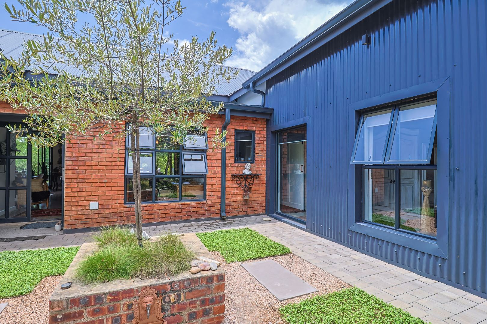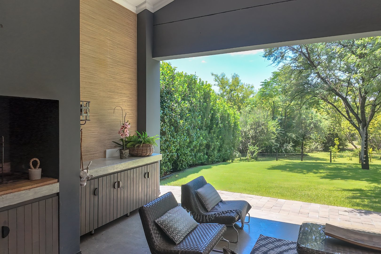 This home, situated in the lovely Landsmeer Equestrian Estate, reflects design and easy flow, textures and light, open plan living at its best. The home offers a large open plan living area which opens onto a veranda overlooking natural bush, separate scullery and laundry, practical store off the double garage, a study, three bedrooms, 3 bathrooms ( 2 en-suite). Entering the property, a classic courtyard greets one, before entering the home through the entrance hall. The double volume ceiling gives extra visual space. A wood burning stove takes the chill out of winter evenings. The bathrooms are a delight all on their own. A strong borehole and powerful solar system are extremely useful value adds. Words like peaceful, luxury and easy living all describe this modern day masterpiece. Phone me for a private viewing.