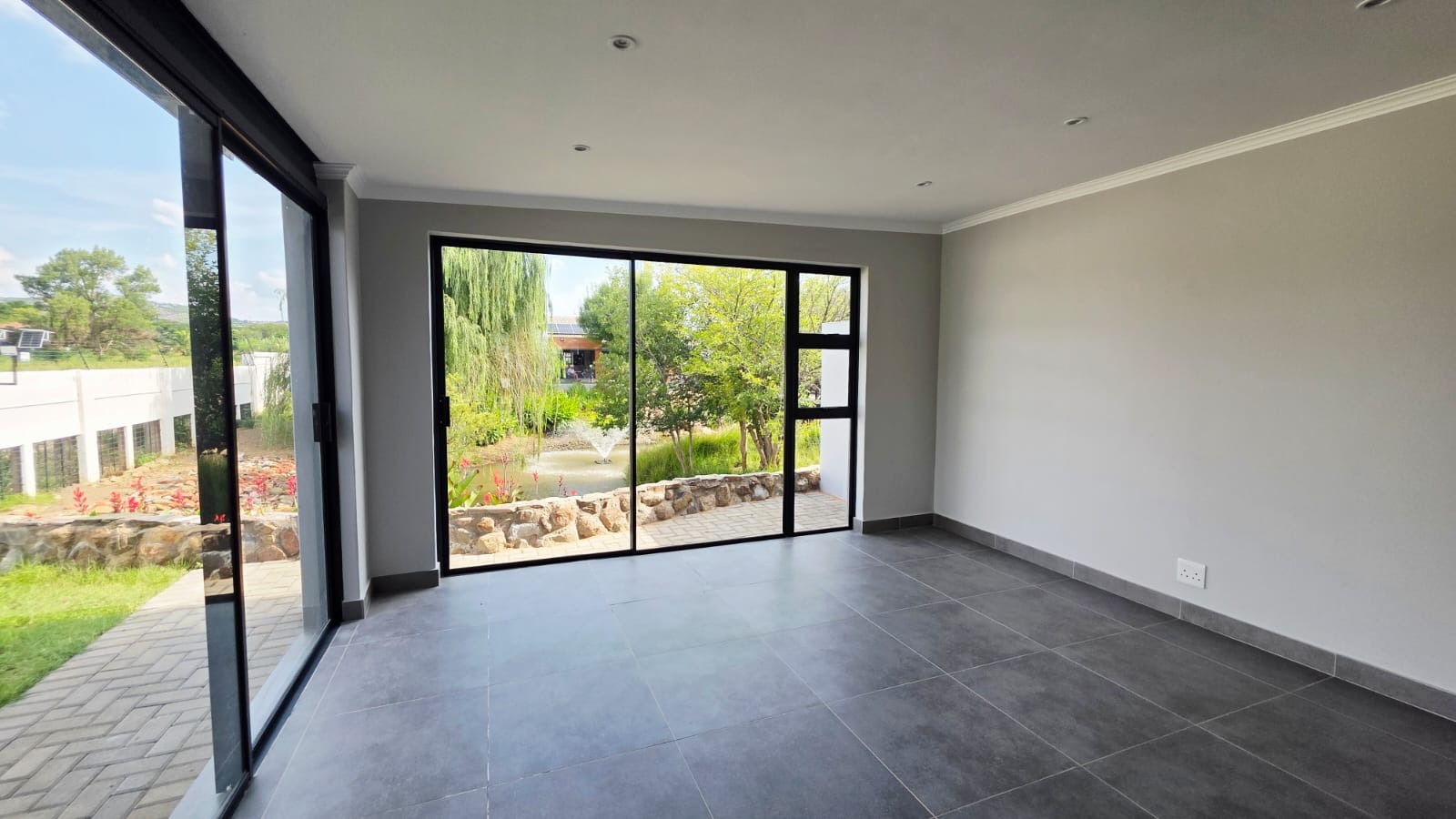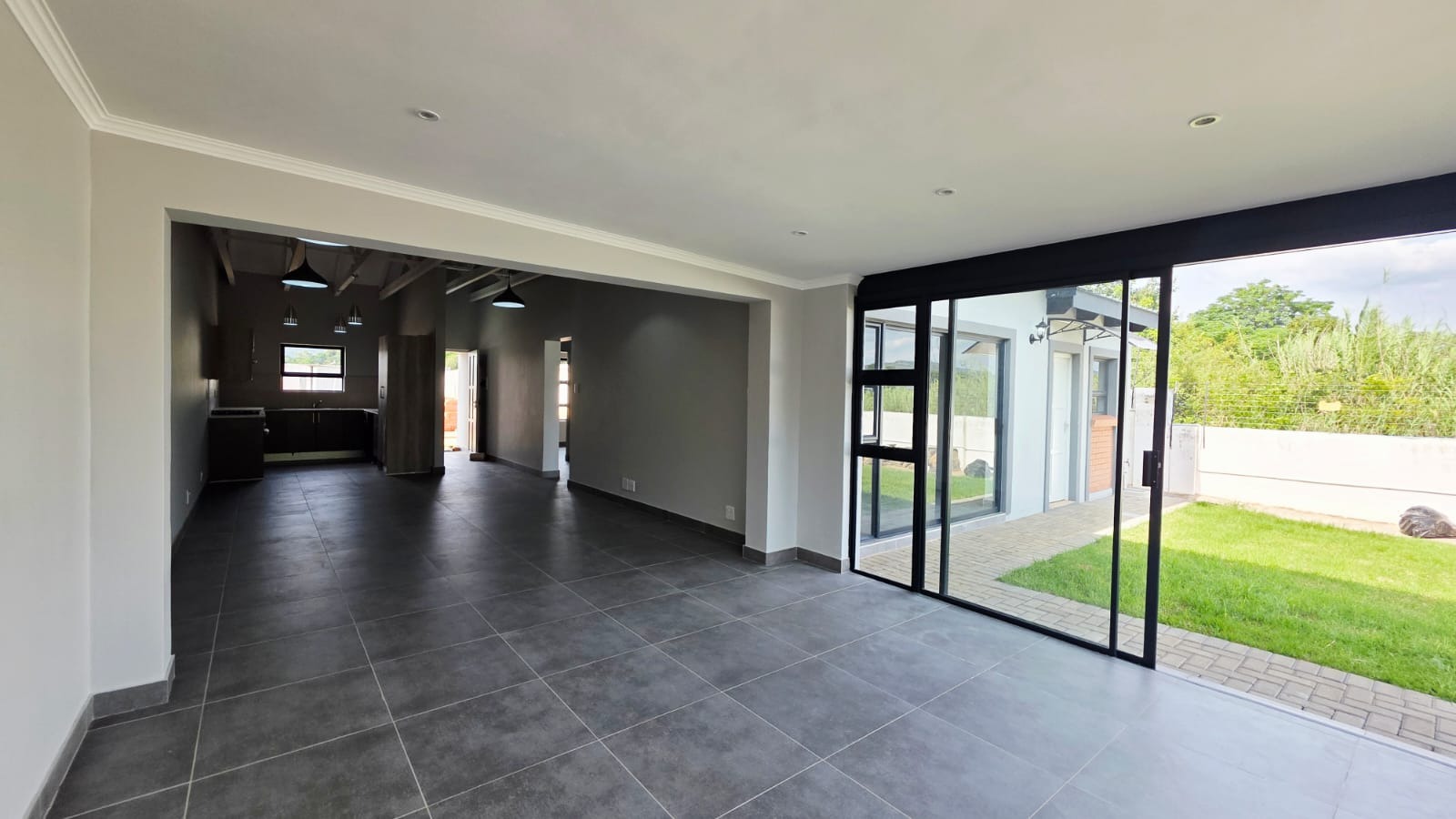 Living room with sliding door opens unto an open patio with built-in braai.