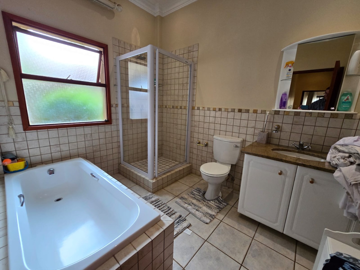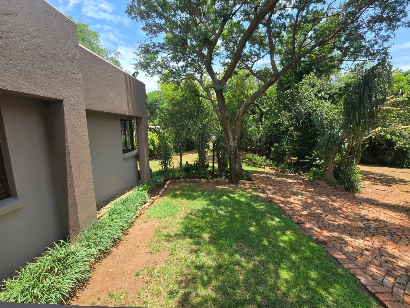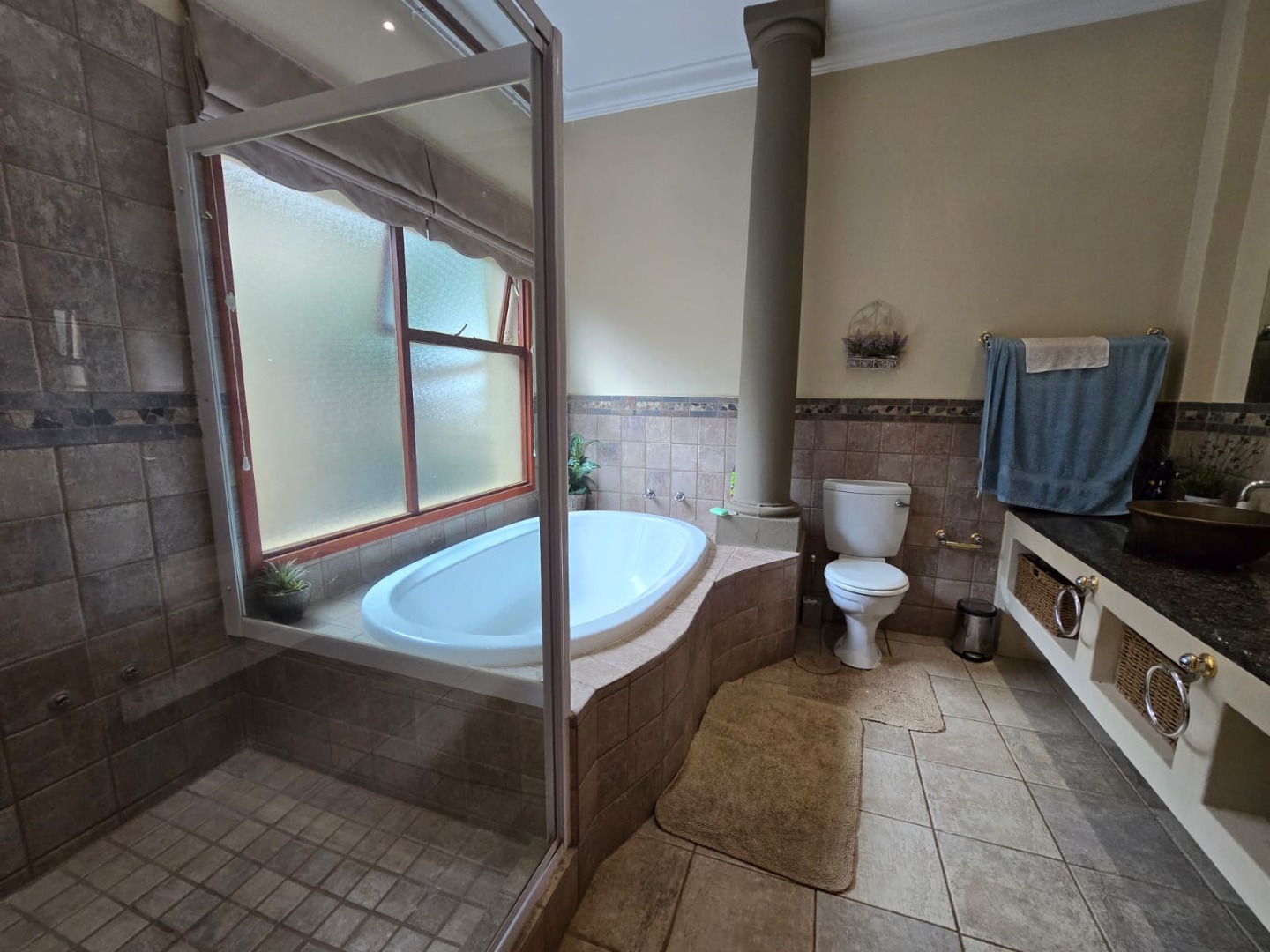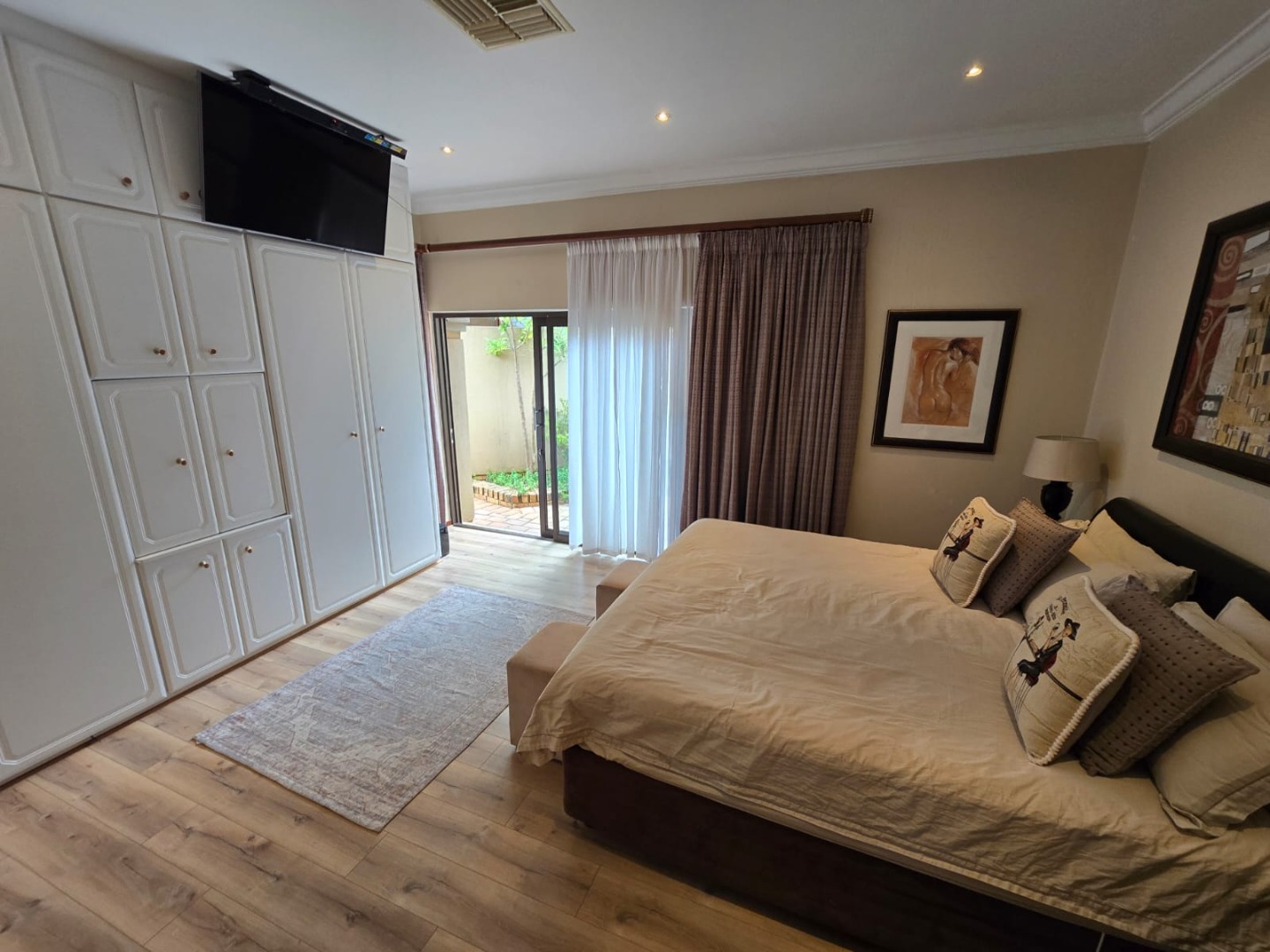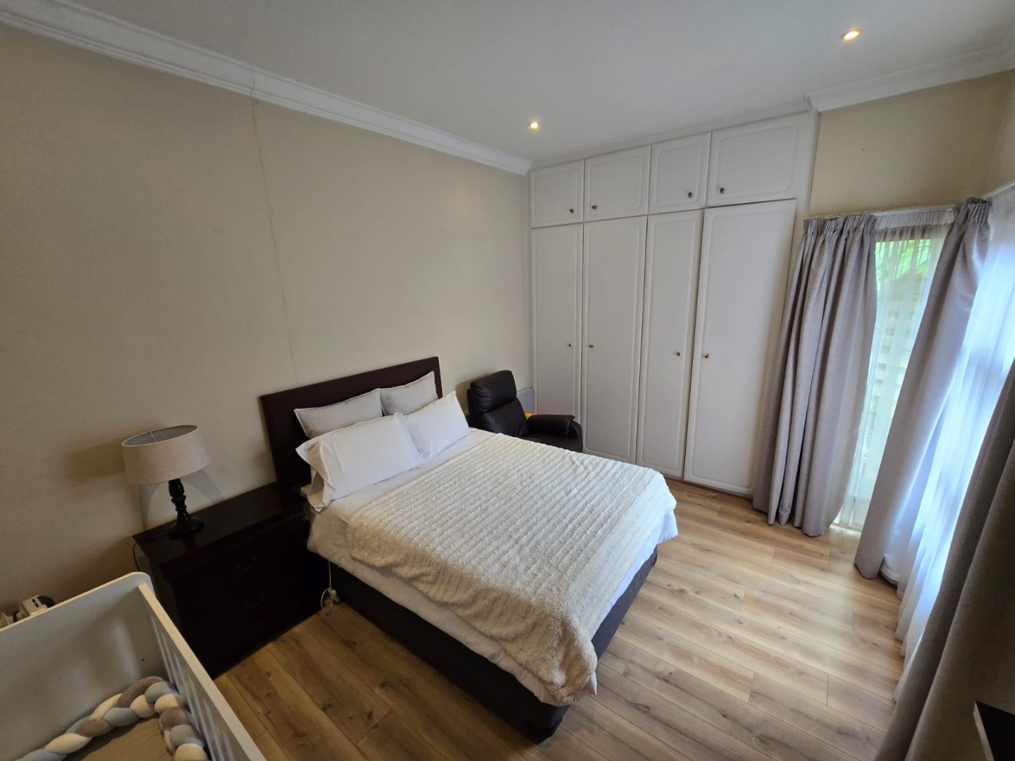 This residence offers three comfortable bedrooms and three bathrooms, including two private ensuites and a guest toilet. Step outside to a private swimming pool with a wooden deck, a covered patio featuring a built-in braai, and a lush, irrigated garden. These outdoor spaces provide an ideal setting for relaxation and entertaining, all while enjoying scenic views of the golf course.