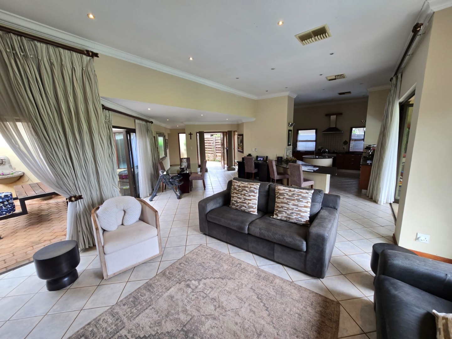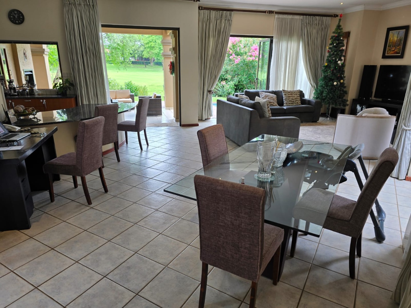 Discover exceptional golf estate living in this modern Mediterranean-style home, perfectly situated within the secure Pecanwood Estate in Hartbeespoort. The heart of this home is its spacious open-plan layout, where natural light illuminates the interconnected dining, lounge, and family TV room, all featuring durable tiled flooring. The modern kitchen is well-appointed with stainless steel appliances, wooden cabinetry, granite countertops, a central island with a sink, and a convenient pantry. Large glass doors seamlessly connect these living areas to the outdoors.