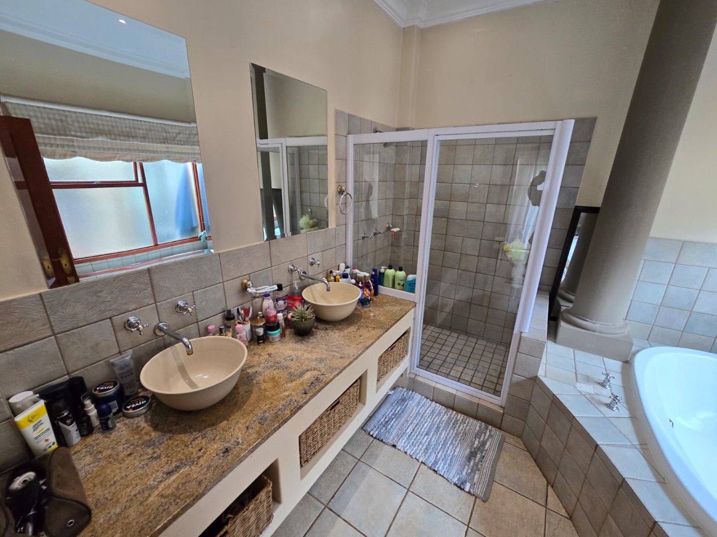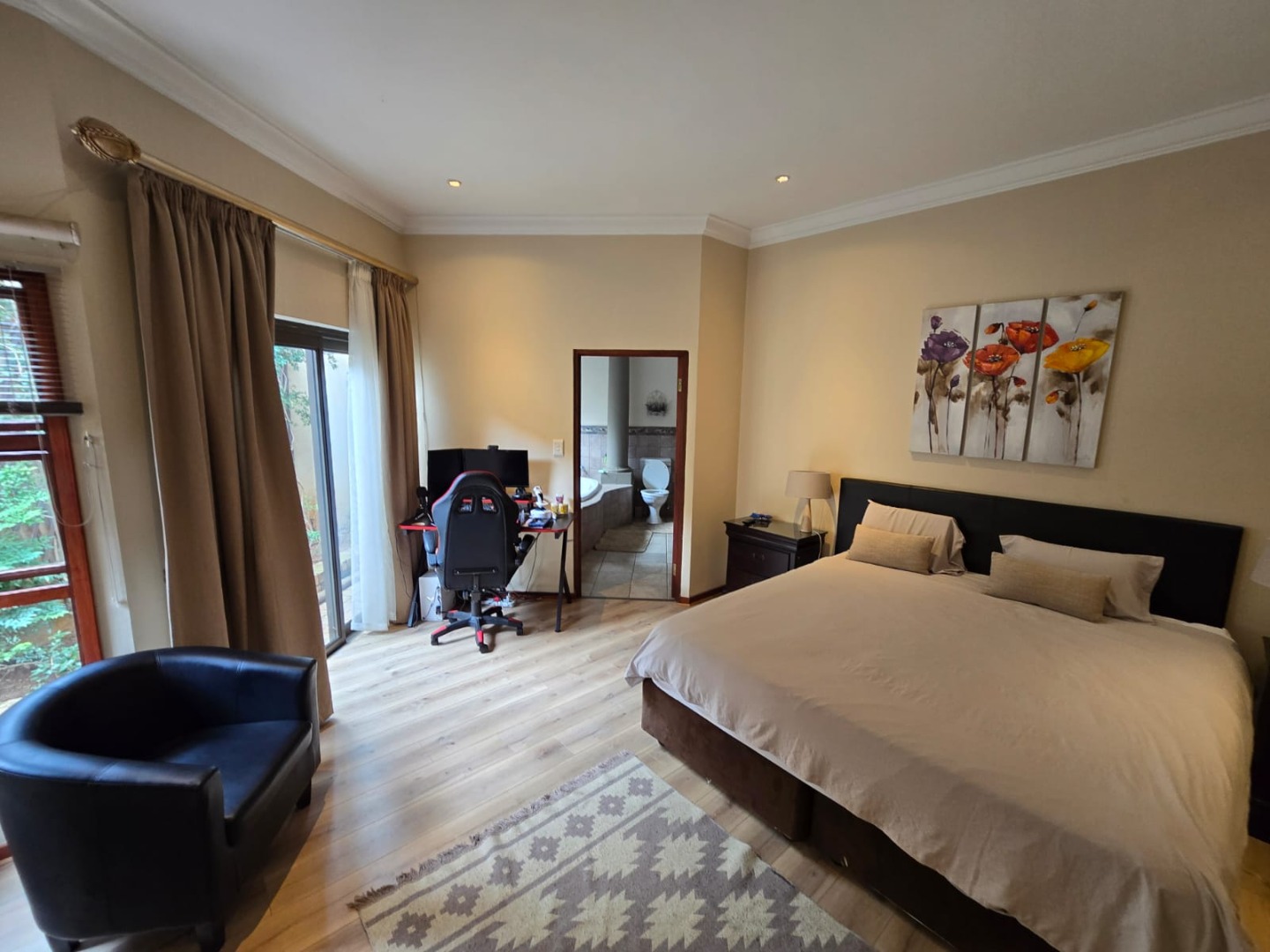 This residence offers three comfortable bedrooms and three bathrooms, including two private ensuites and a guest toilet. Step outside to a private swimming pool with a wooden deck, a covered patio featuring a built-in braai, and a lush, irrigated garden. These outdoor spaces provide an ideal setting for relaxation and entertaining, all while enjoying scenic views of the golf course.