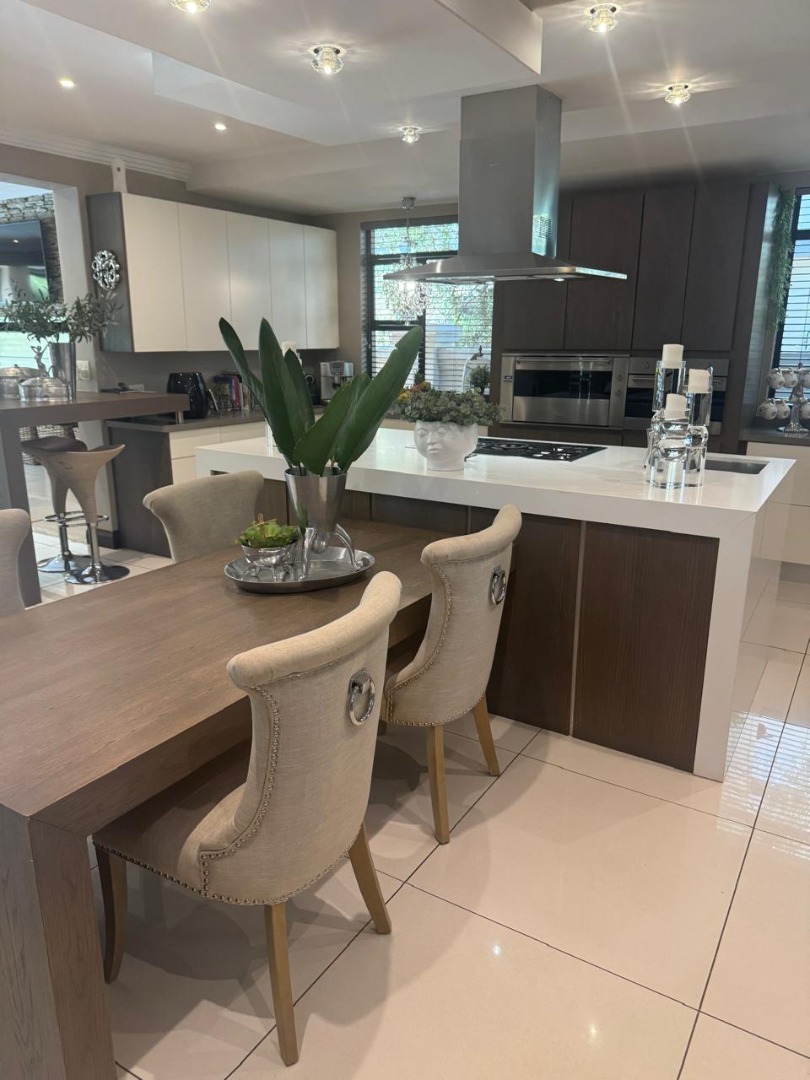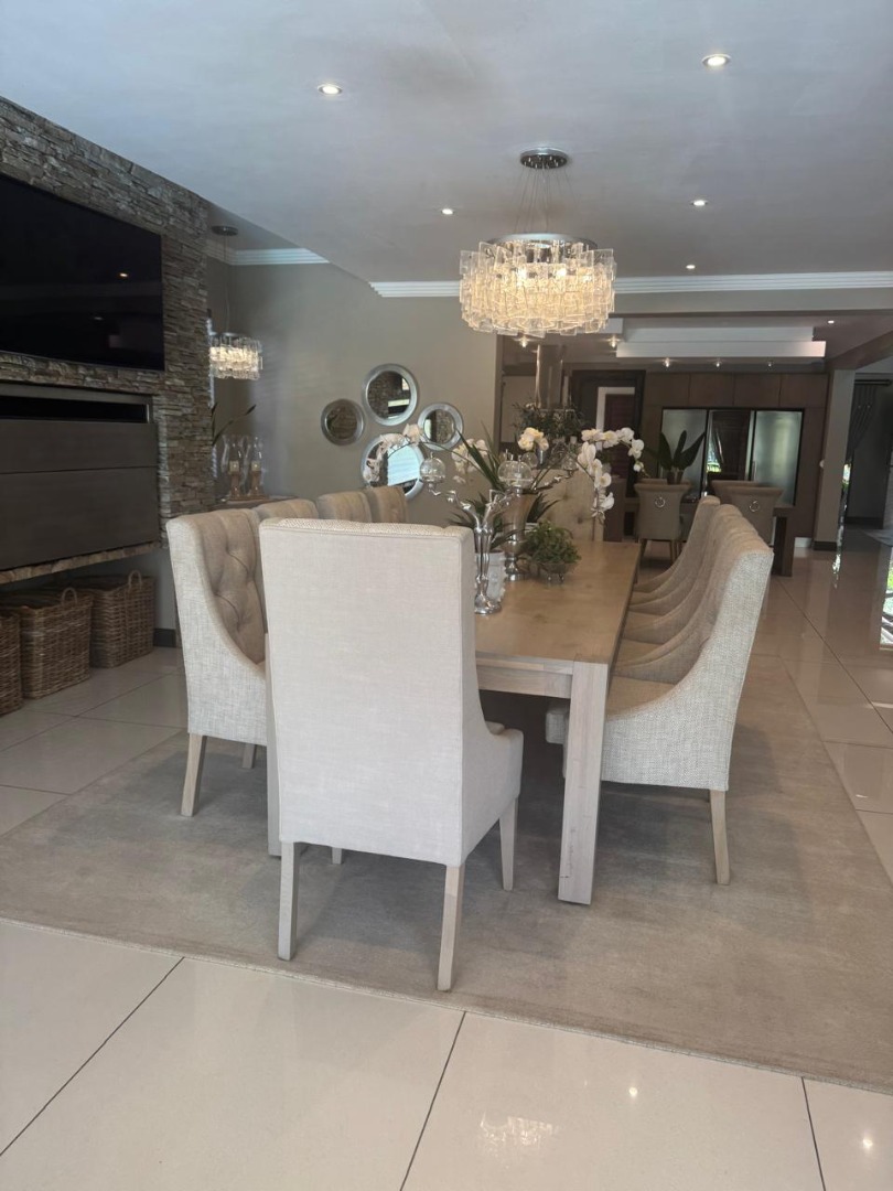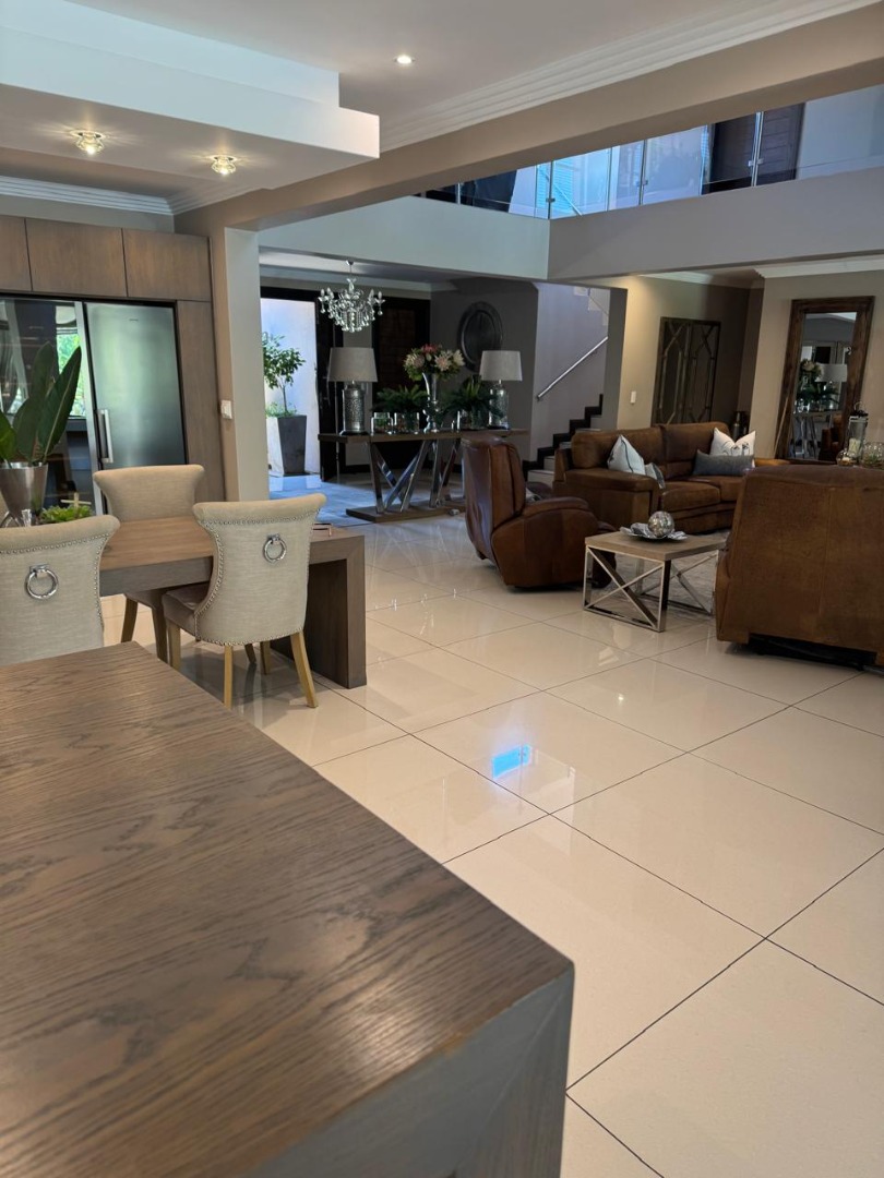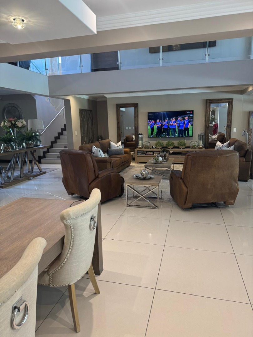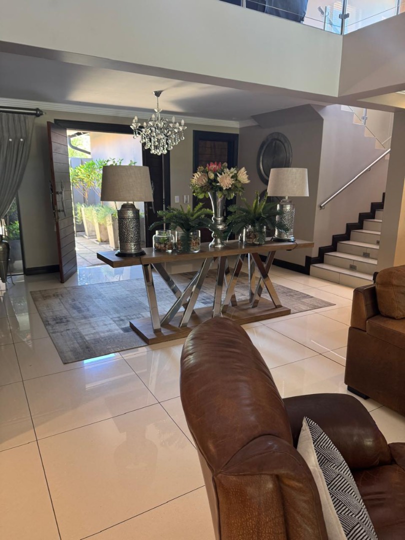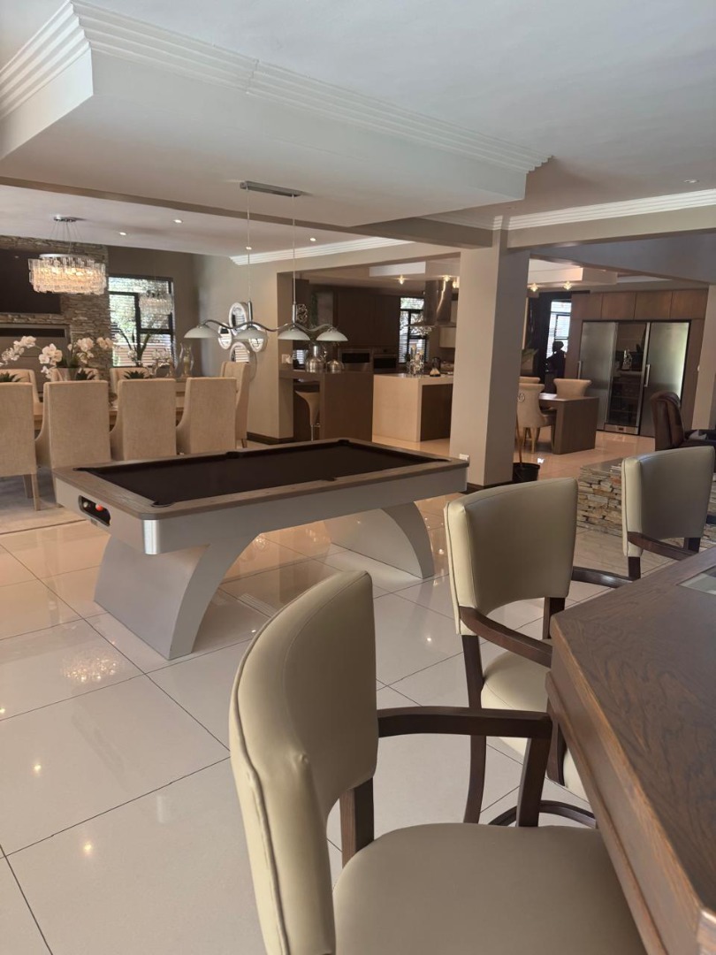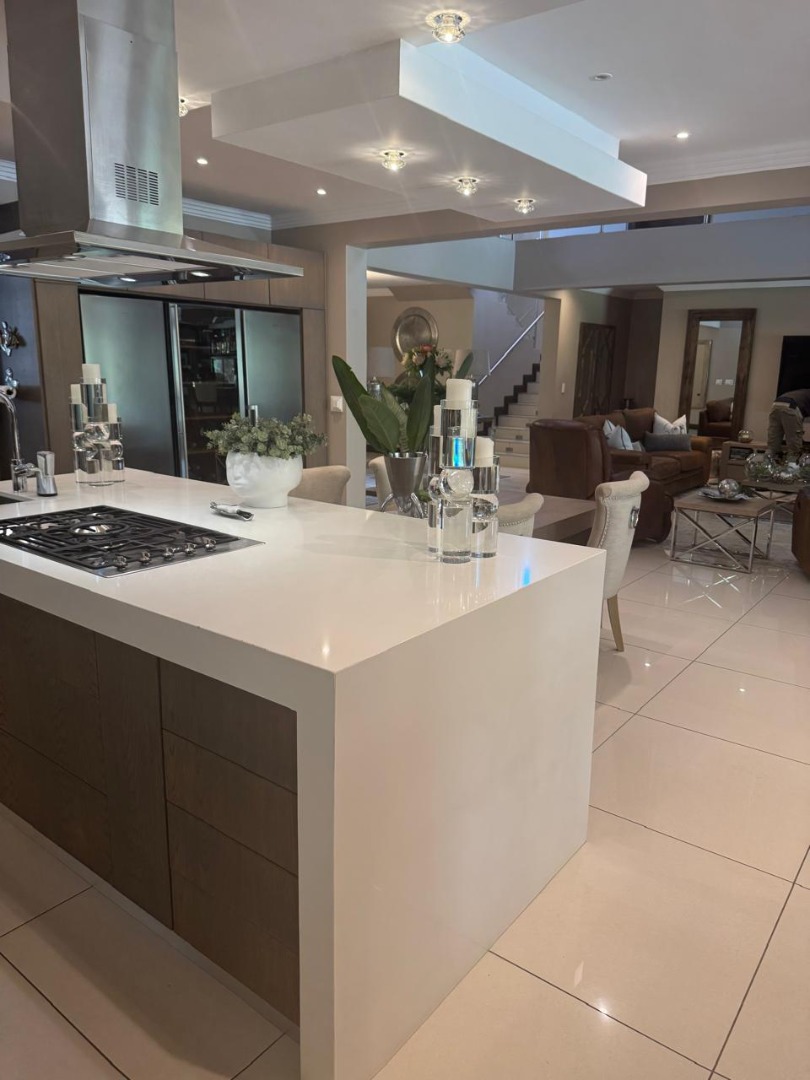 Step through the grand double-volume entrance into light-filled open spaces featuring designer bulkhead ceilings, premium finishes, and ambient lighting. The gourmet kitchen, fitted with top-quality appliances and a scullery, connects effortlessly to the dining room, lounge, bar, and entertainment areas — ideal for stylish hosting.