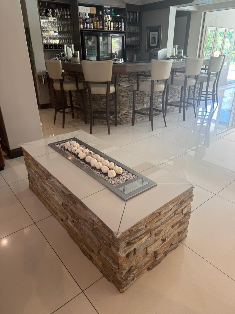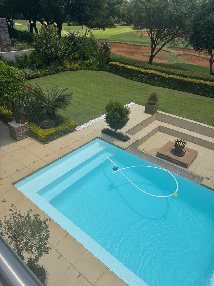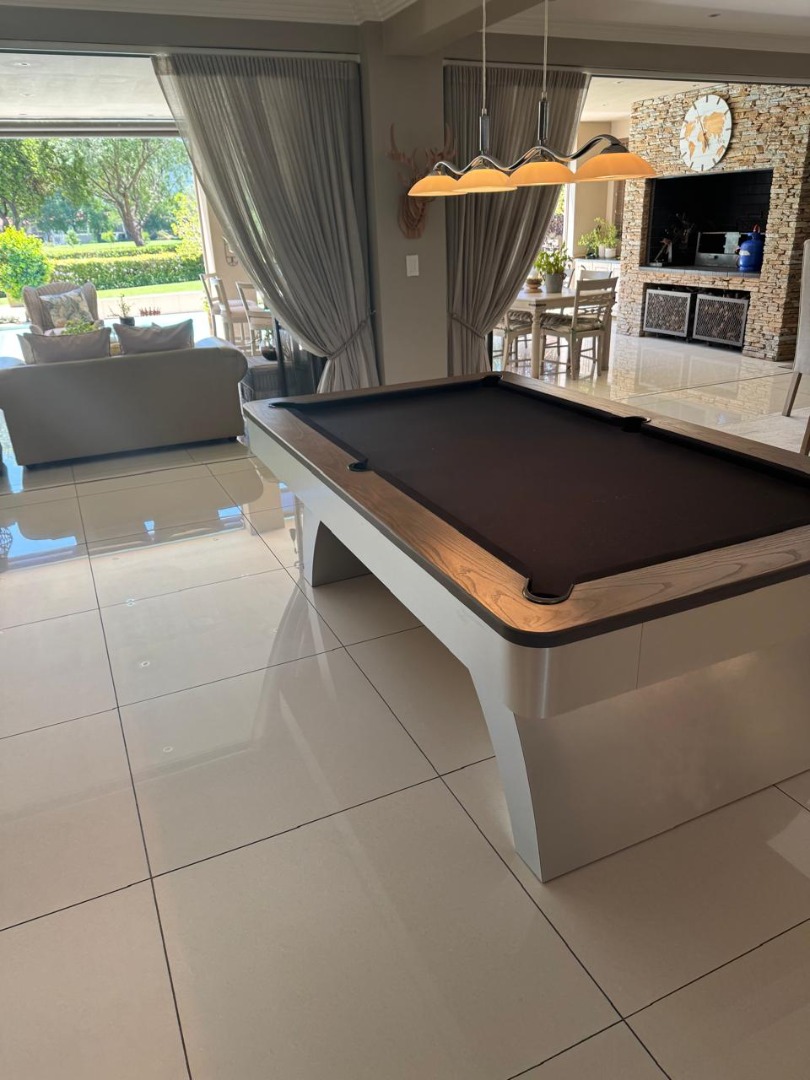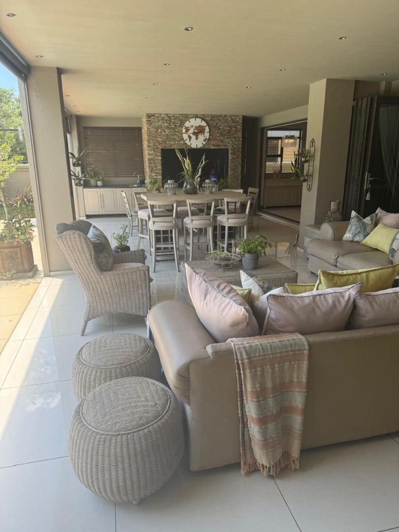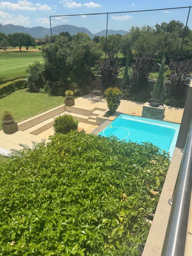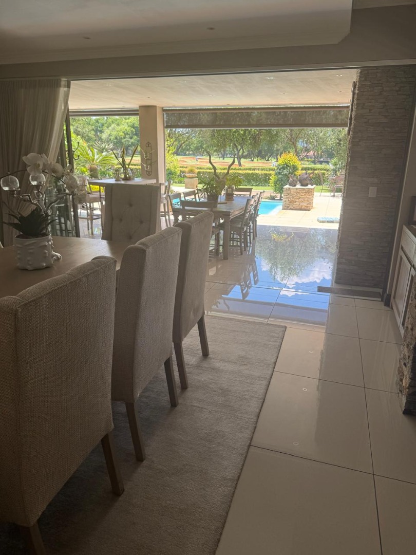 Glass doors open onto a large covered patio overlooking a sparkling overflow pool, sunken boma, and manicured garden, all framed by panoramic views of the Magalies Mountains and 18th fairway — an entertainer’s dream setting with both indoor gas and outdoor wood braai options.