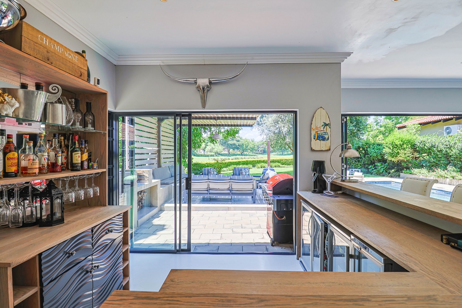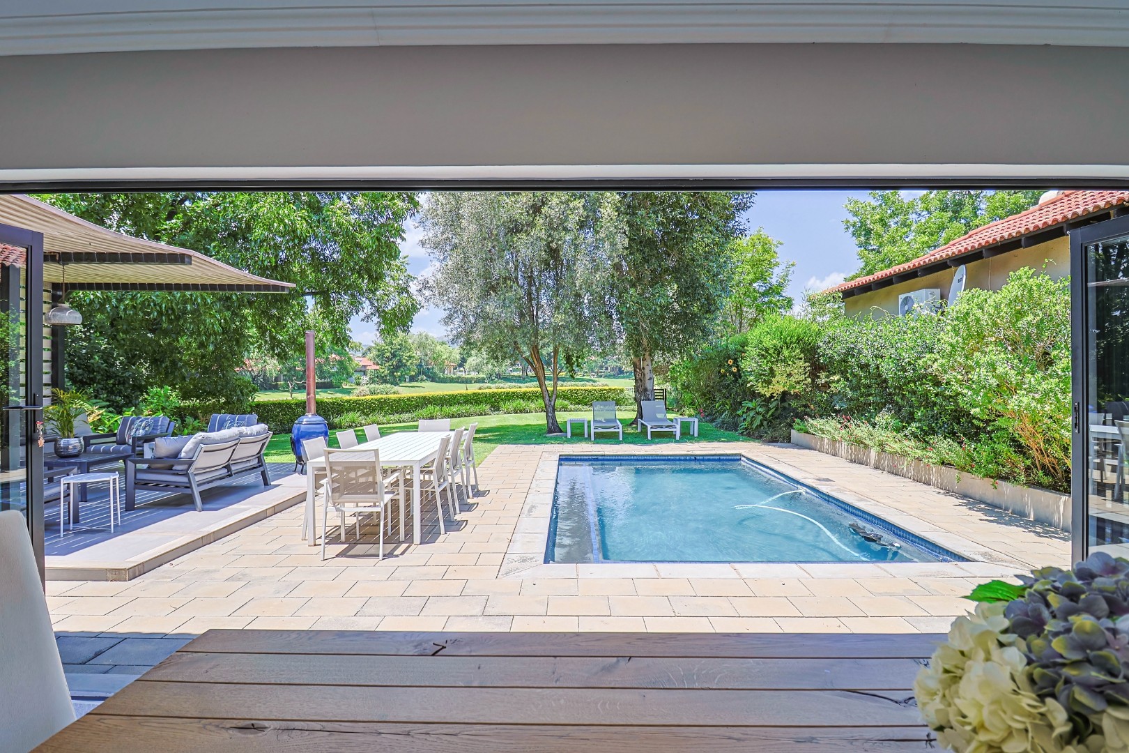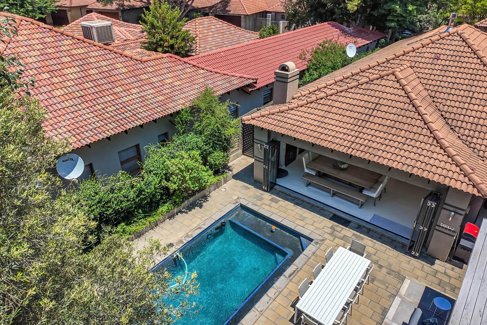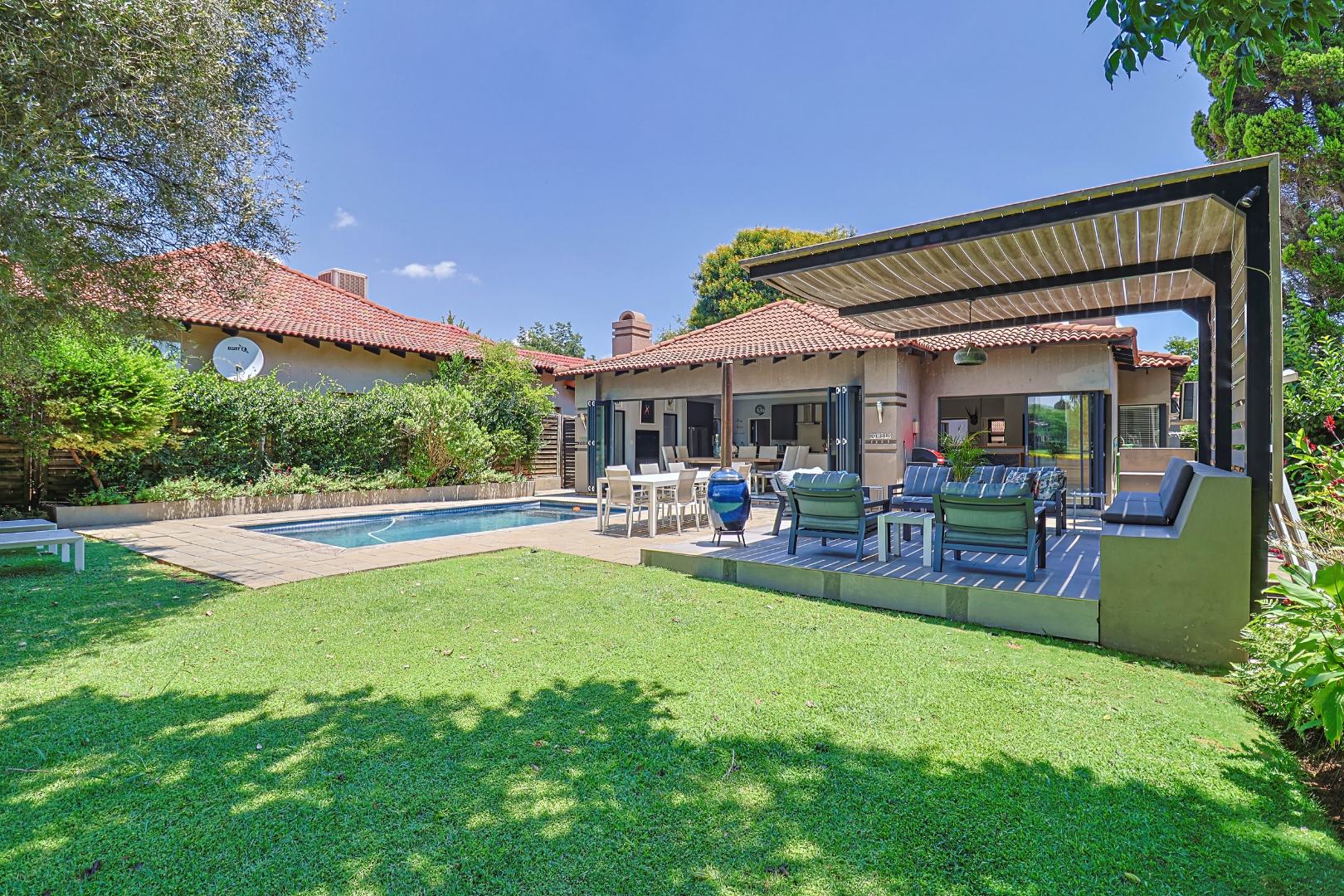 Nestled within the prestigious Pecanwood Estate in Hartbeespoort, this exquisite 4-bedroom, 4.5-bathroom home offers an exceptional lifestyle in a secure, family-friendly golf estate. Renowned for its championship golf course and tranquil surroundings, Pecanwood combines estate living with easy access to nearby amenities. The residence spans a generous 294 sqm and features an open-plan design that seamlessly connects the modern kitchen, dining area, and lounge. The kitchen includes a pantry, while a wet bar and cosy fireplace elevate the home’s entertainment appeal. Large bi-fold doors open onto a spacious covered patio, creating a seamless indoor-outdoor flow.