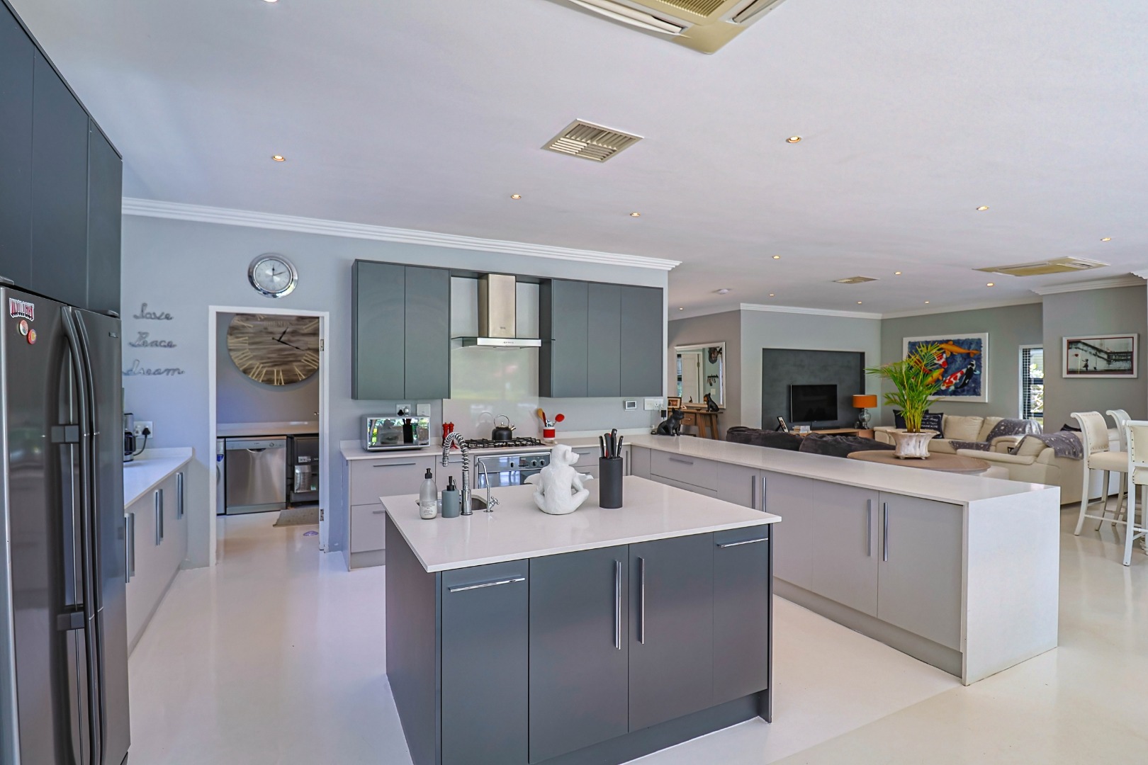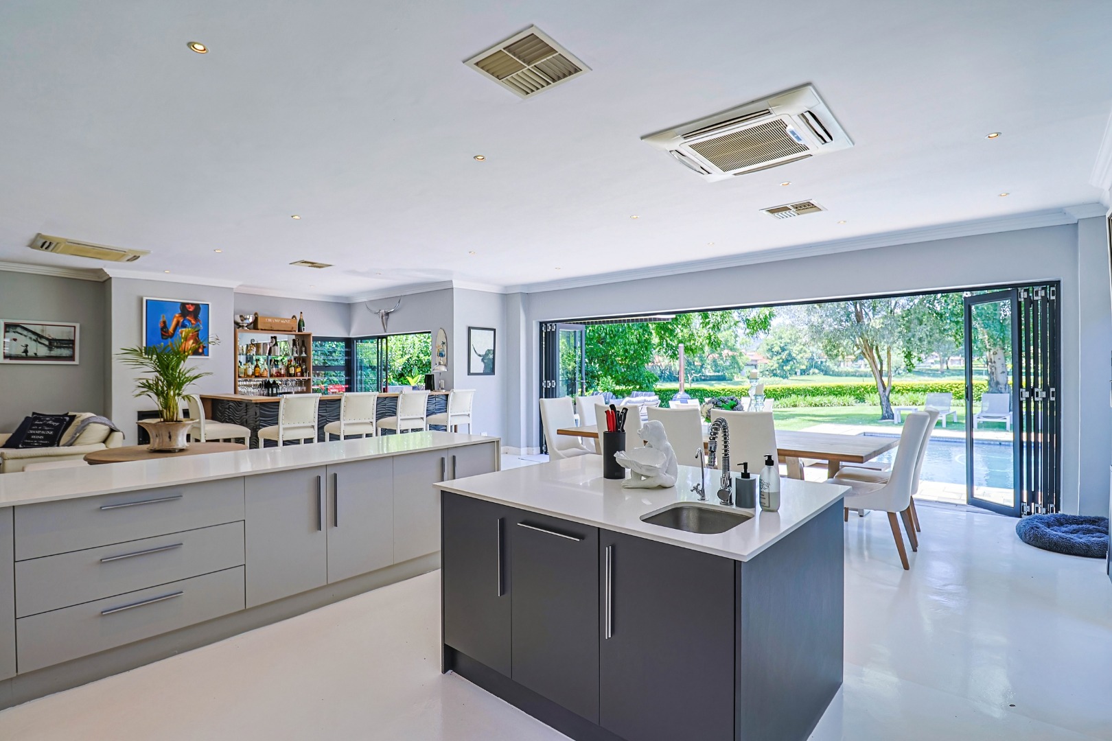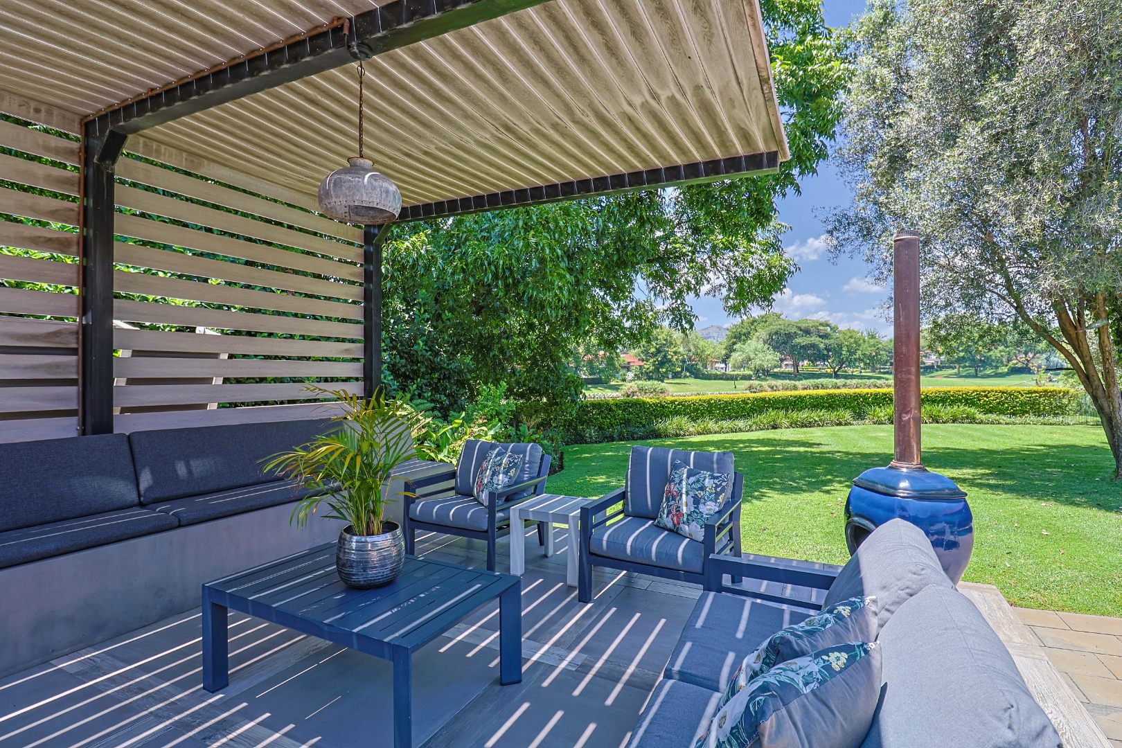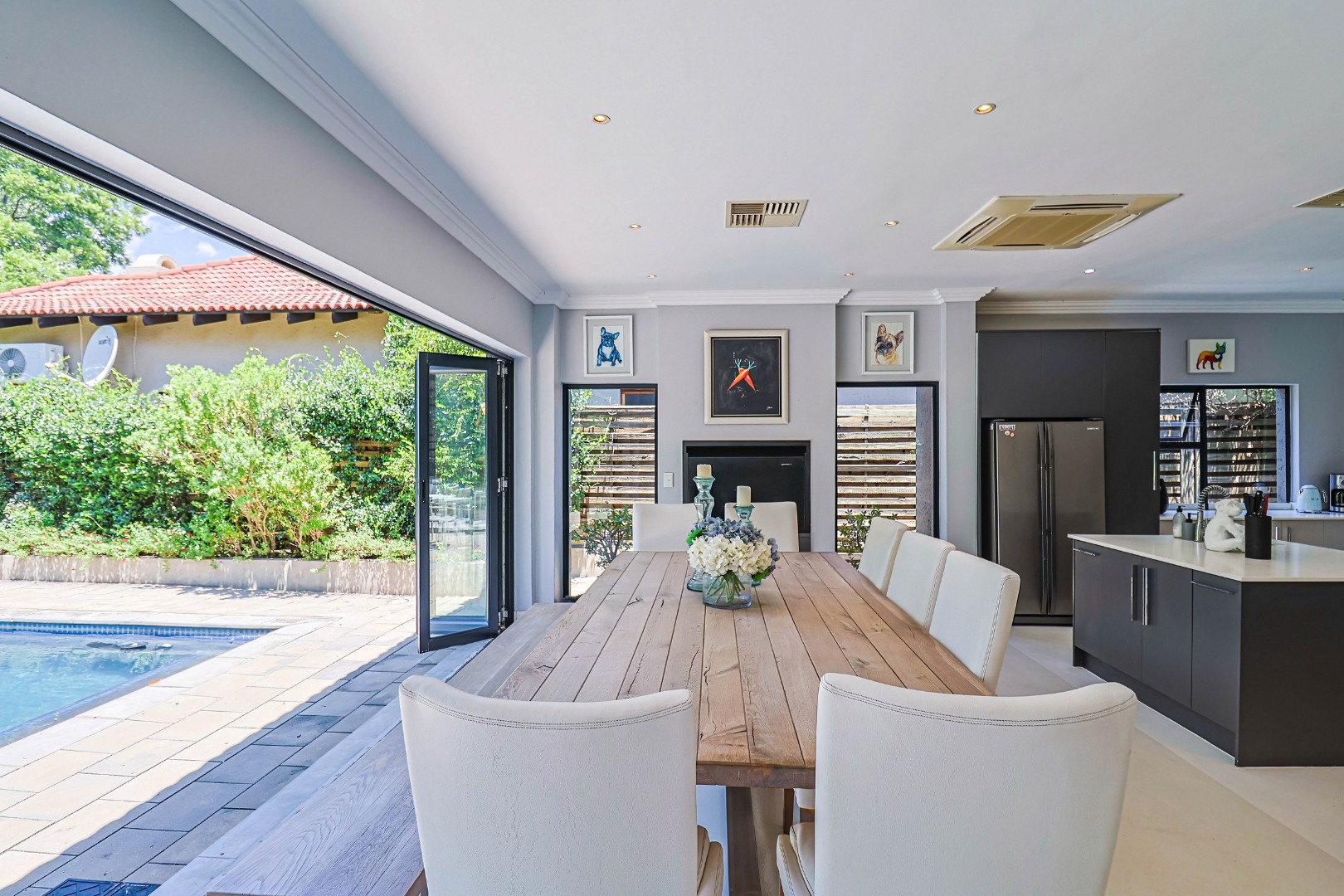 Nestled within the prestigious Pecanwood Estate in Hartbeespoort, this exquisite 4-bedroom, 4.5-bathroom home offers an exceptional lifestyle in a secure, family-friendly golf estate. Renowned for its championship golf course and tranquil surroundings, Pecanwood combines estate living with easy access to nearby amenities. The residence spans a generous 294 sqm and features an open-plan design that seamlessly connects the modern kitchen, dining area, and lounge. The kitchen includes a pantry, while a wet bar and cosy fireplace elevate the home’s entertainment appeal. Large bi-fold doors open onto a spacious covered patio, creating a seamless indoor-outdoor flow.