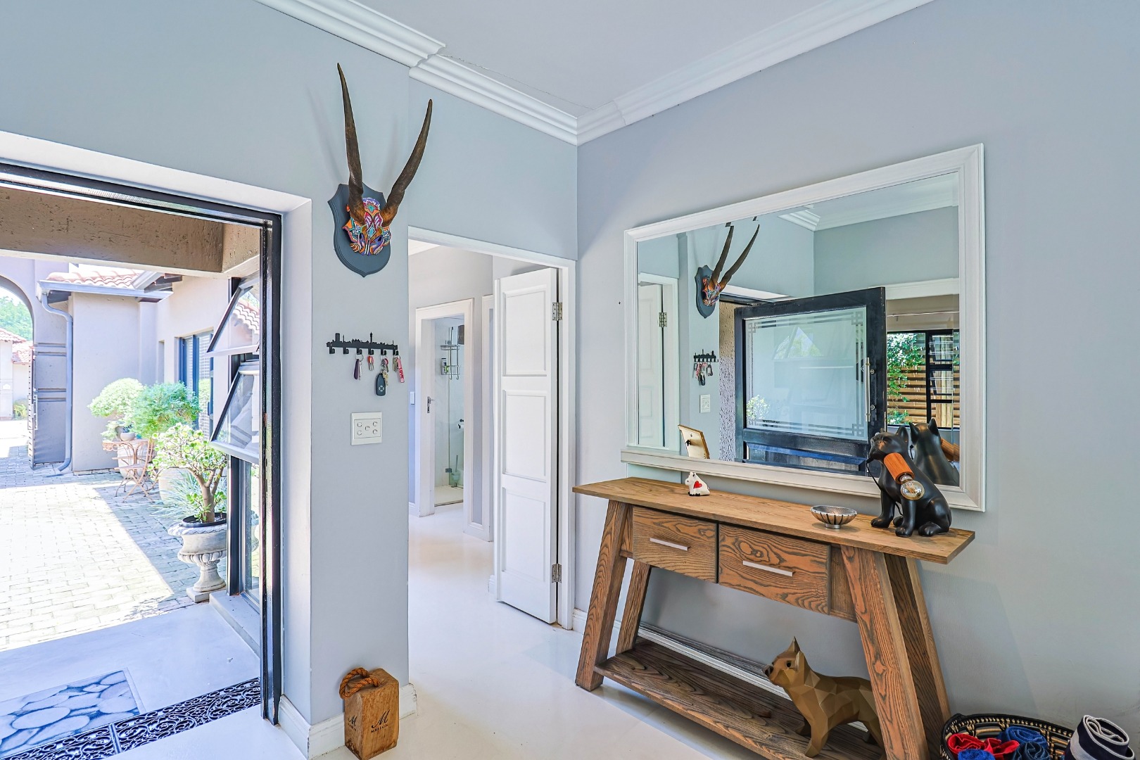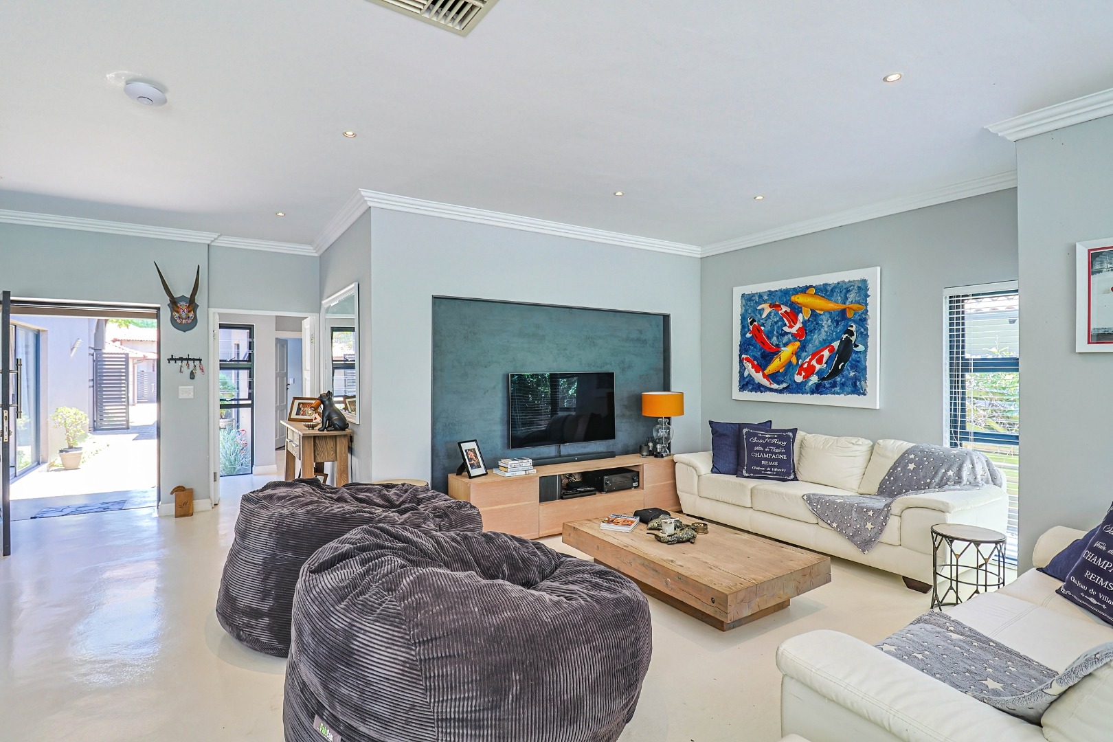 All four bedrooms are well-sized, with three offering private en-suite bathrooms, complemented by a guest toilet. Designed with comfort and accessibility in mind, the home includes air conditioning throughout and is wheelchair friendly. Outdoor living is a standout feature, with a sparkling swimming pool, manicured garden with irrigation, and ample paved areas for entertaining. Additional highlights include a double garage, scenic views, 24-hour estate security, fibre connectivity, solar panels, and a battery inverter. Pets are welcome, making this an ideal family home that blends luxury, practicality, and modern convenience.