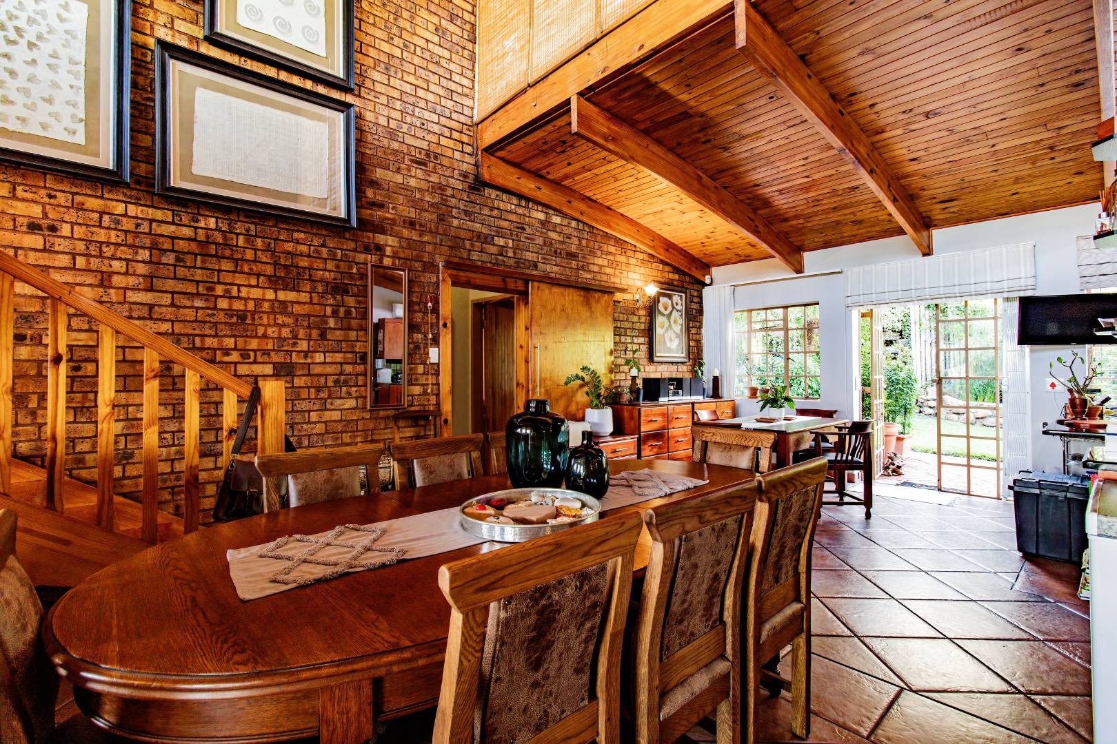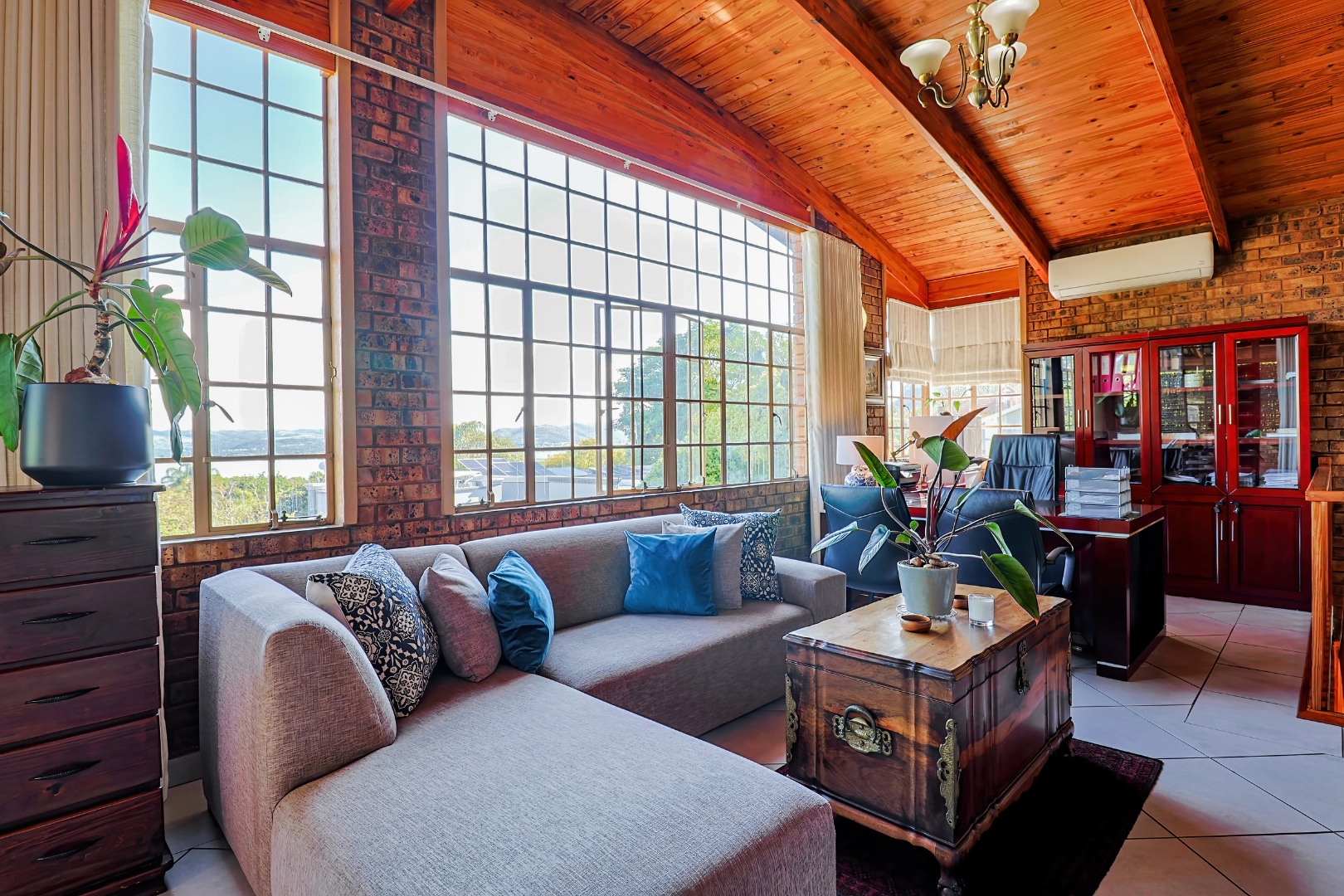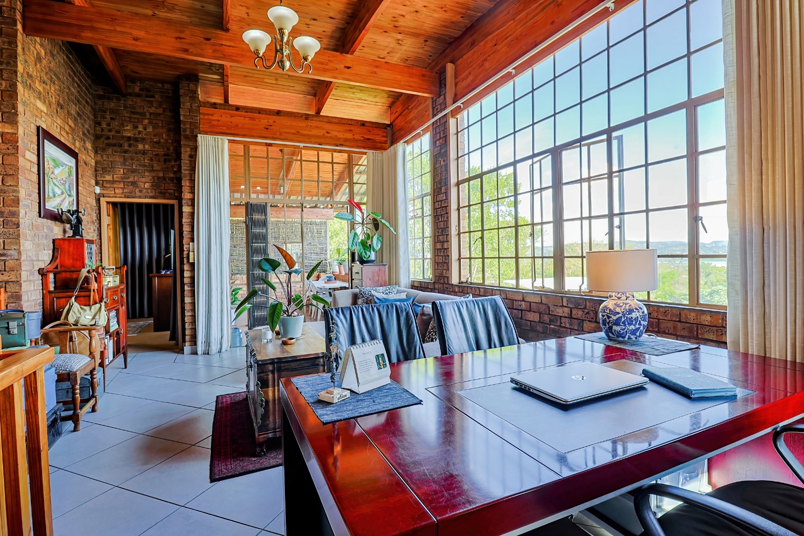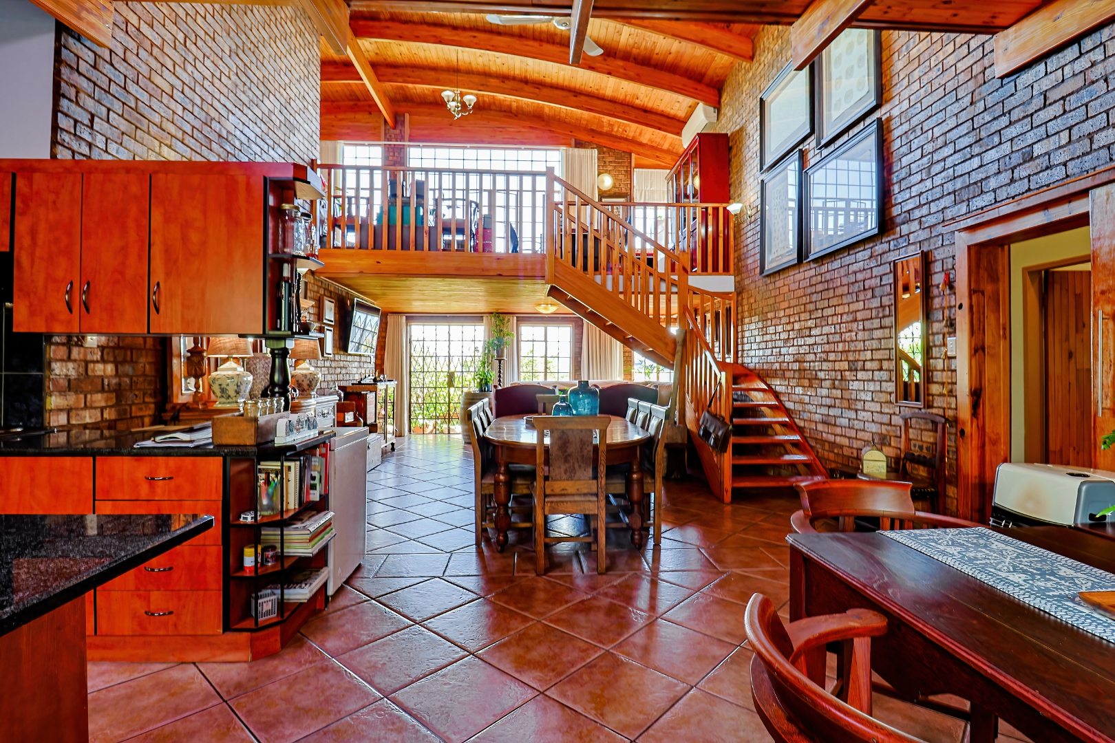The home features a spacious double-volume living and dining area with exposed brickwork, wooden beams, and large steel-framed windows that flood the space with natural light. A mezzanine level adds flexibility and character, ideal as a study or additional living area.