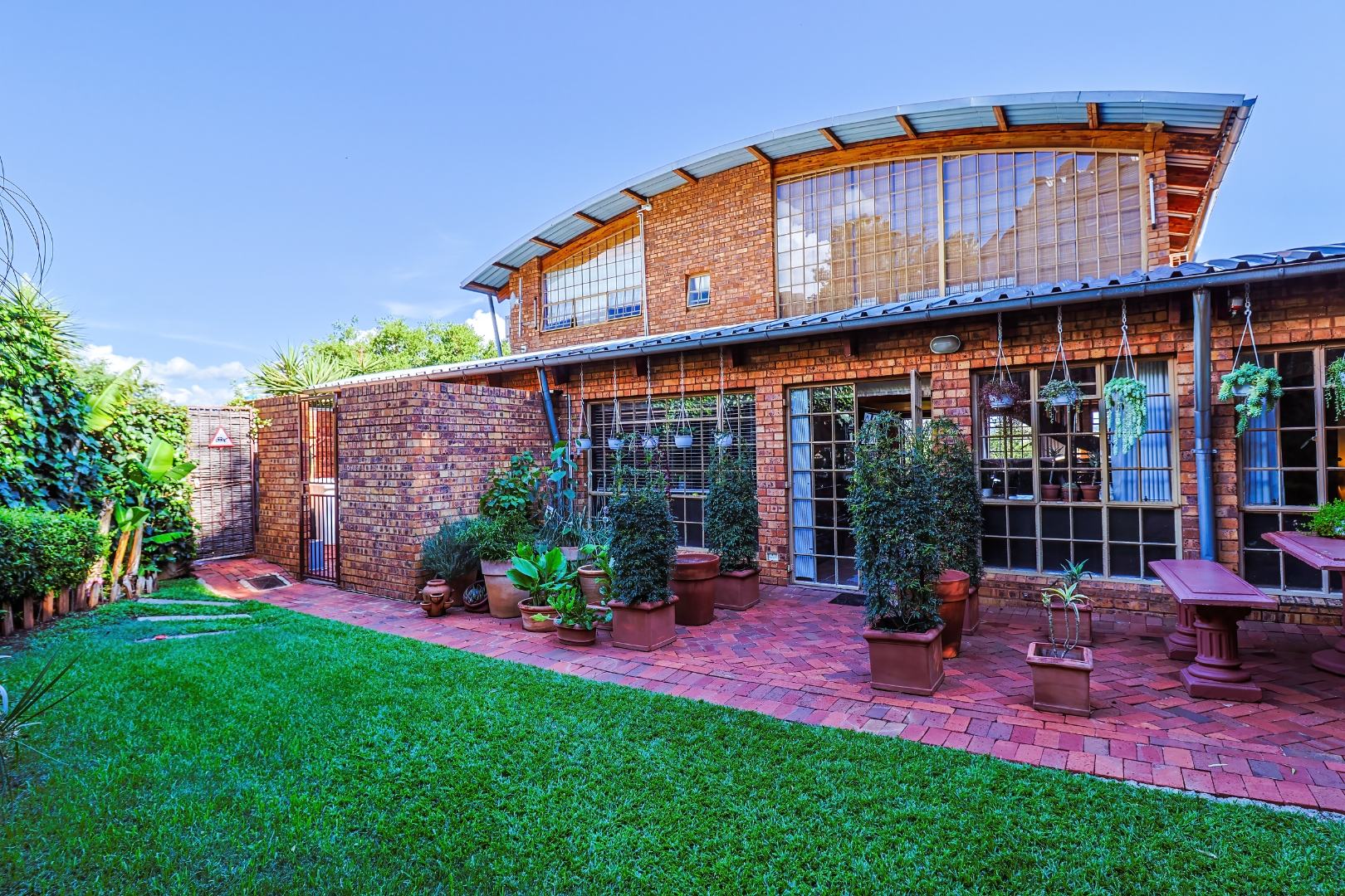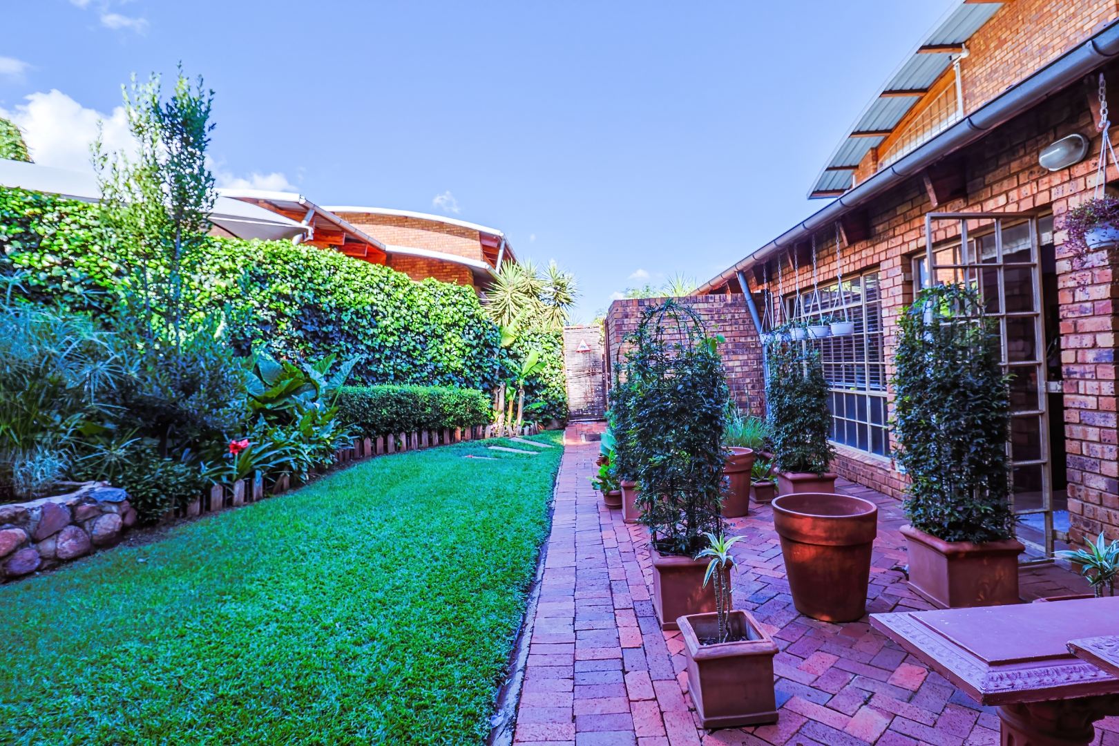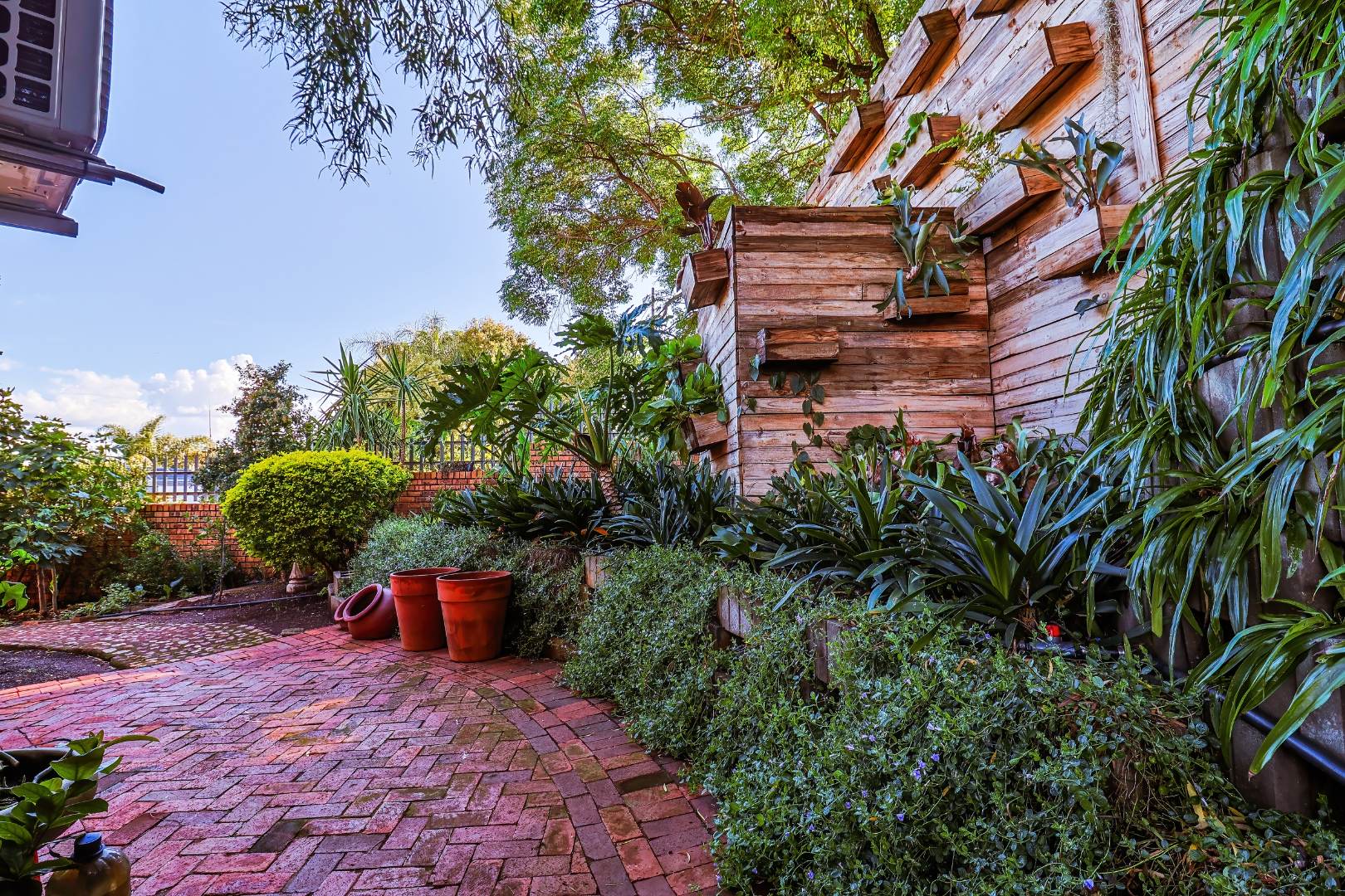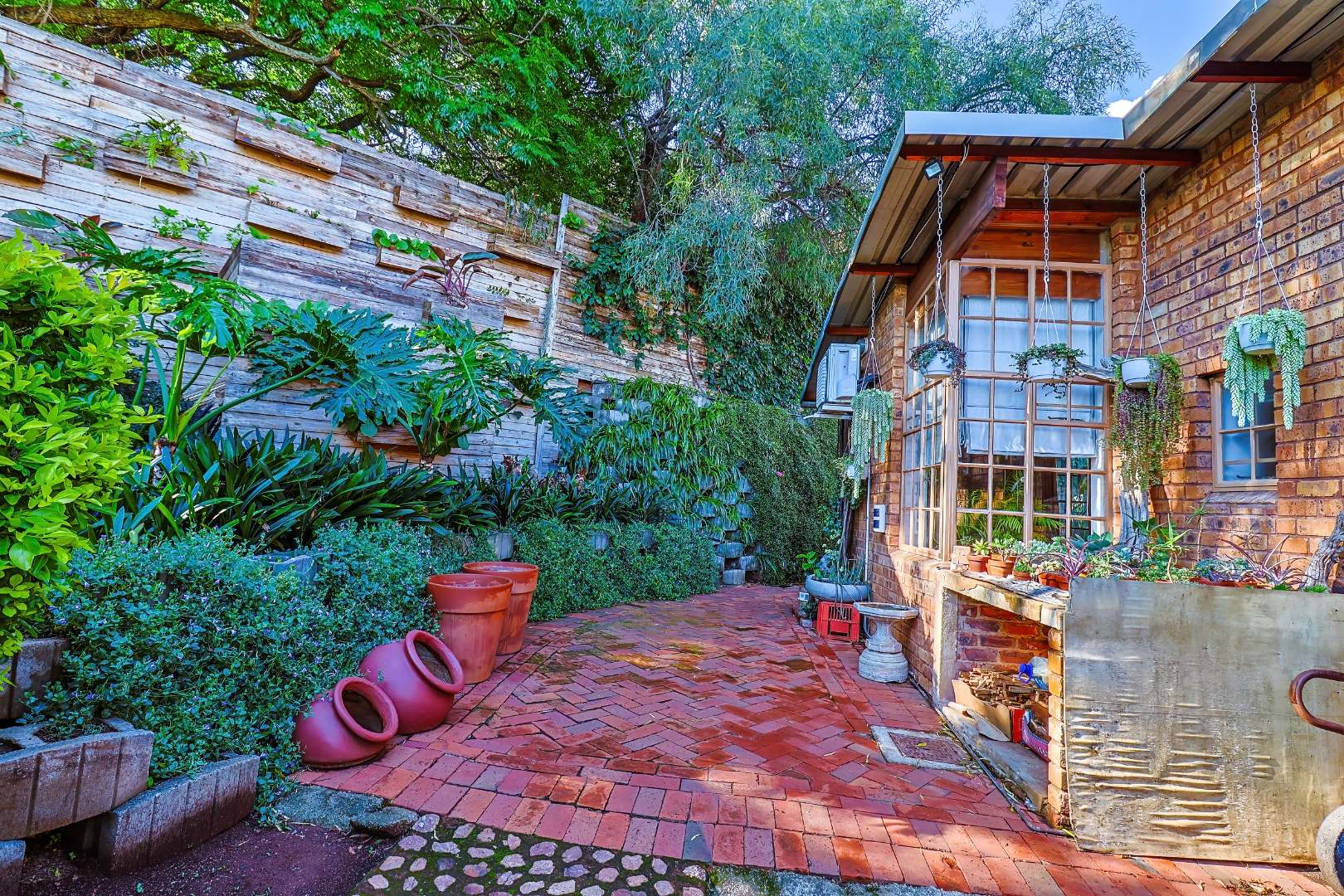 Outdoor living includes a covered patio, paved courtyard, and a well-maintained garden, ideal for relaxing or entertaining.