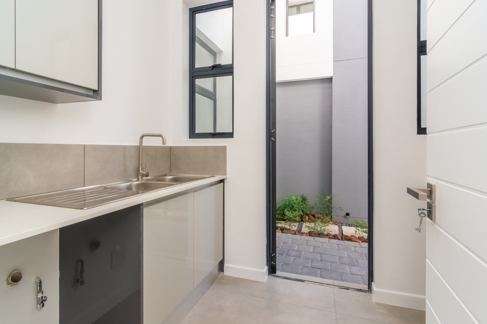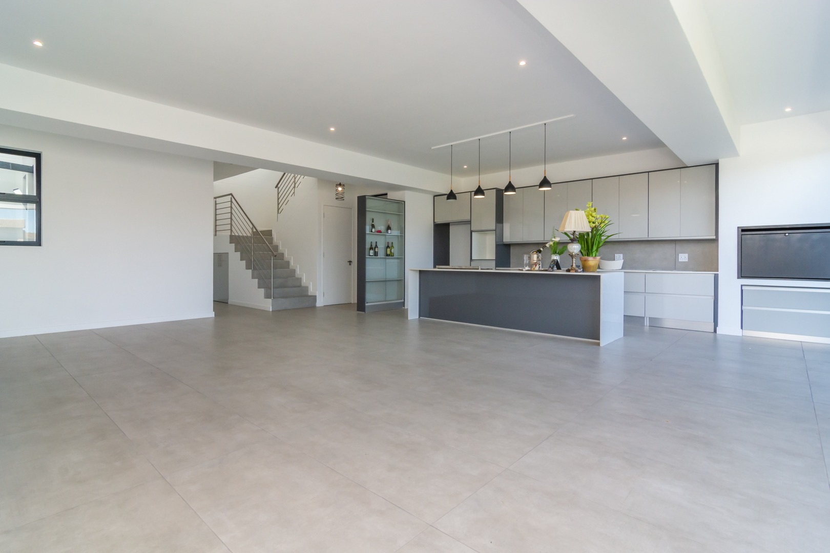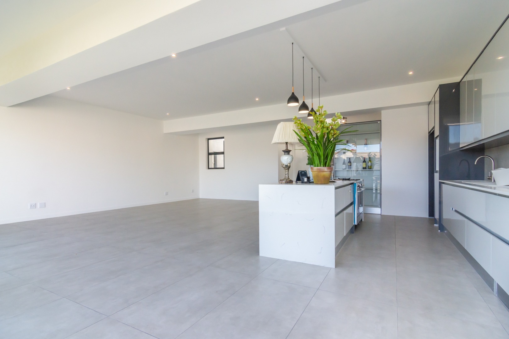 Open plan, high gloss kitchen cabinetry in hues of grey, with separate scullery with place for under counter washing machine and dishwasher.