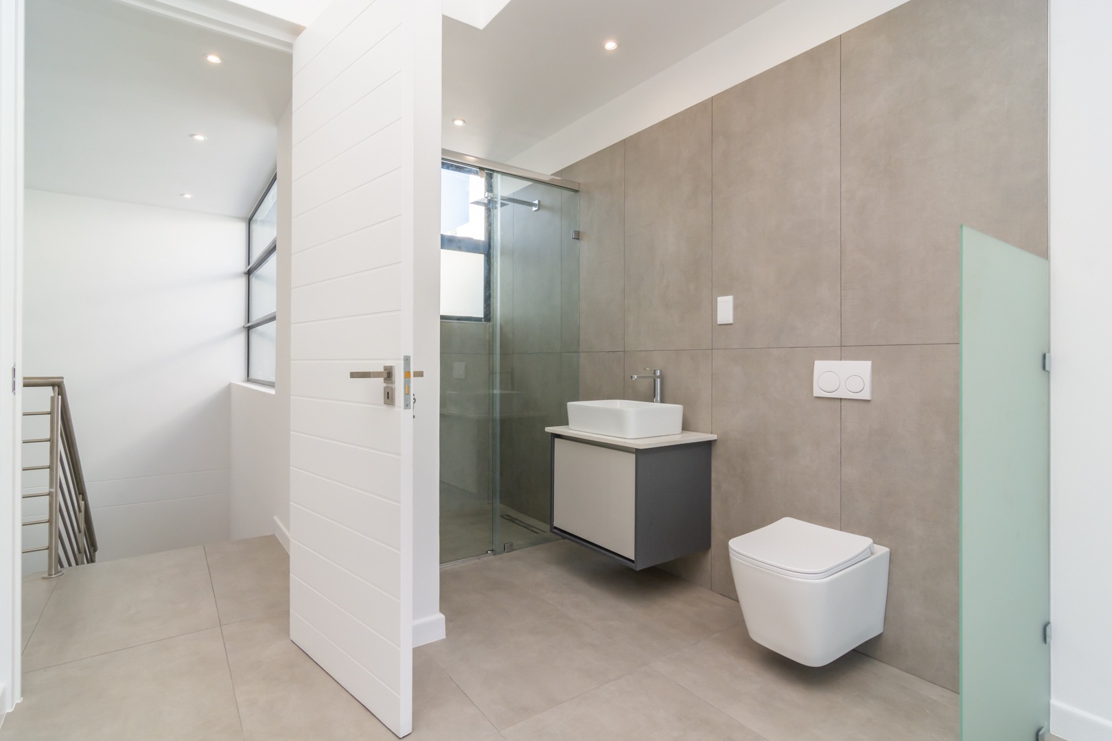 On trend with the very latest smoky-grey nonslip tiles throughout.